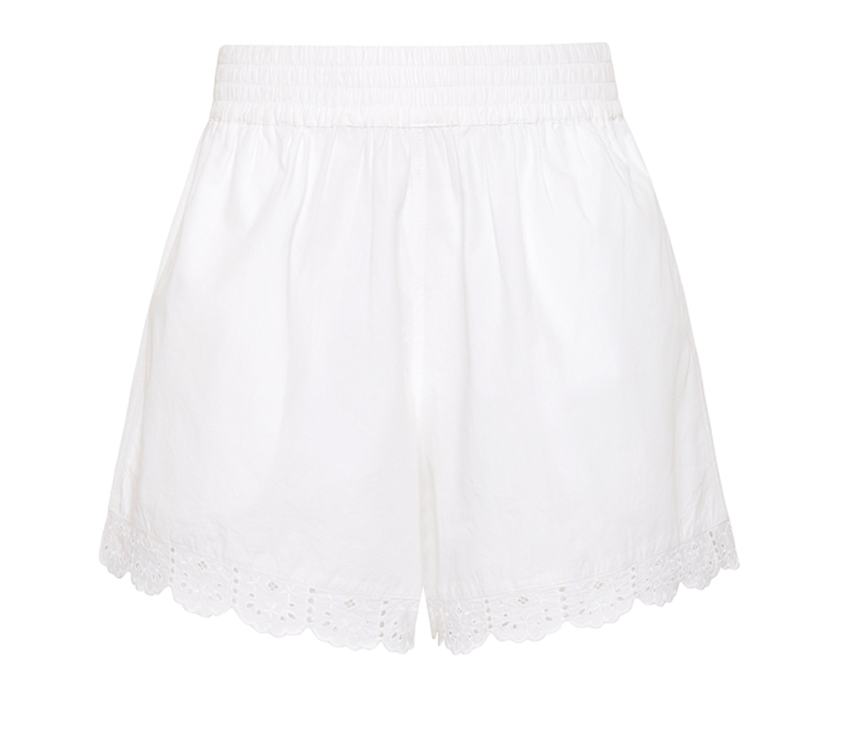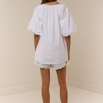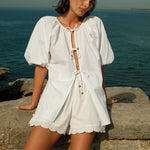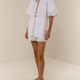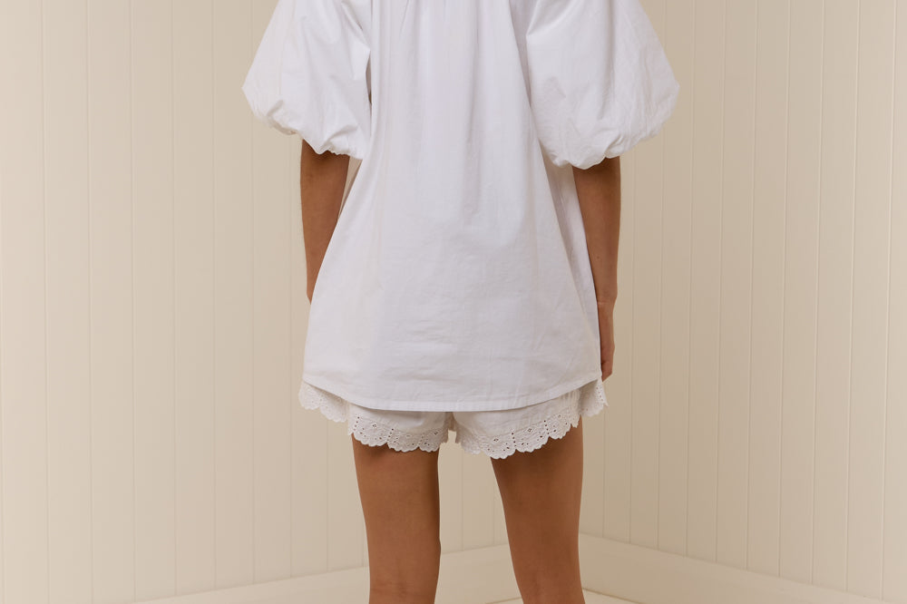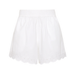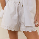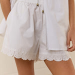 Introducing Palm Noosa's Olive Short in White, a high-waisted short. Designed with a fitted elasticated waist and relaxed leg, the shorts feature side pockets and a floral-lace scallop hem cut for an elevated touch. Pair with the Olive Tie Top in White for a coordinated two-piece set.