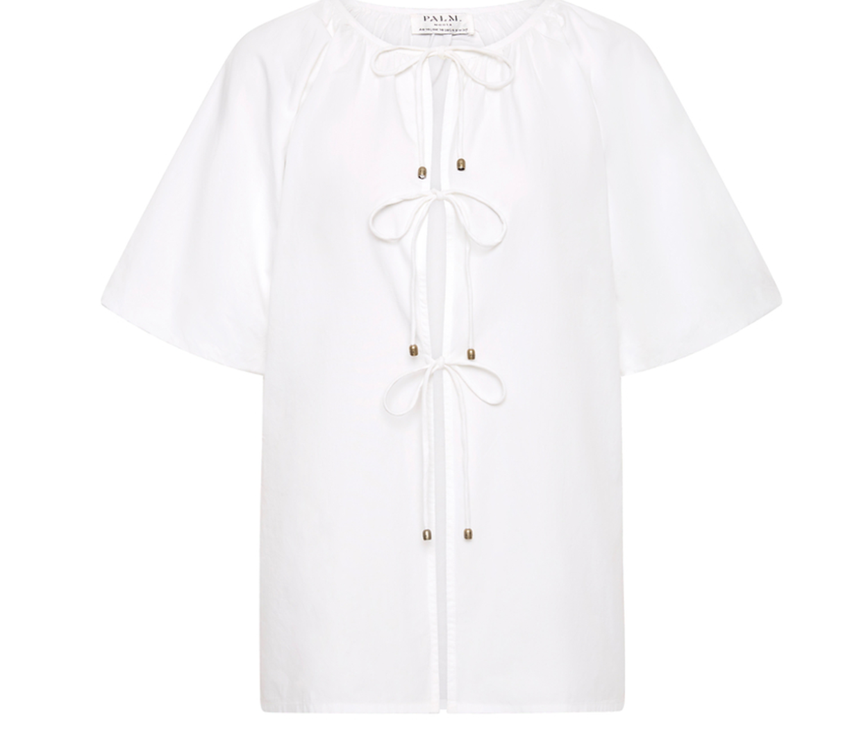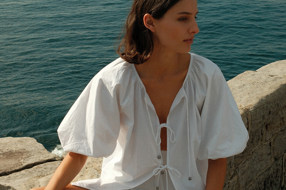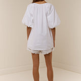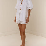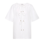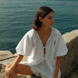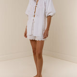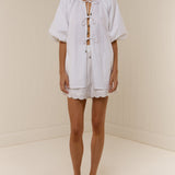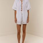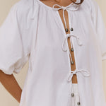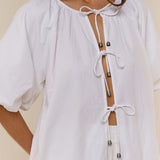 Introducing Doen's Olive Tie Top in White, a short puffed-sleeve self-tie blouse top. Crafted in a cotton poplin, the short-sleeve top features a crew neck and a front self tie closure. Hitting at the true waist, it pairs beautifully with high-waisted jeans and the Olive Tie Top in White for a coordinated two-piece set.