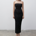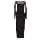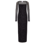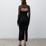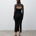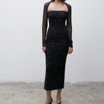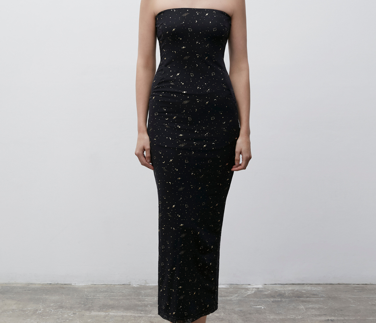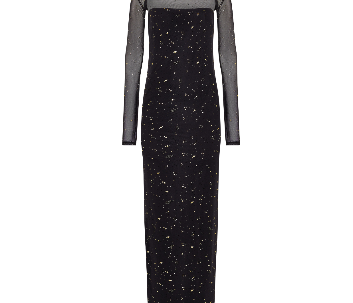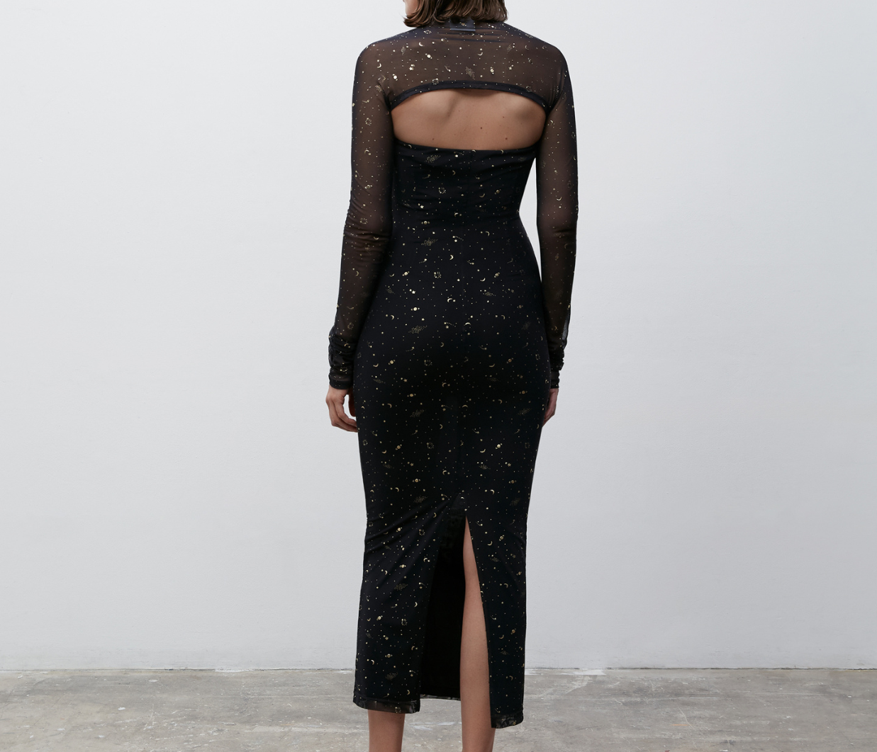 The Paris Georgia Galaxy Dress & Shrug in Black and Gold is a fully lined column dress with detailed gold stars and moons scattered across the fabric for a lustrous effect. The dress is designed with a strapless column, composed of a soft, sheer galaxy mesh with a versatile bolero shrug, to be worn as an accompaniment to the dress or worn separately.