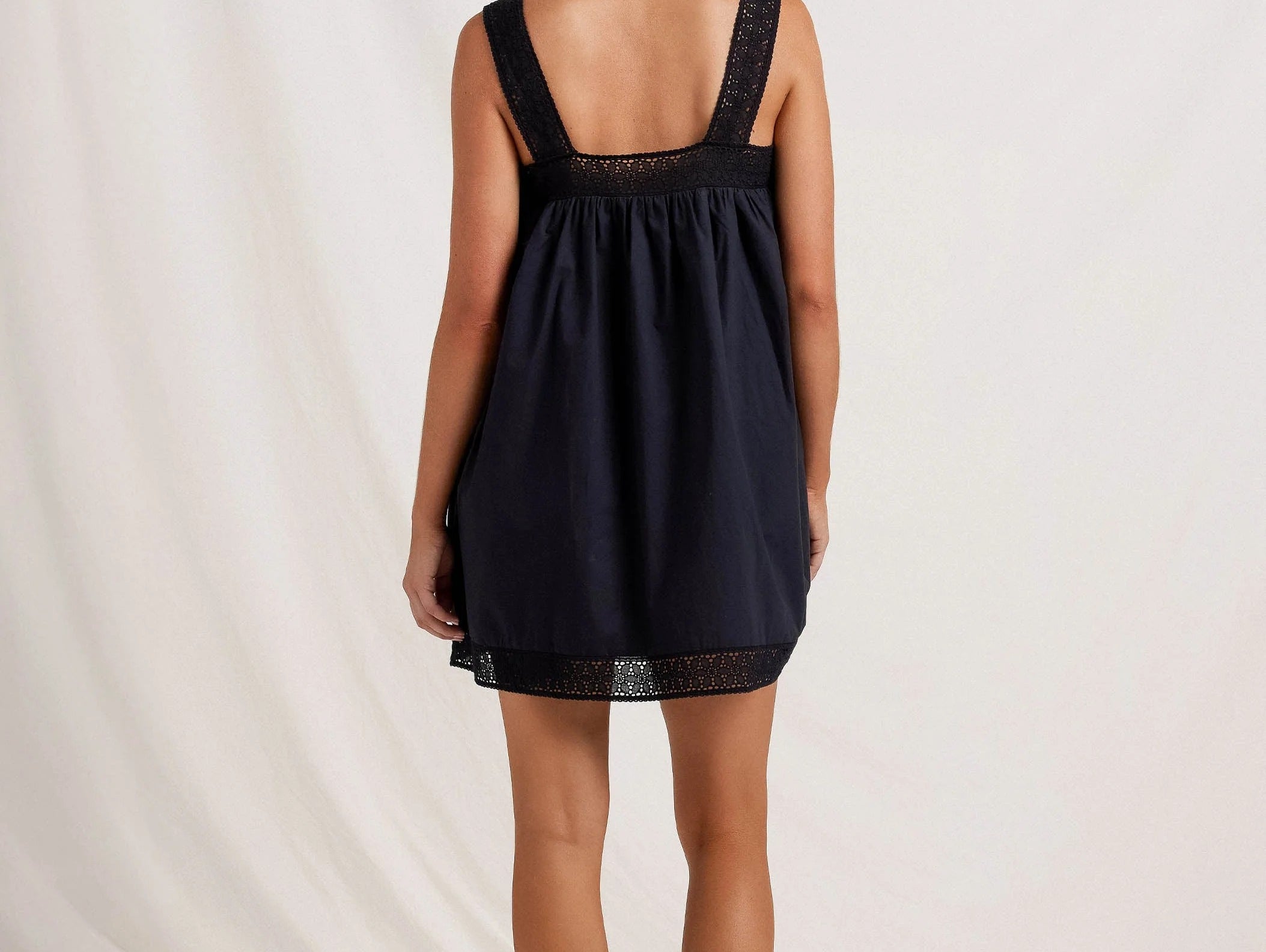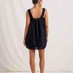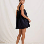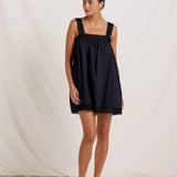 Introducing Peony's Broderie Mini Dress in Noir, a mini babydoll dress silhouette in the color black. Designed in soft, breathable cotton, the mini dress features a square neckline with eyelet embroidery frames with a relaxed, flowy draping silhouette. Perfect mini dress for the warm weather season.
