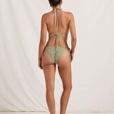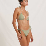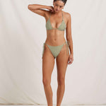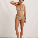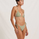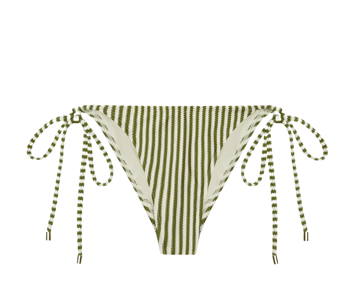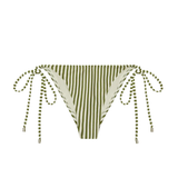 Introducing Peony's Essential String Pant in Fern Stripe, a tie triangle bikini bottom in a white and green stripe pattern. Designed with premium golden toggles and adjustable tie sides. Pair it with the Essential Tri Bikini Top in Fern Stripe.