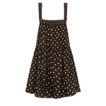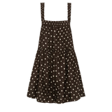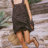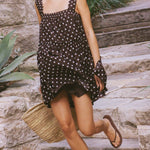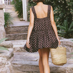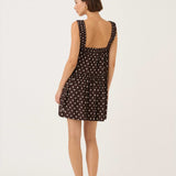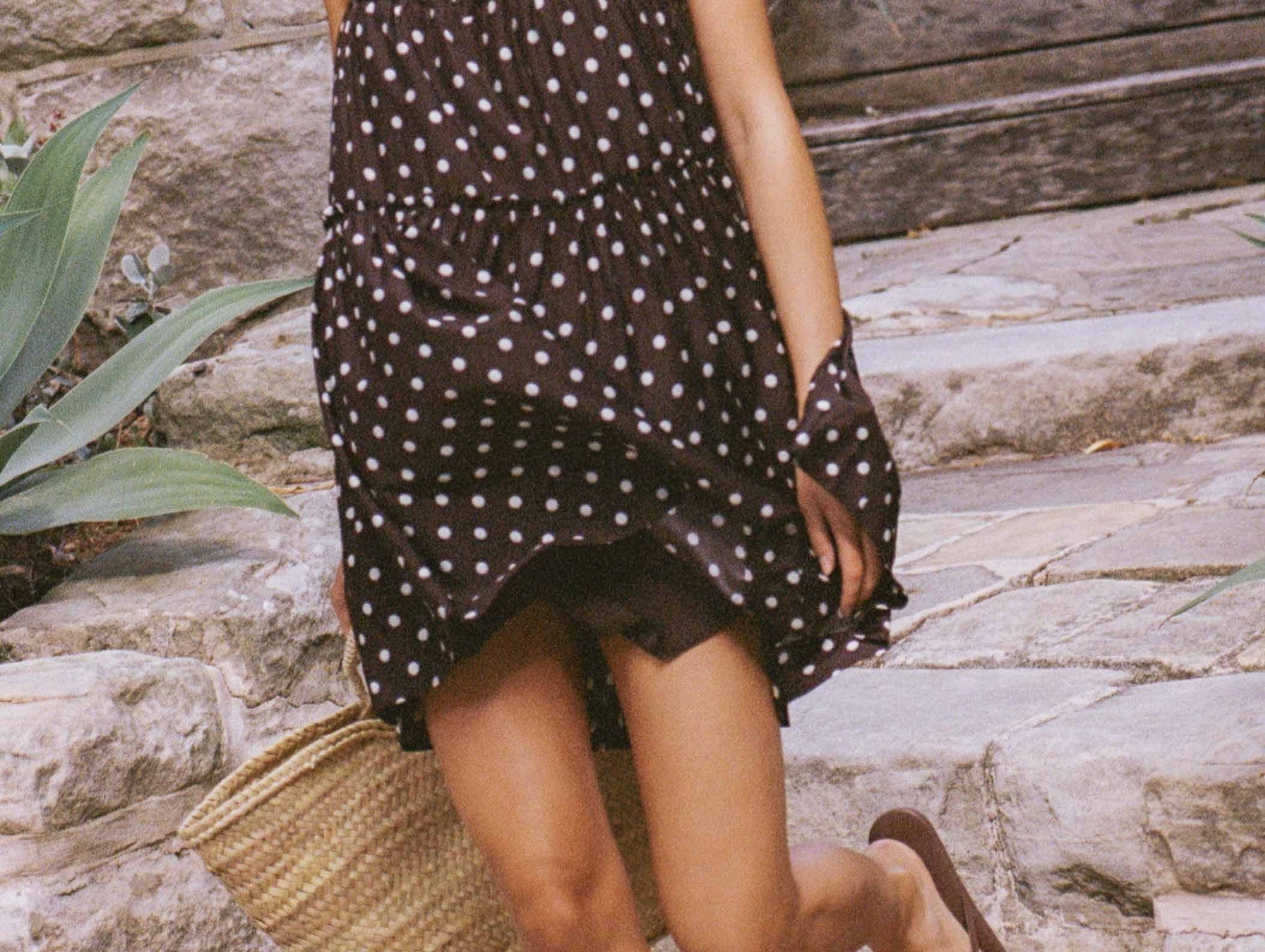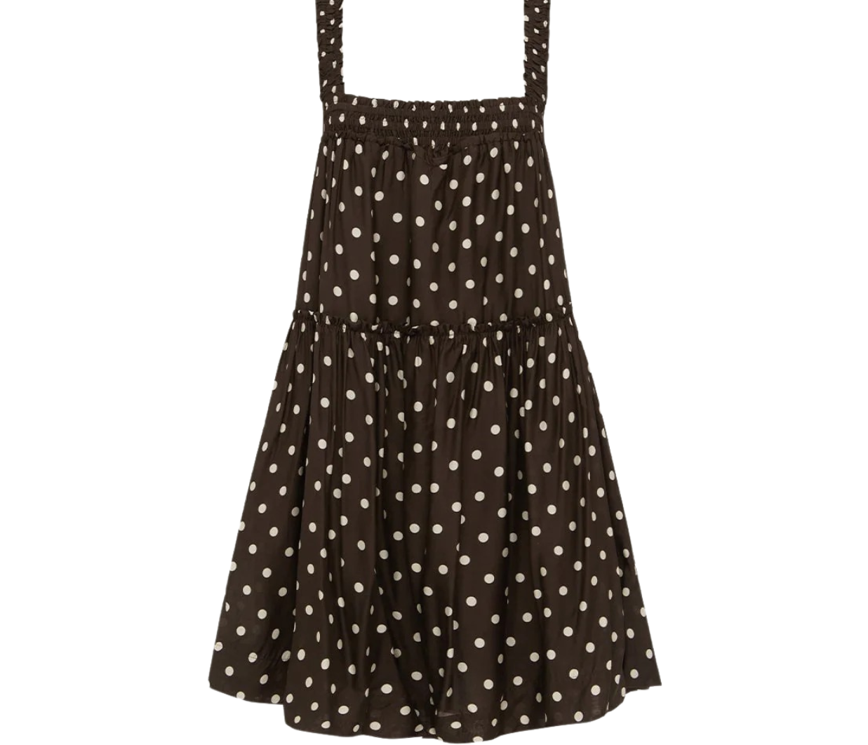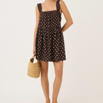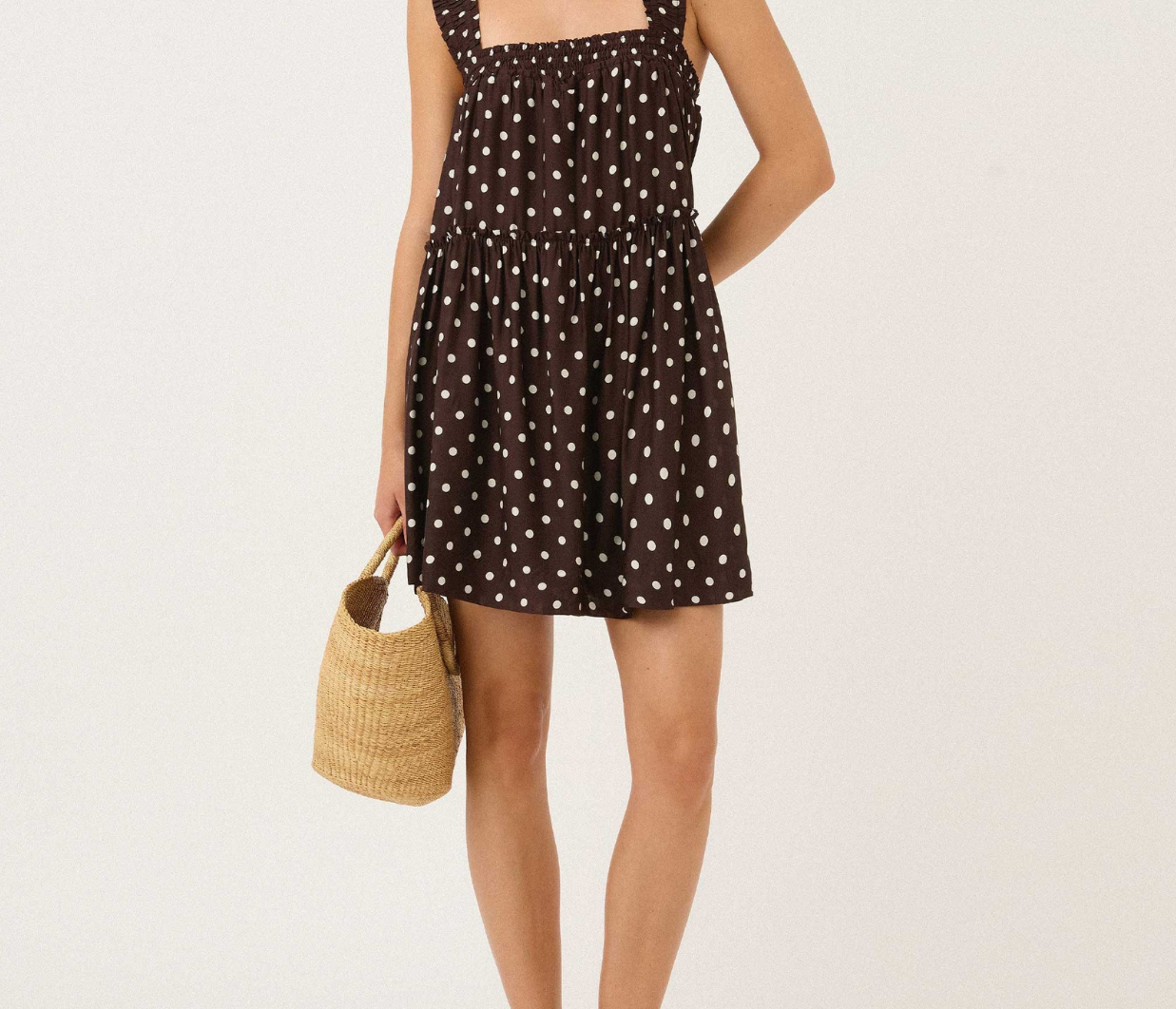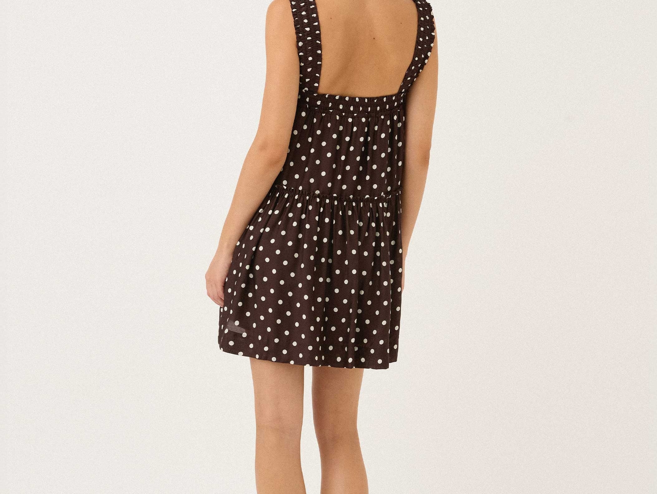 Introducing Peony's Gathered Mini Dress in Praline, a mini dress silhouette in white polka dots on a praline brown canvas. Designed with a square neckline and soft tiered detailing, the dress features delicate ruching through the body that falls into a subtle, flattering flare. Easy to slip on and endlessly wearable, it’s a light and effortless style made for sunlit days and balmy summer evenings.
