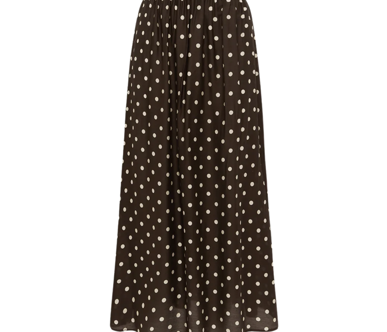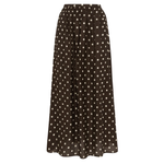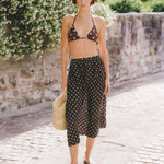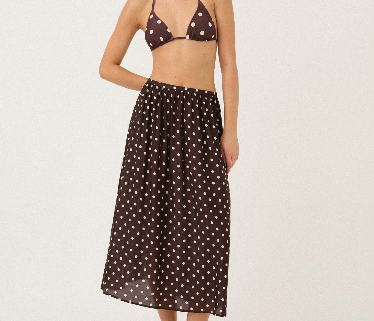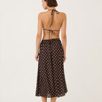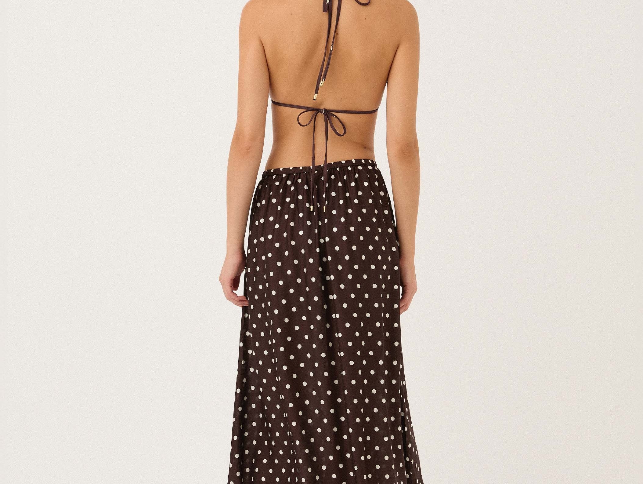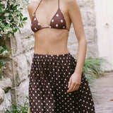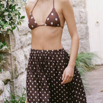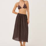 Introducing Peony's Holiday Skirt in Praline, a relaxed midi dress silhouette in white polka dot on a praline brown canvas. Designed with a softly flowing A-line midi silhouette, the Holiday skirt offers a relaxed fit, made to sit comfortably at the natural waist or styled lower on the hips for an easy, laid-back feel. Sheer and airy, this style is intended to be worn over swimwear as a refined cover-up, transitioning seamlessly from sun-soaked days to balmy summer evenings.