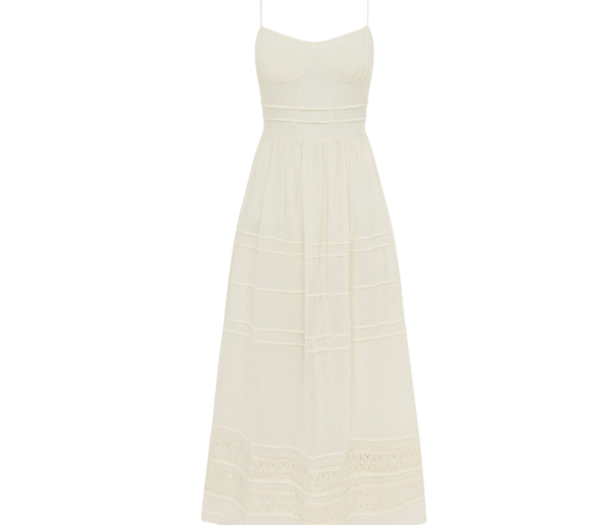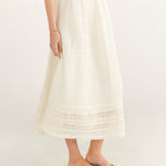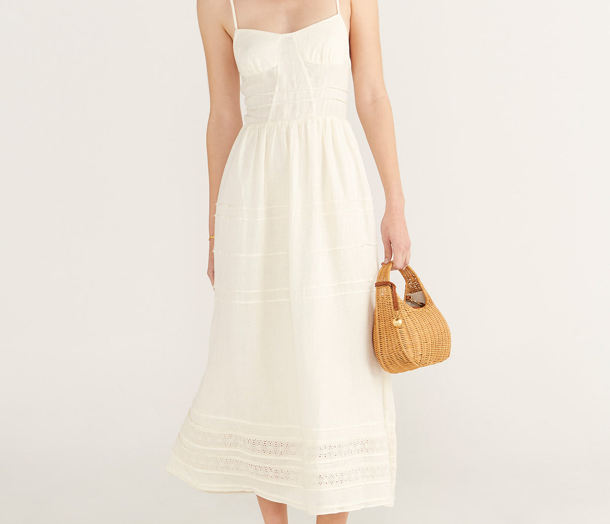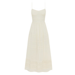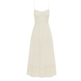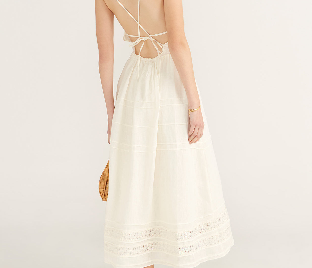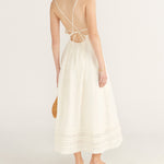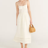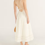 The Panelled Midi Dress in Fleur features a flattering bust panel that shapes your silhouette beautifully, while delicate floating panels of soft cream linen and intricate embroidery adorn the hem for an added touch of elegance. The adjustable tie back not only ensures a perfect fit but also serves as a stunning focal point.