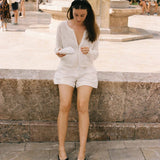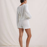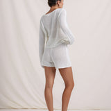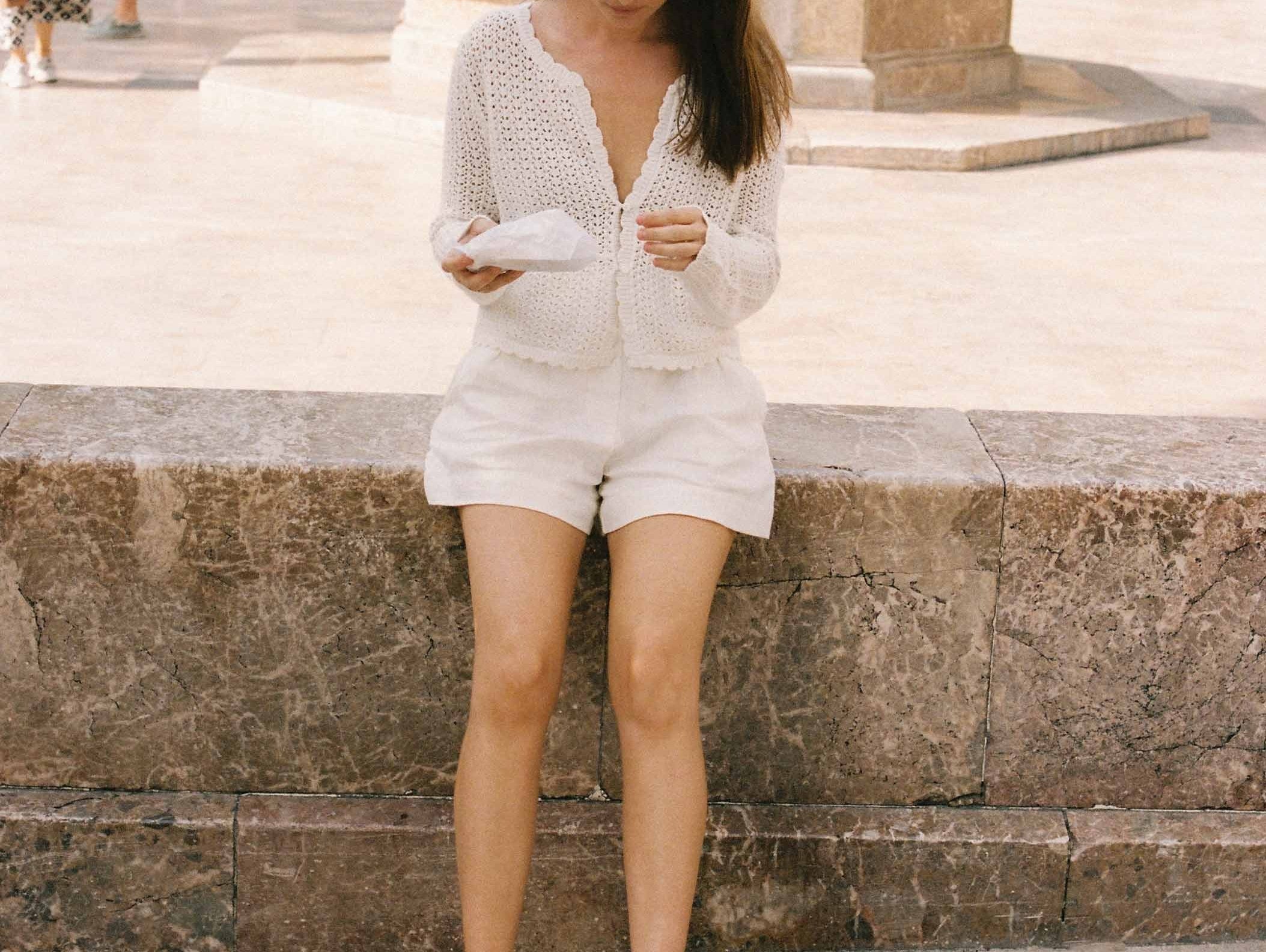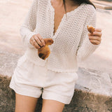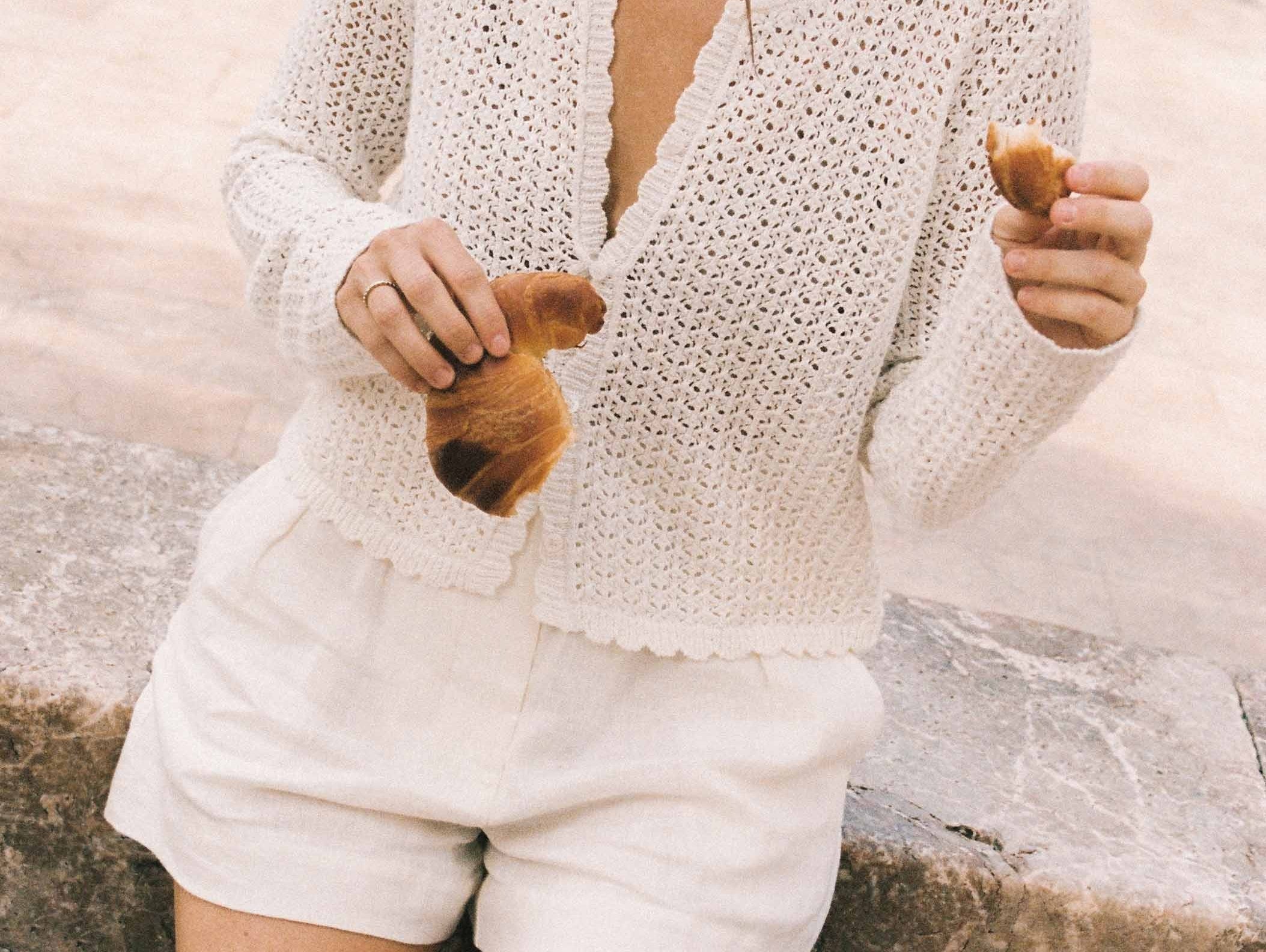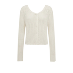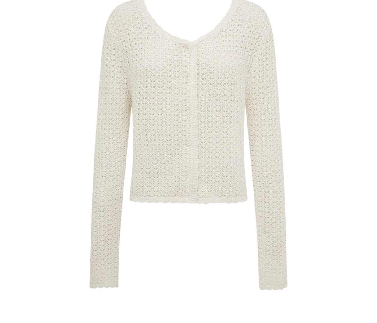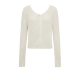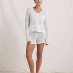 Introducing Peony's Pointelle Cardigan in Seashell, a classic cardigan silhouette in a white color hue. Designed in a delicate pointelle knit, the cardigan features Peony’s signature scalloped edging, a crew neckline, and a finished pearl button-up closure. Perfect for lounging poolside or dressing up with summer sandals.