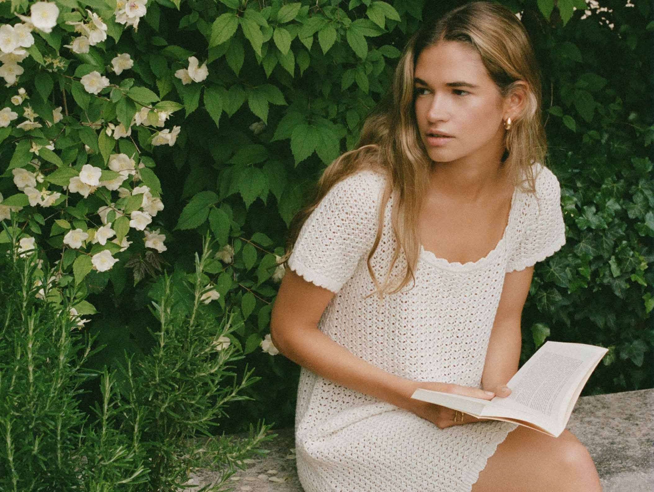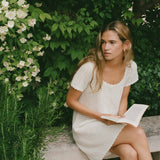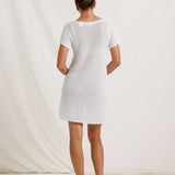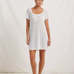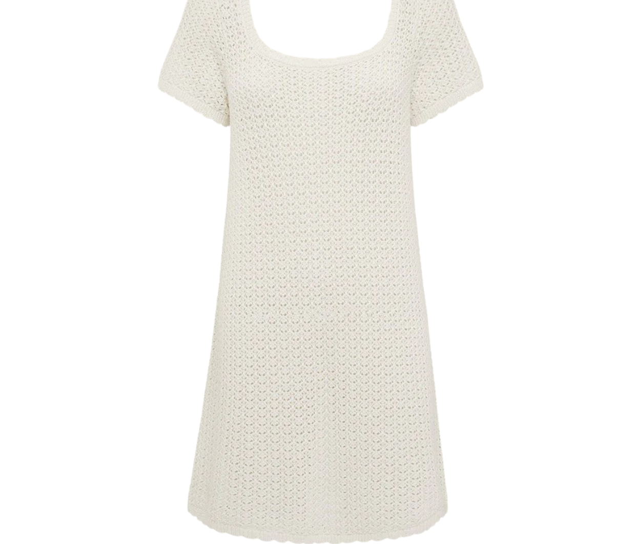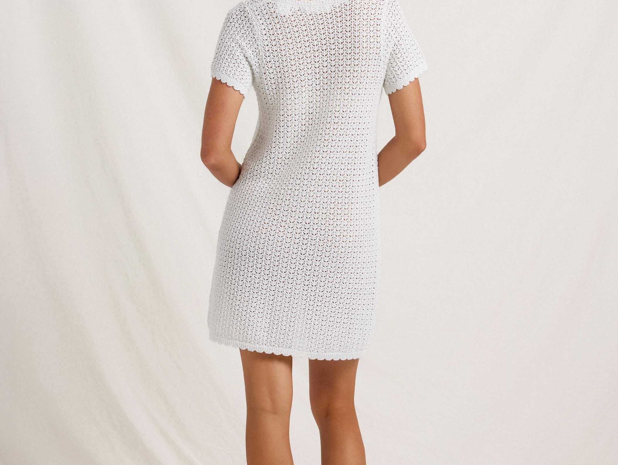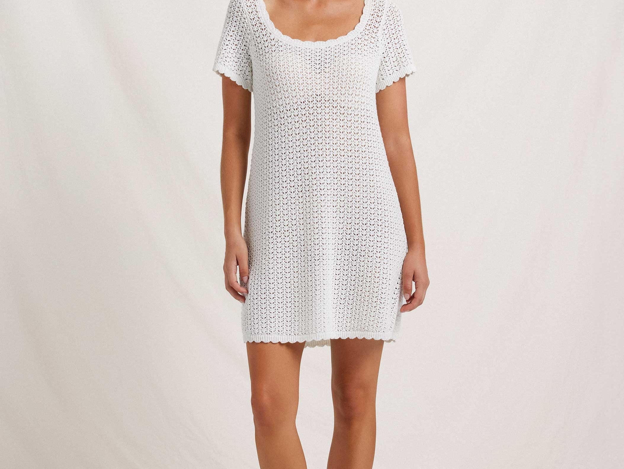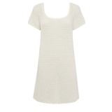 Introducing Peony's Jane Mini Dress Seashell, a scoop neck mini shirt dress silhouette in a white color hue. Designed in a delicate pointelle knit, the Jane Mini Dress features Peony’s signature scalloped edging and an effortless A-line silhouette, finished with a flattering scoop neckline. Perfect for lounging poolside or dressing up with summer sandals.