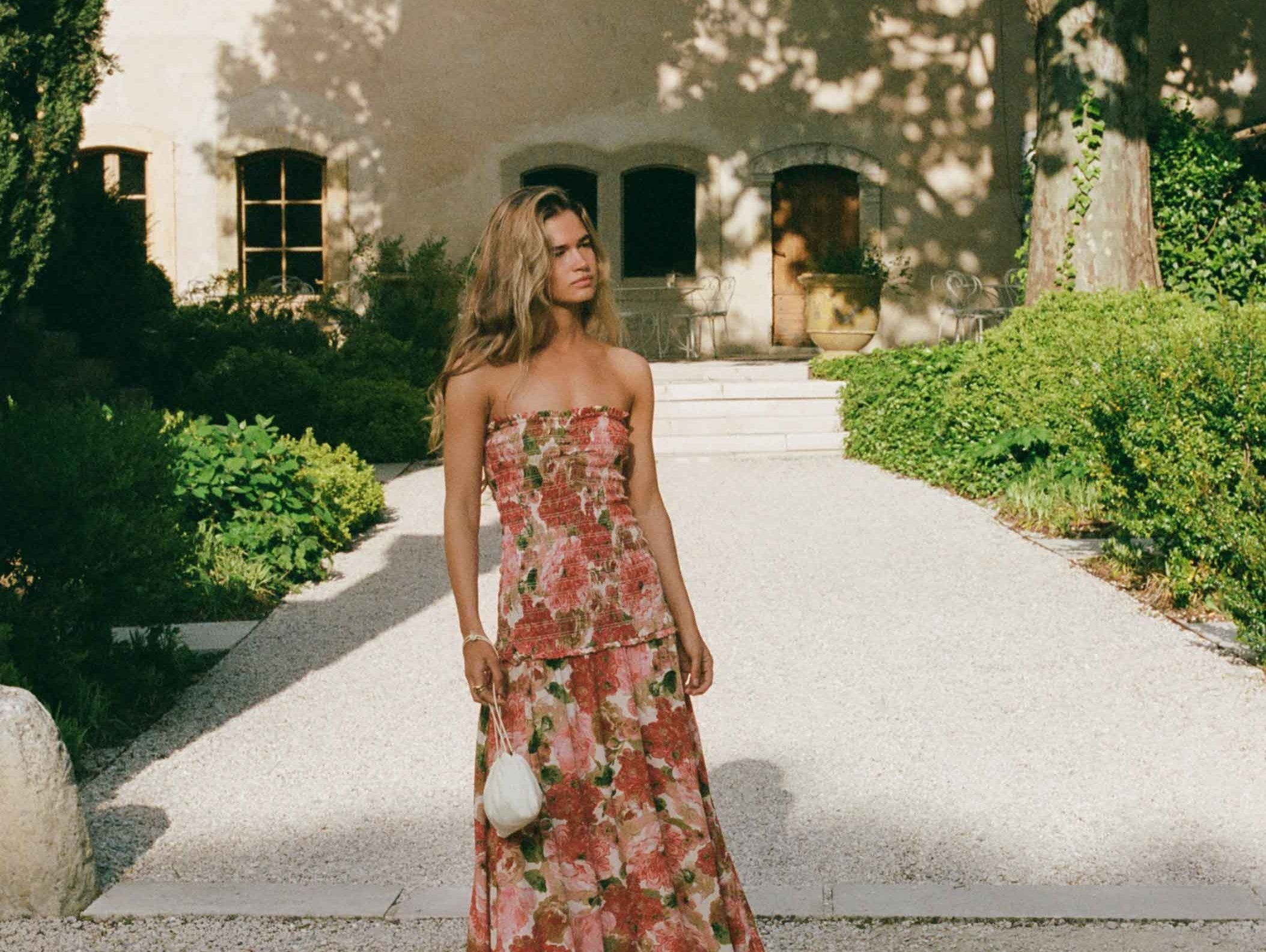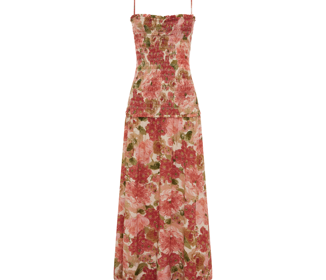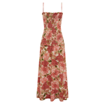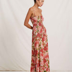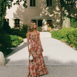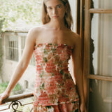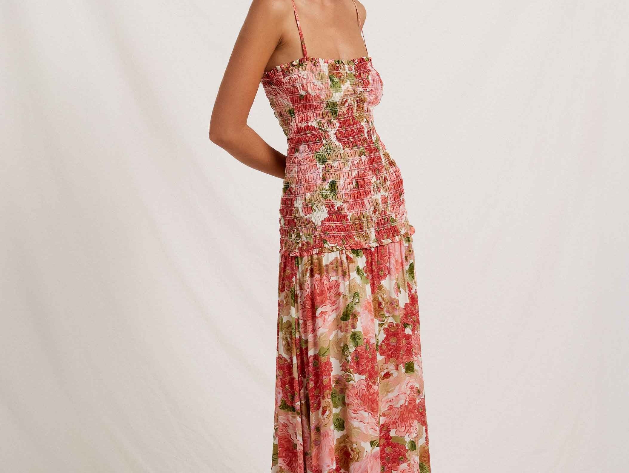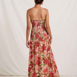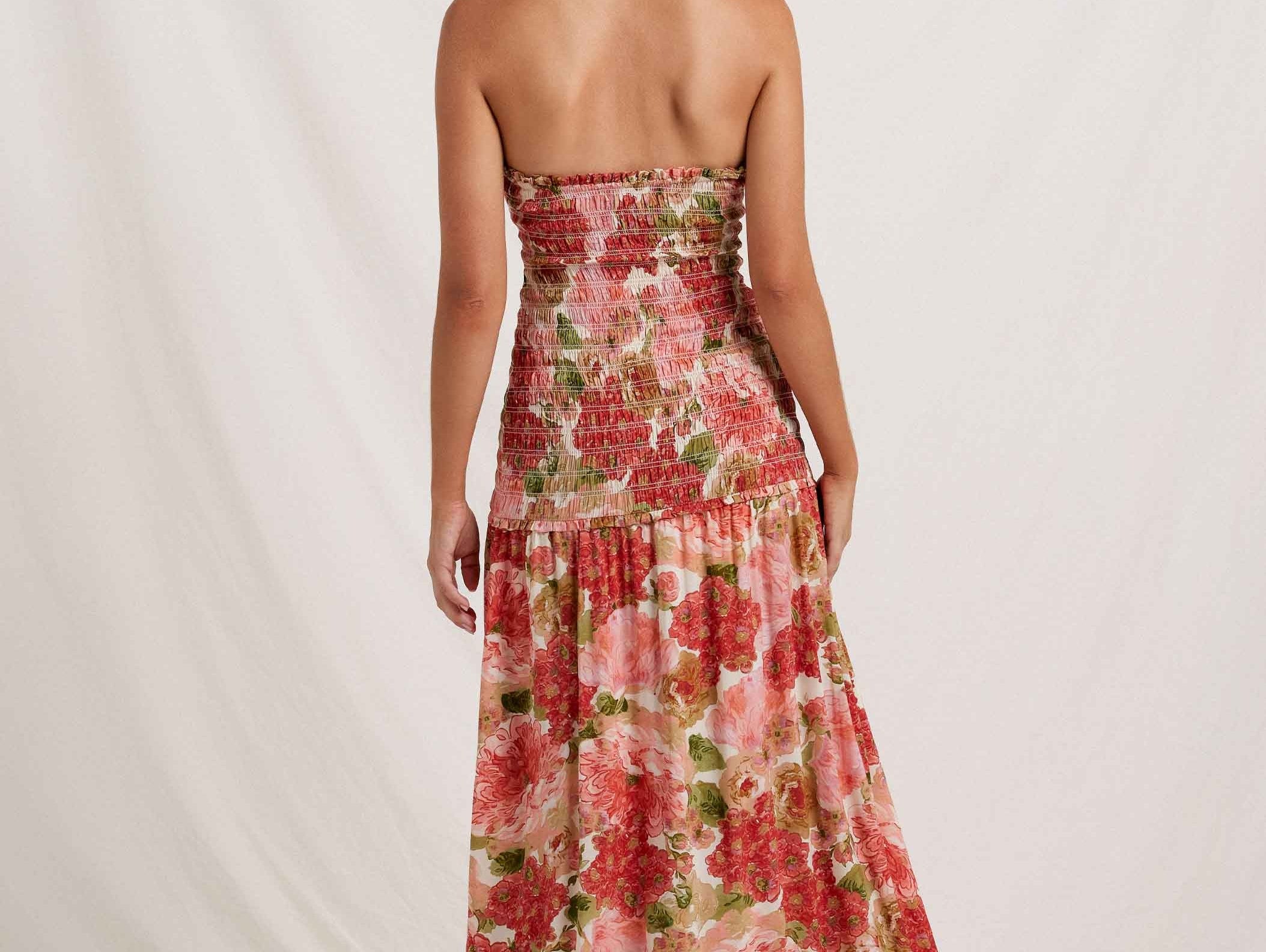 Introducing Peony's Samantha Maxi Dress in Dahlia, a strapless midi dress silhouette in Peony's exclusive print, Foliage. Designed with a gathered, ruched, shirred bodice and a relaxed, flowy draping silhouette to ankle length. Perfect for the warm weather season.