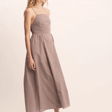 Introducing Posse's Callie Dress in Petite Mocha Gingham, a vintage-inspired maxi-length dress silhouette crafted from breathable, gingham hand-loomed cotton. Featuring a flattering square neckline, elasticated back, and voluminous skirt, it turns to reveal an open back with an adjustable tie for a feminine finish.