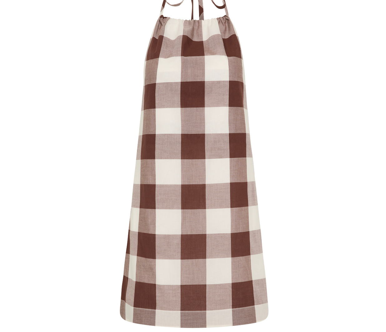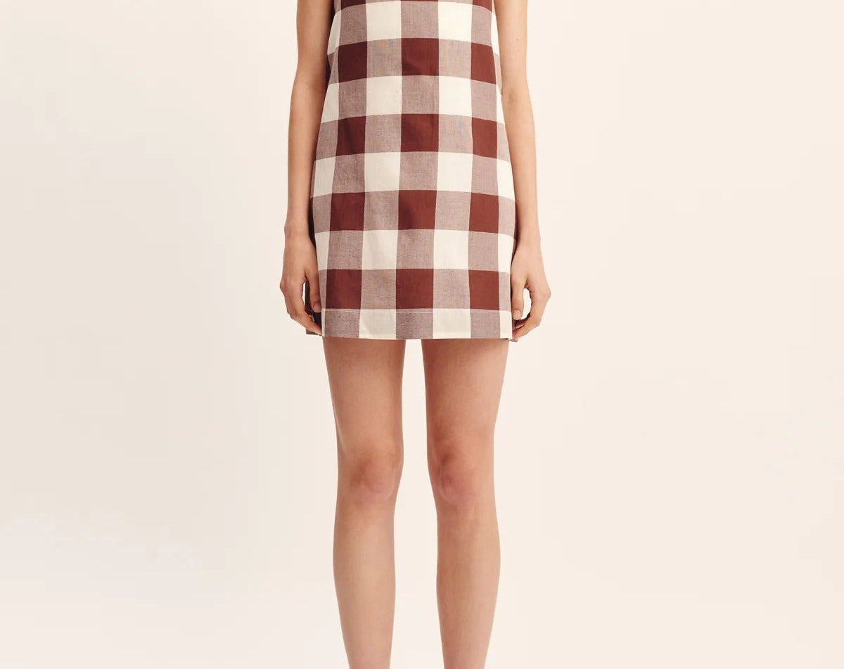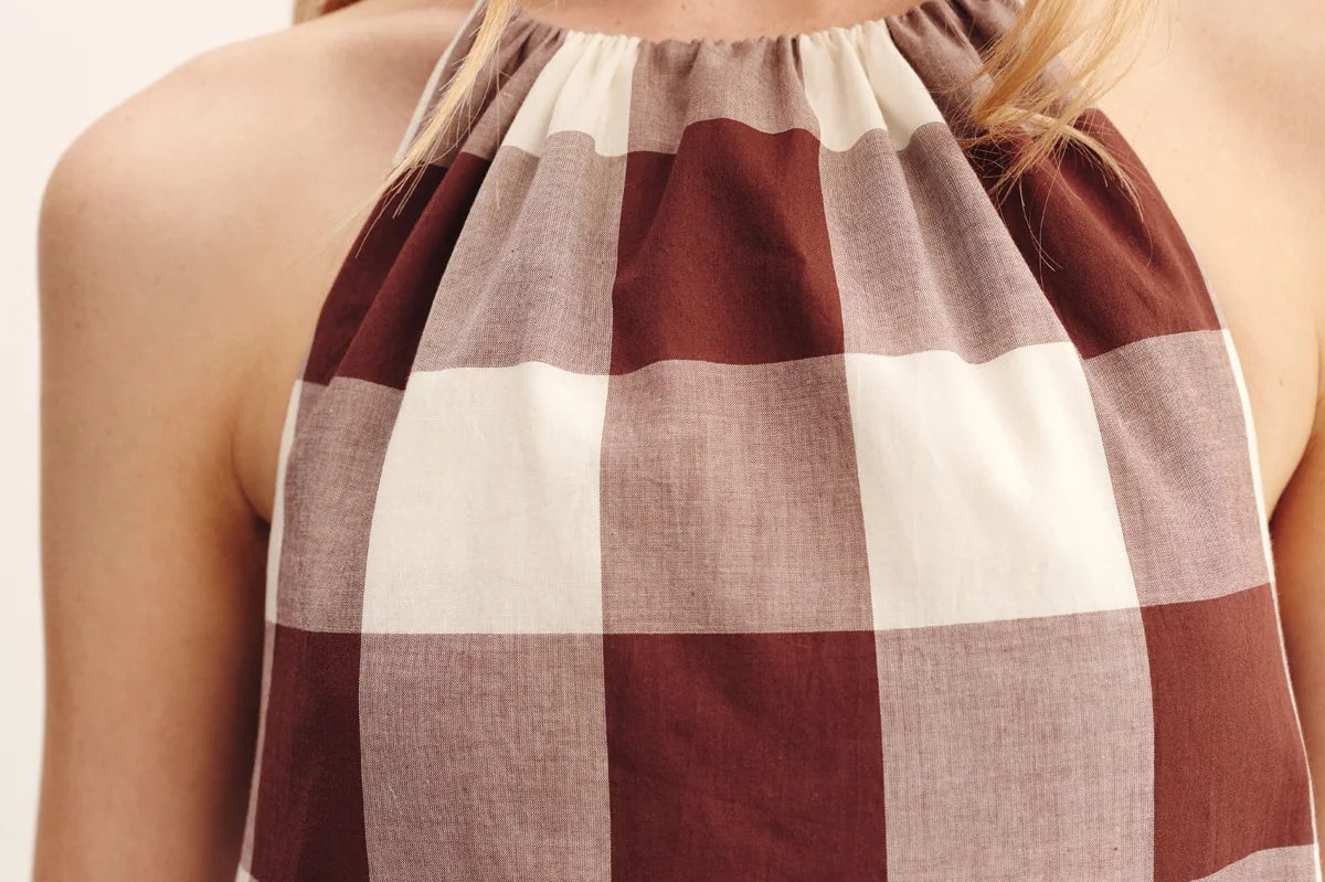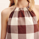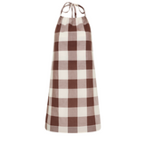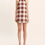 Introducing Posse's Callie Mini Dress in Mocha Gingham, crafted from hand-loomed cotton in an exclusive brown and cream check. Designed with an A-line silhouette, it features an adjustable halterneck tie, slight elastication at the back, and an invisible side zip for a comfortable and flattering fit.