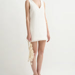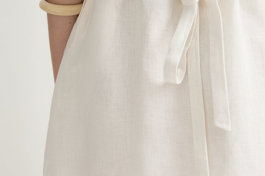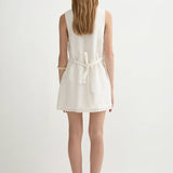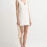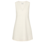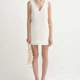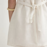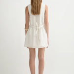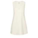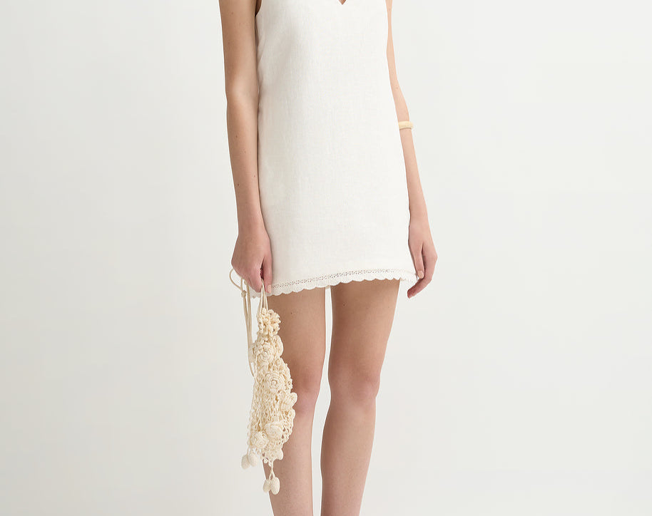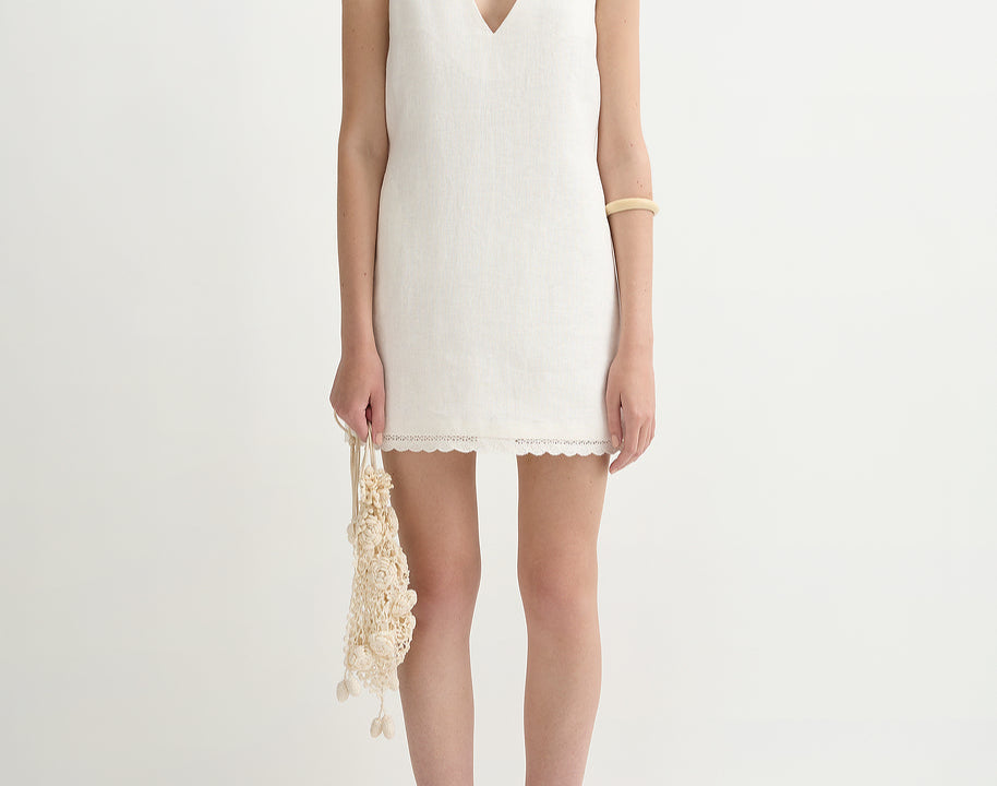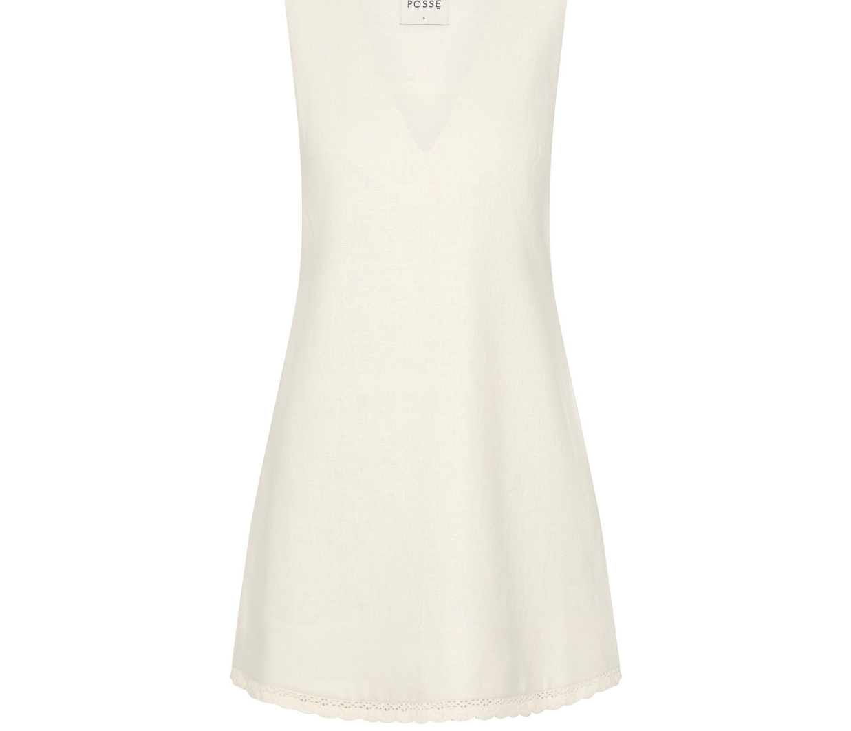 Introducing Posse's Effi Mini Dress in Cream, a mini dress silhouette in a cream hue. Designed in an A-line, relaxed silhouette with a deep V neckline and a waist tie detail cinching the waist for a form-fitted shape silhouette, finished with a crochet lace trim hem.