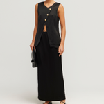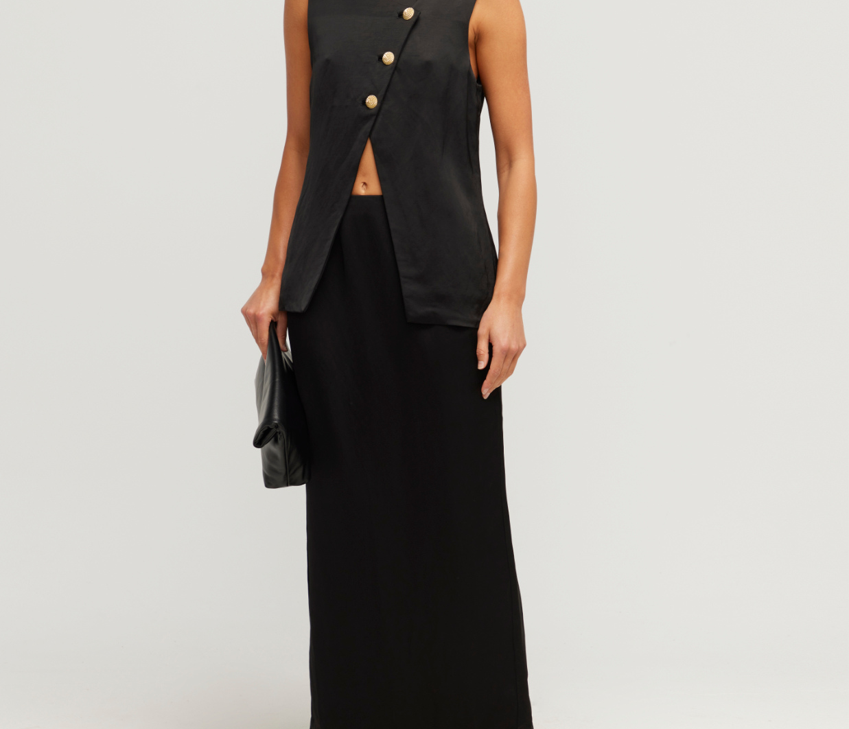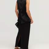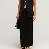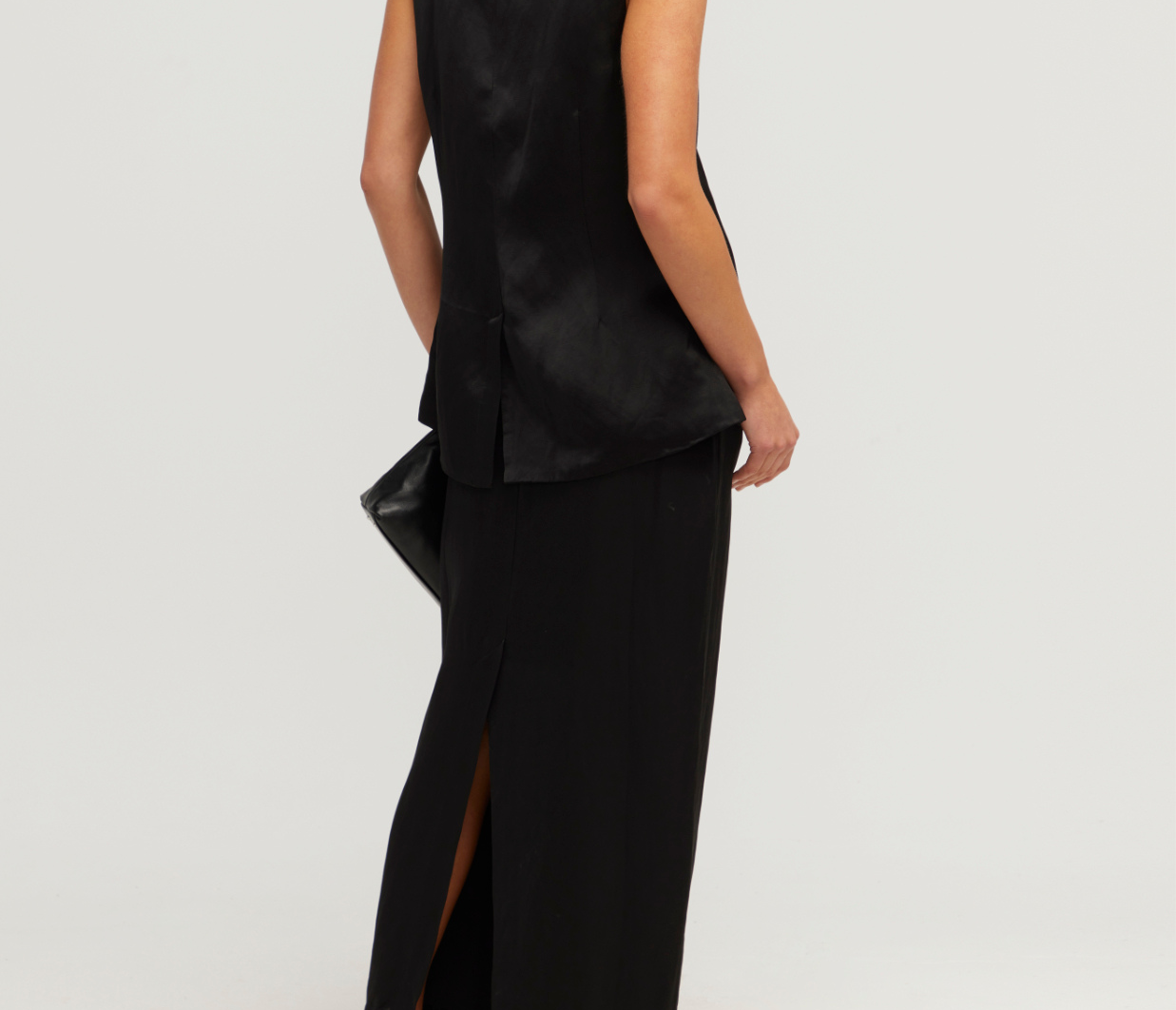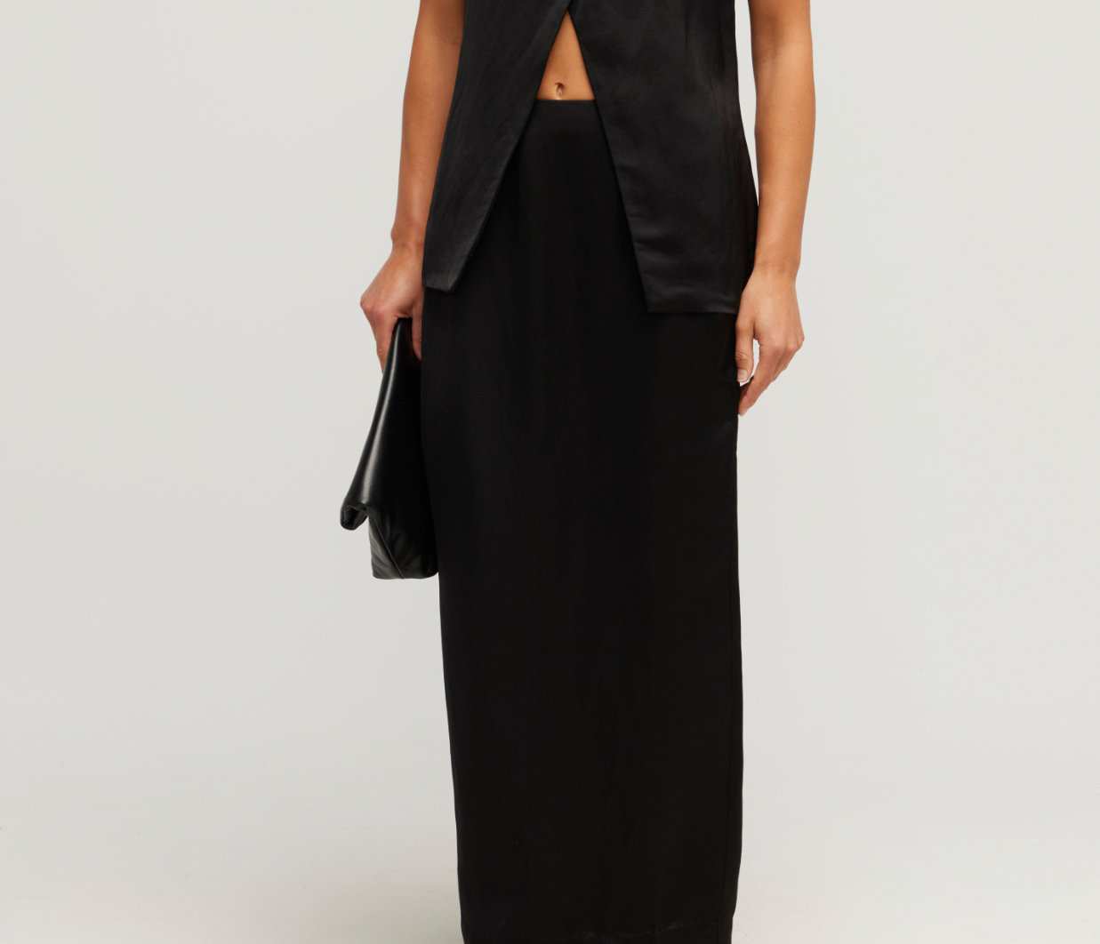 The Gigi Pencil Skirt exudes simple elegance with its glossy satin finish, ideal for evening wear or special events. Designed to sit high on the waist, it features an elegant maxi-length hem and a back split for ease of movement.