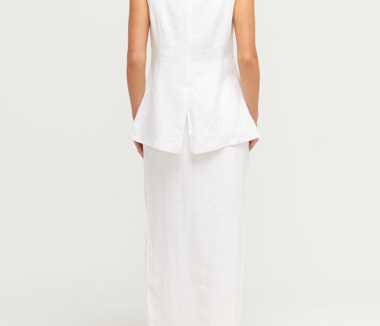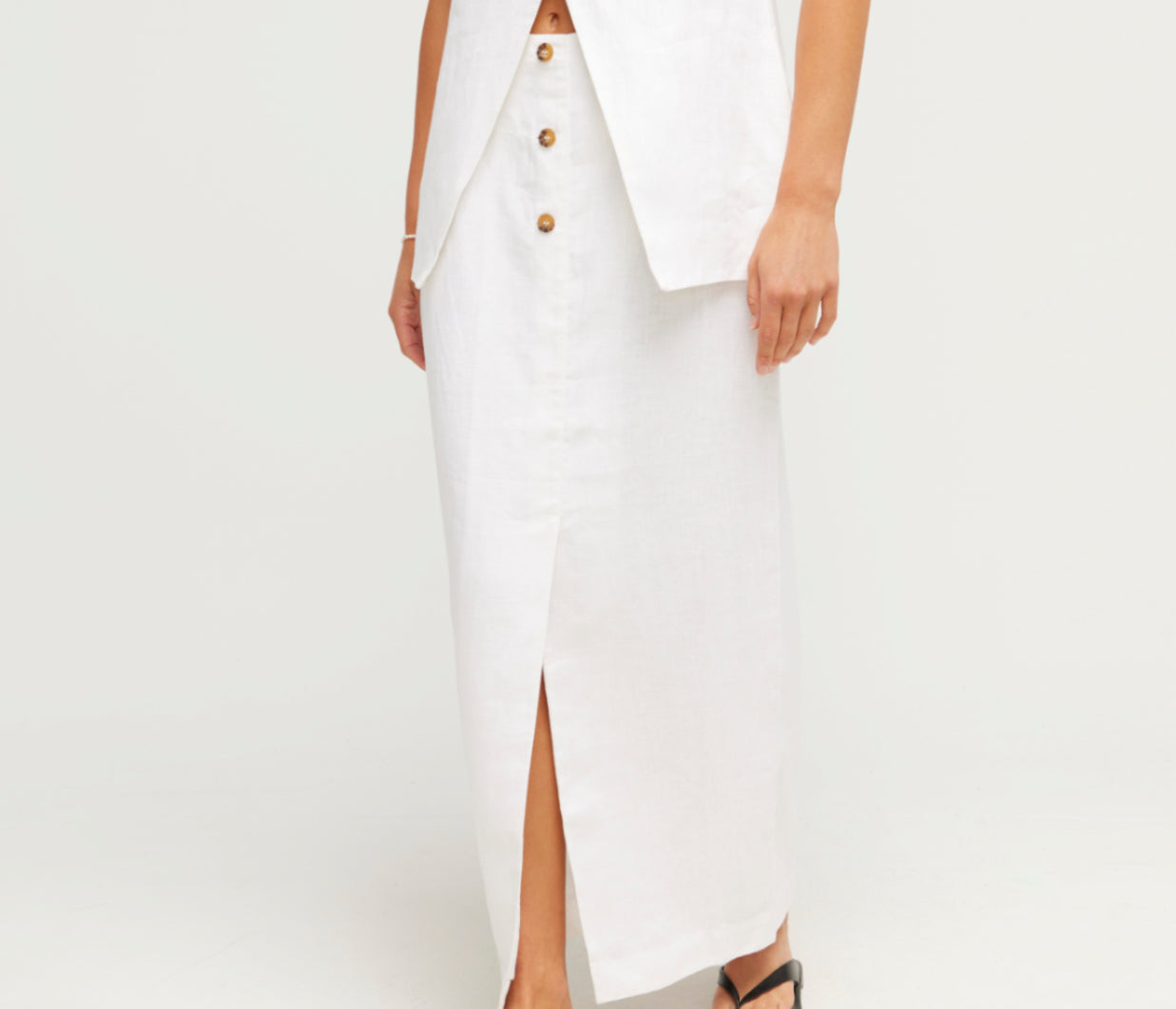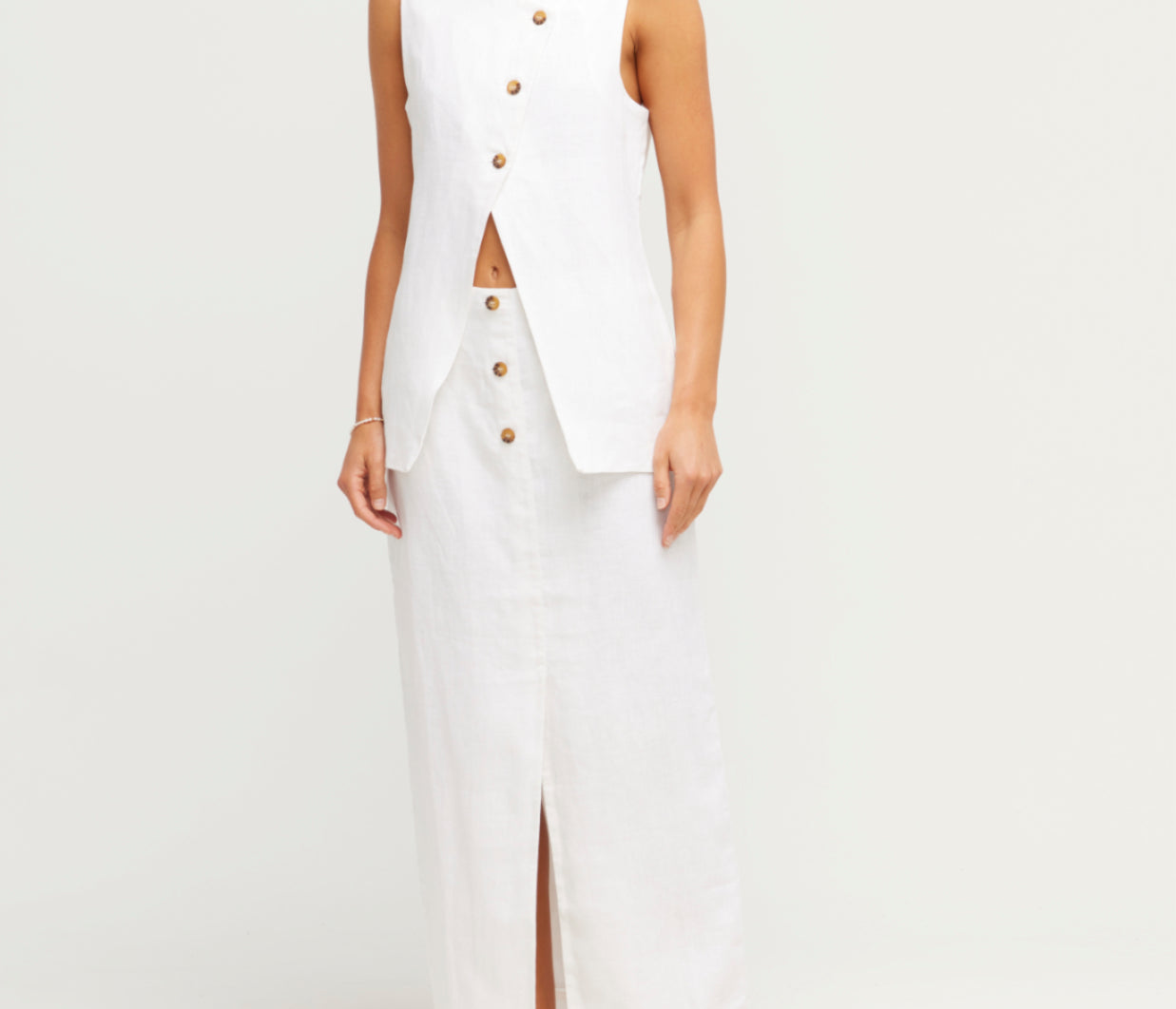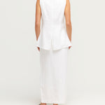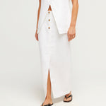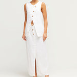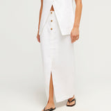 The Gigi Column Skirt is cut from certified linen and is designed to sit high on the waist. It features centre front buttons and a statement front split. Style yours as a set with the coordinating Gigi Gilet. The crisp white hue makes it perfect for daytime events or a memorable bridal moment.