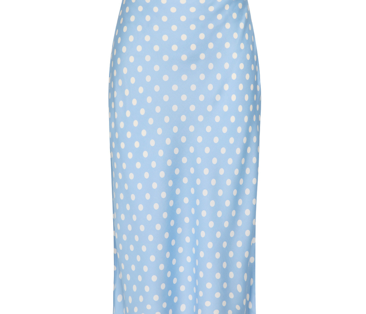 Introducing Posse's Leo Skirt in Blue Polka Dot, a slip midi skirt in blue polka dot. Designed with a bias cut and bind detailing at the waist, it falls just below the knee. Perfect for a summer elevated ook.