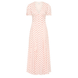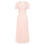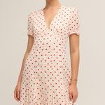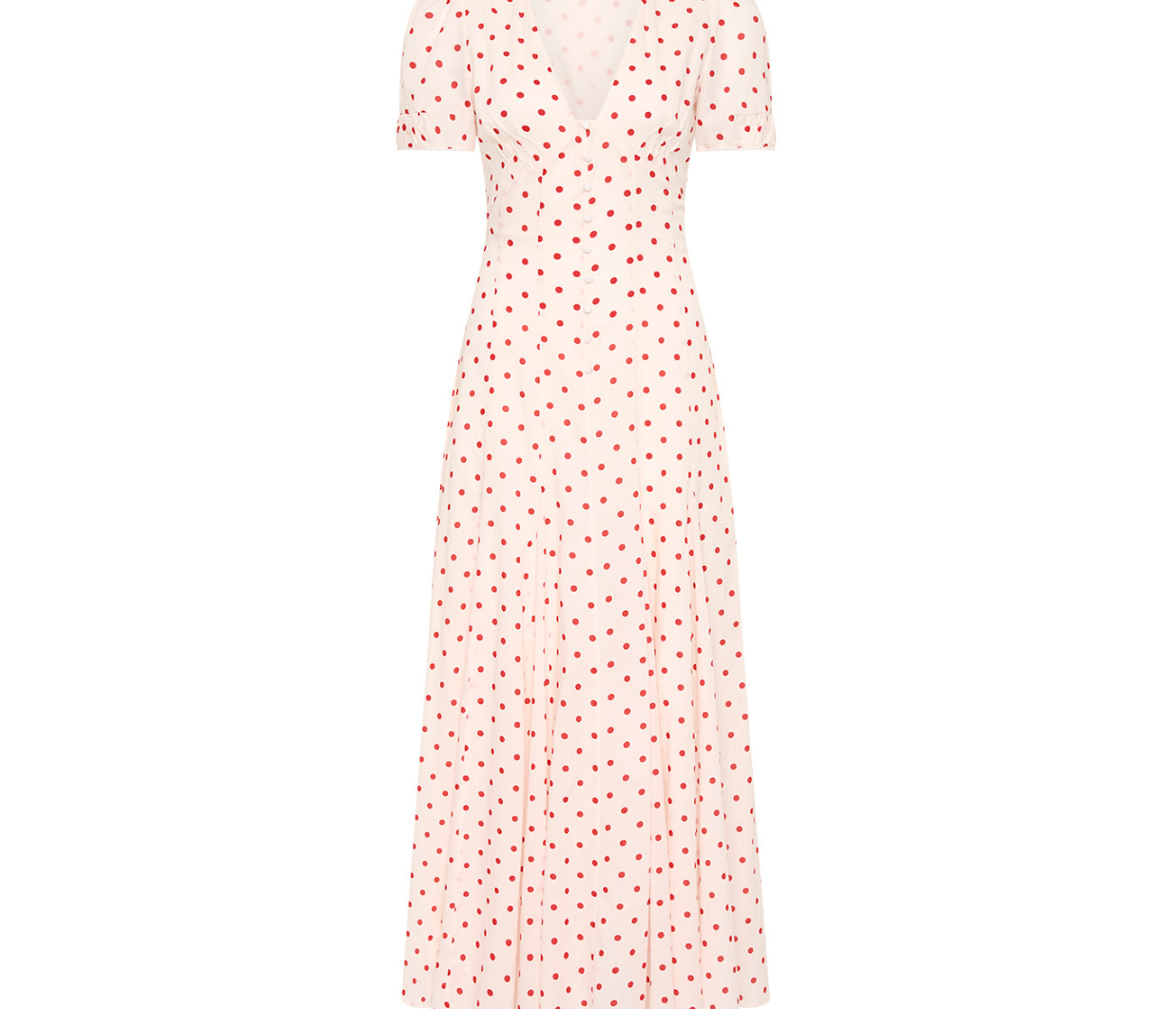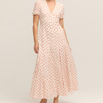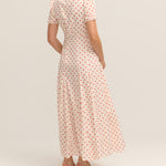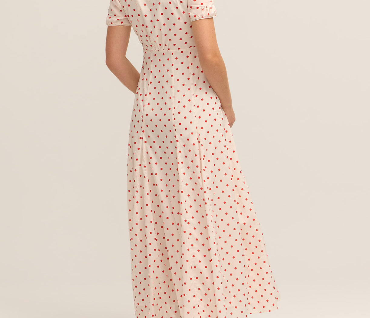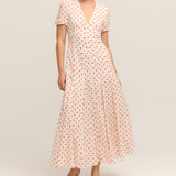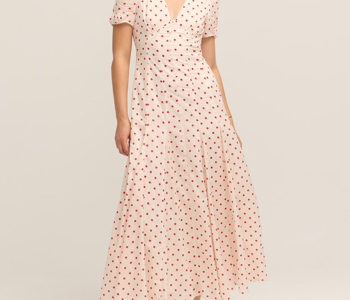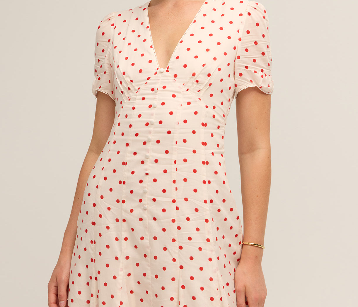 Introducing the Paloma Dress in Petite Polka Dot is crafted from a cotton blend fabric and features our delicate cream and red polka dot print. This ethereal silhouette has a deep-v neckline and fits slim through the bodice before falling to a floaty full skirt with statement godets.