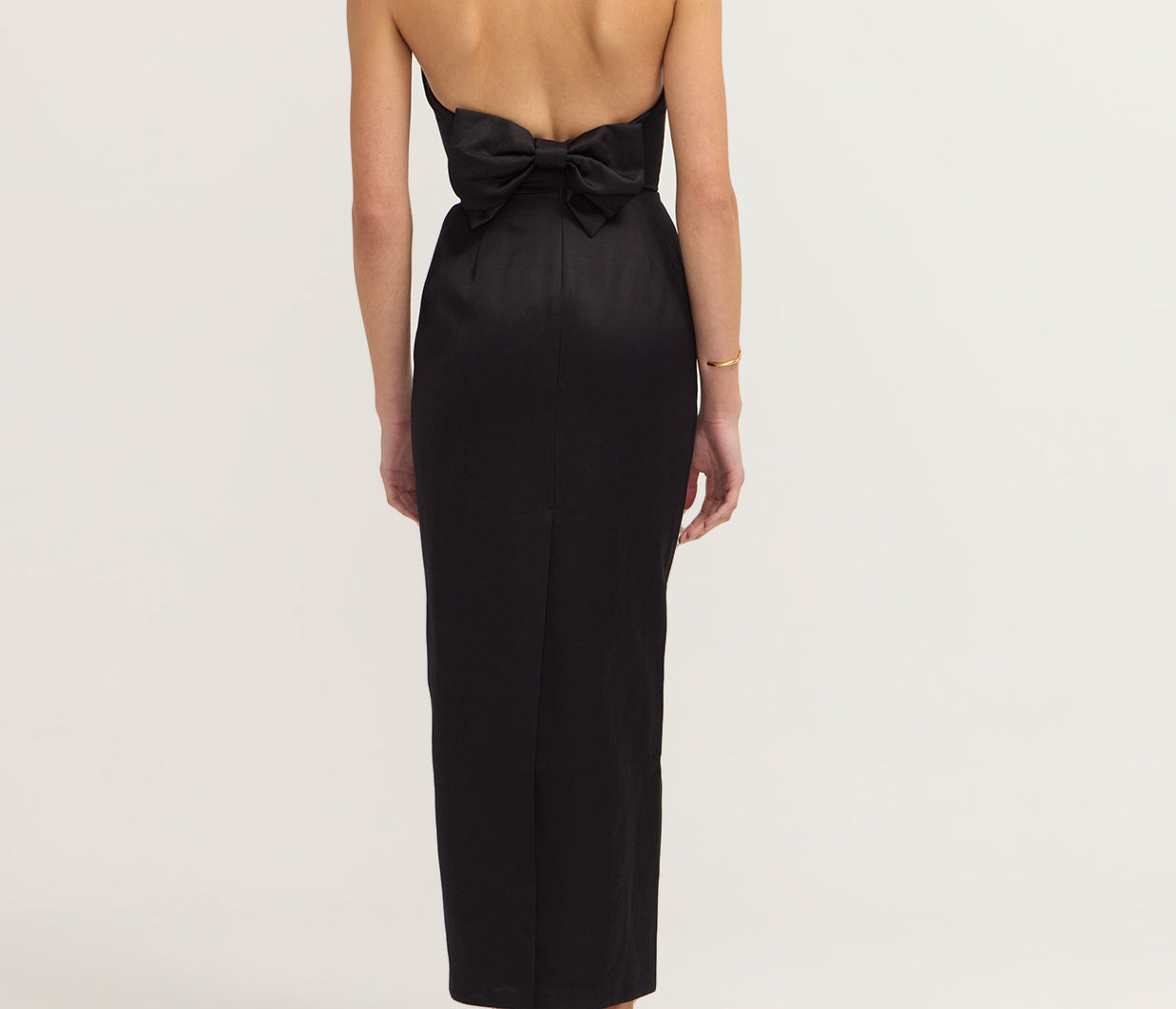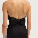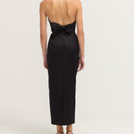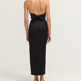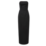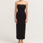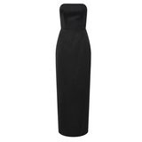 Introducing Romeo Strapless Dress in Black. The Romeo features a fitted, boned bodice with structure and support and a classic pencil skirt that skims just above the ankle for an effortlessly polished look. A curved neckline with grip tape keeps the strapless style secure, while the low back adds a touch of allure. The subtle back vent ensures ease of movement, making it perfect for evening occasions.