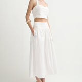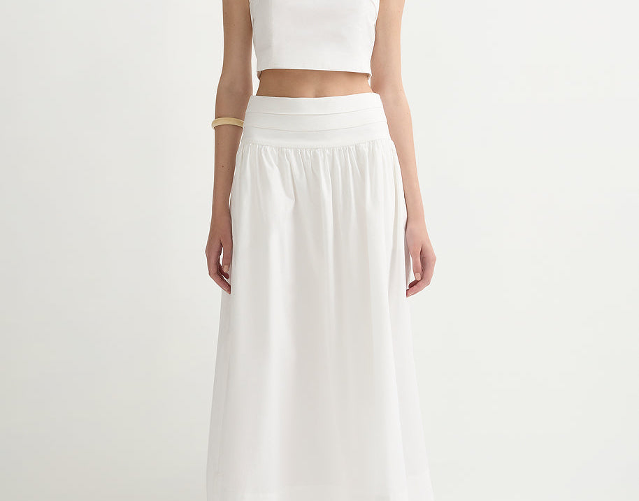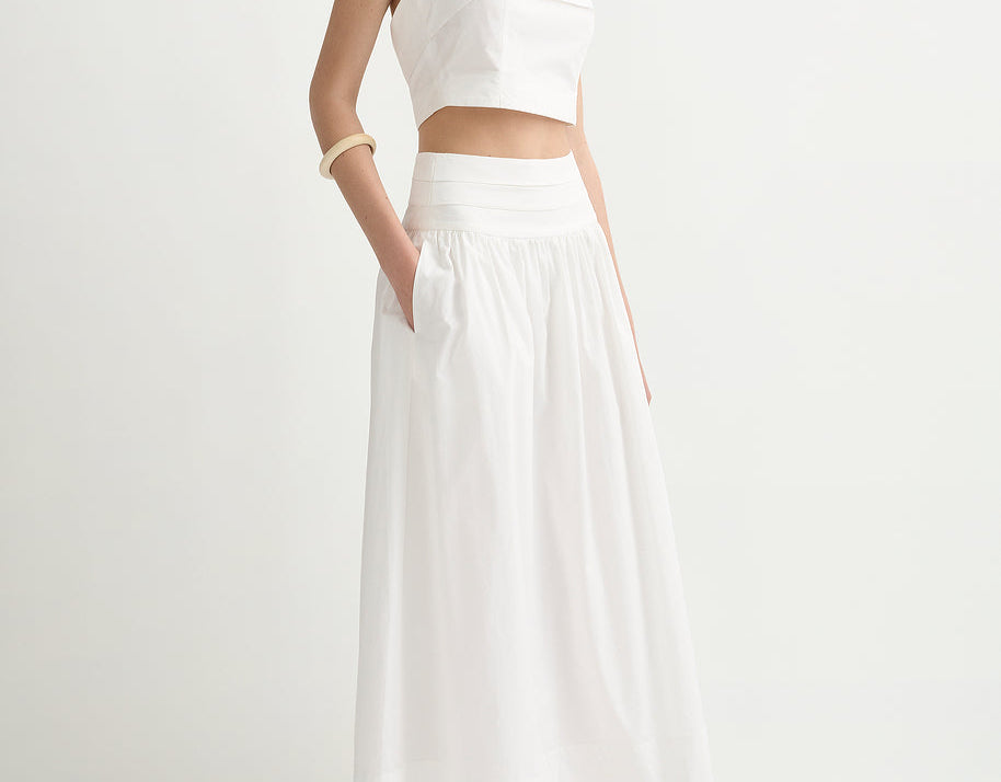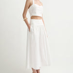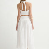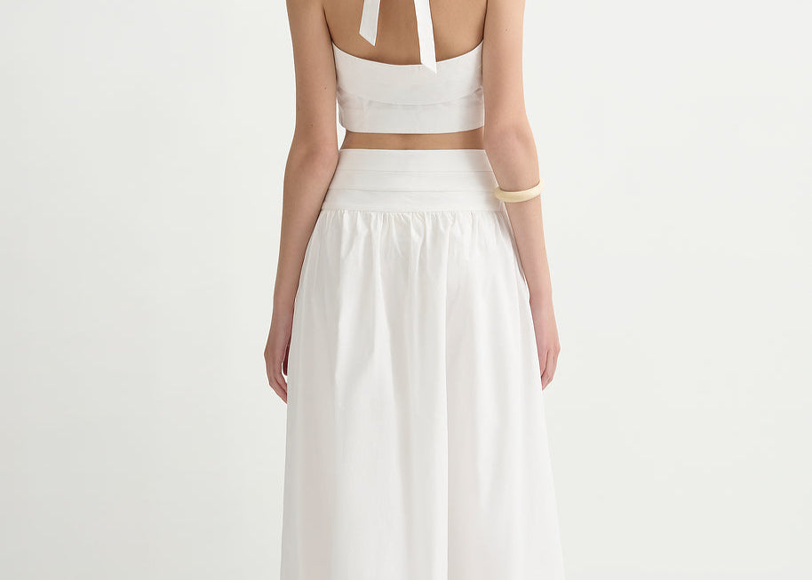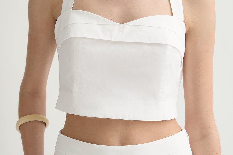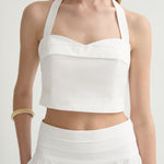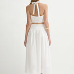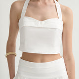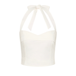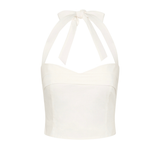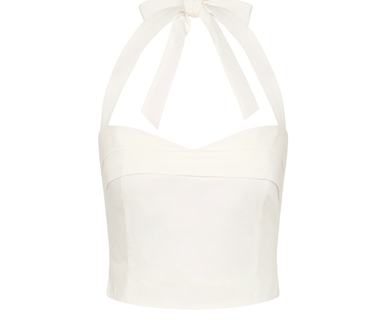 Introducing Posse's Rue Halter Top in Cream, a halter neck tie top in a cream hue. Designed from crisp cotton, with a structured, form-fitting silhouette, featuring a soft curved neckline with subtle pleat detail across the bust. The wide halter strap ties elegantly at the back of the neck, creating a bow accent that adds a refined touch. Pair it with the Rue Skirt in Cream for a coordinated look.