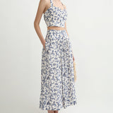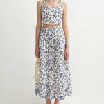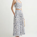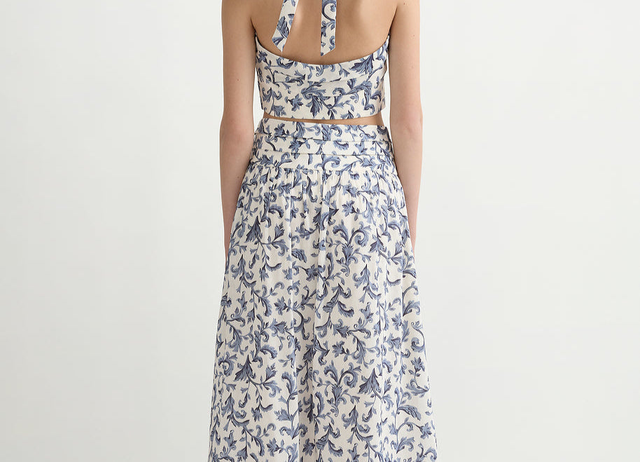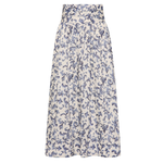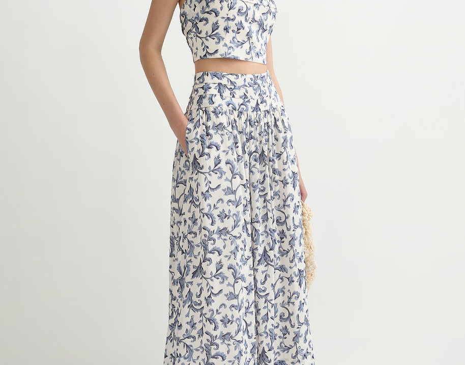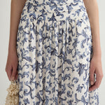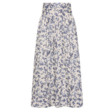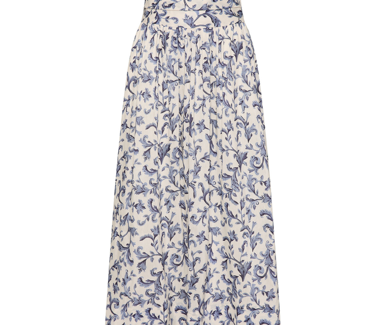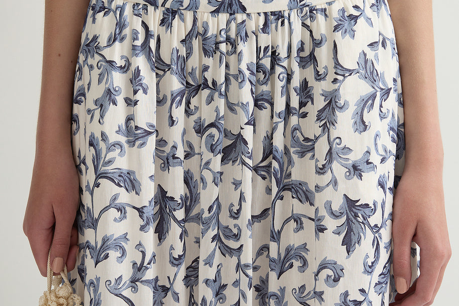 Introducing Posse's Rue Skirt in Blue Baroque, a midi-length skirt in Posse's signature Blue Baroque print. Designed in an A-line silhouette, with a clean, wide waistband for a flattering fit, and finished with a soft gathered pleated draping to the ankle. Perfect for transitioning from day to evening casual and formal looks.