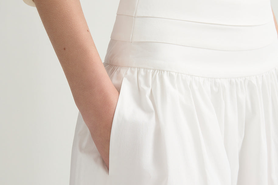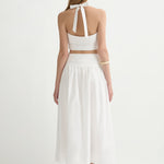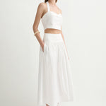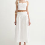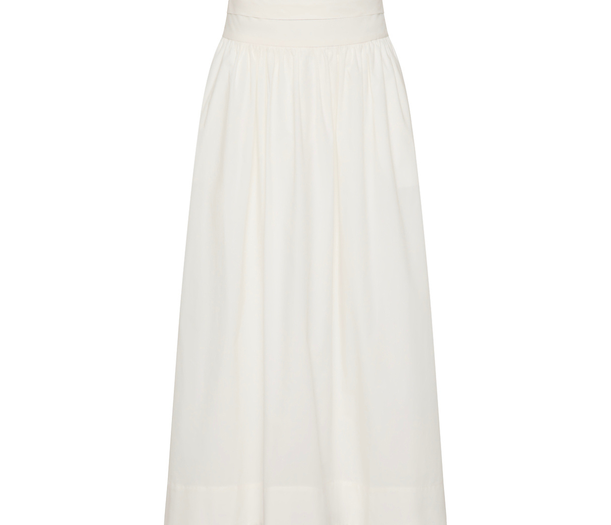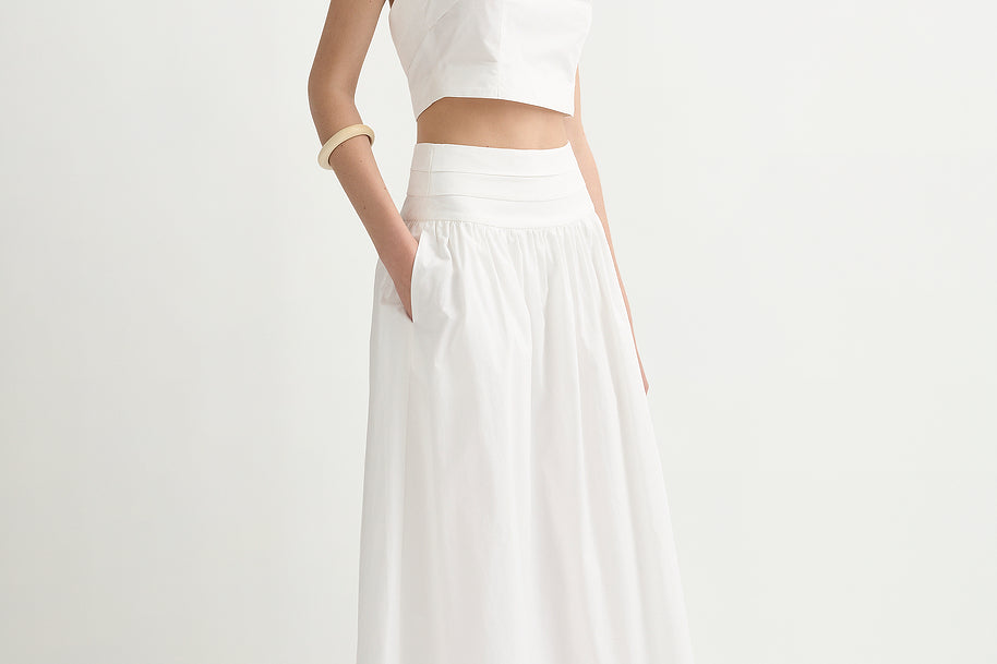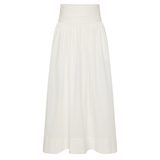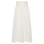 Introducing Posse's Rue Skirt in Cream, a midi-length skirt in a cream hue. Designed in an A-line silhouette, with a clean, wide waistband for a flattering fit, and finished with a soft gathered pleated draping to the ankle. Perfect for transitioning from day to evening casual and formal looks.