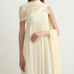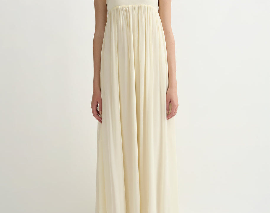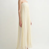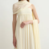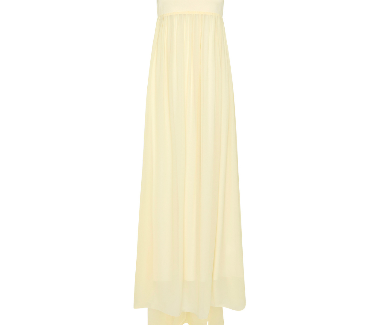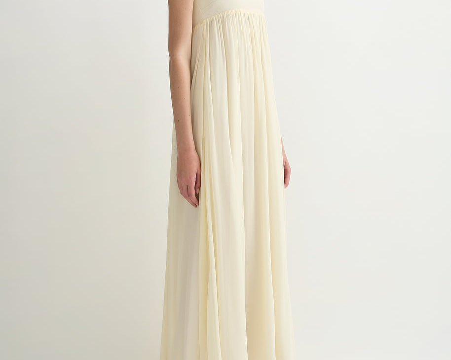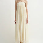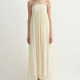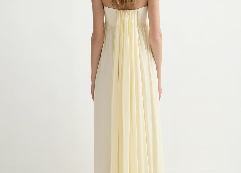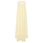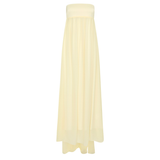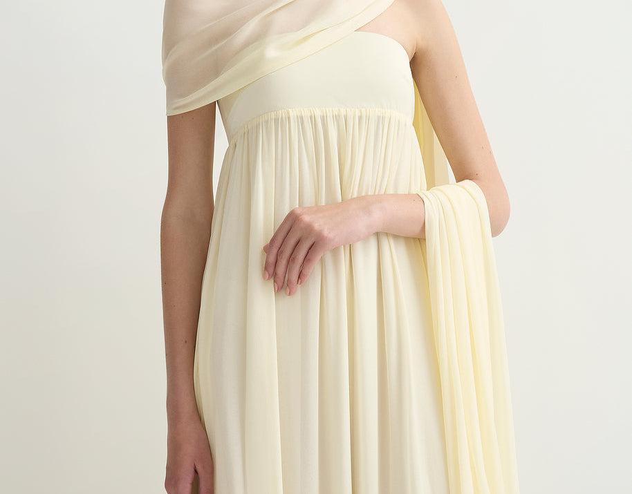 Introducing Posse's Solene Strapless Dress in Butter Yellow, a strapless maxi dress silhouette in the color butter yellow. Designed in a semi-sheer chiffon, with a contrasting bodice and a gathered skirt that drapes gracefully to the ankle, featuring an additional scarf for styling, and finished with a babylock hem twist detail. Perfect for a day-to-evening event dressing.