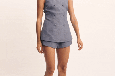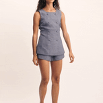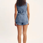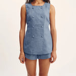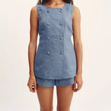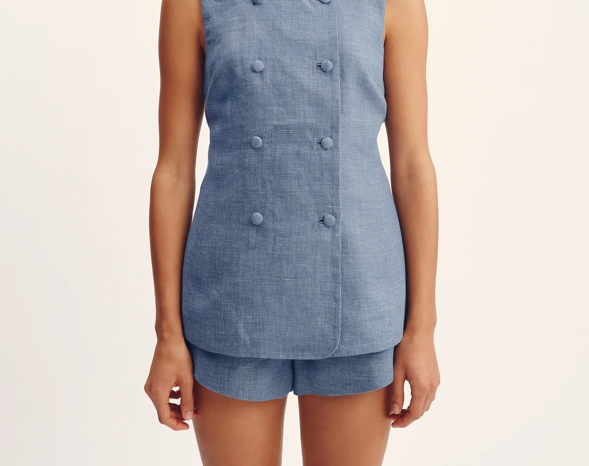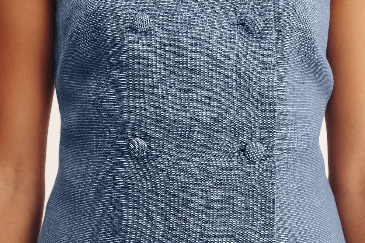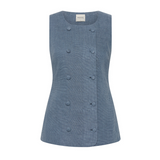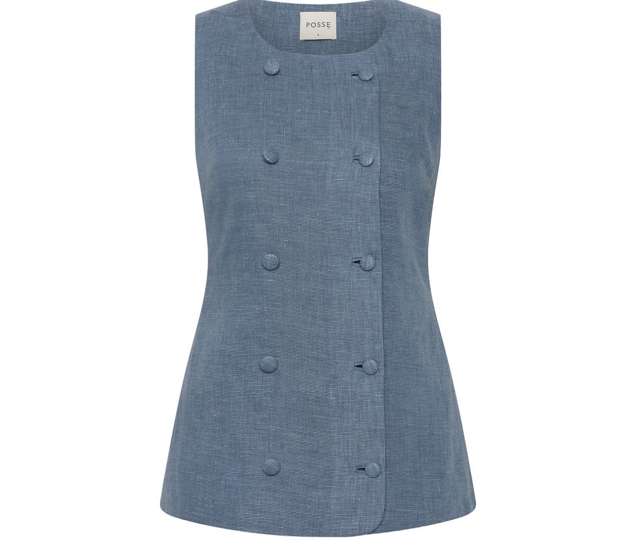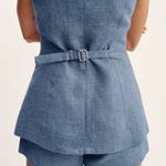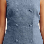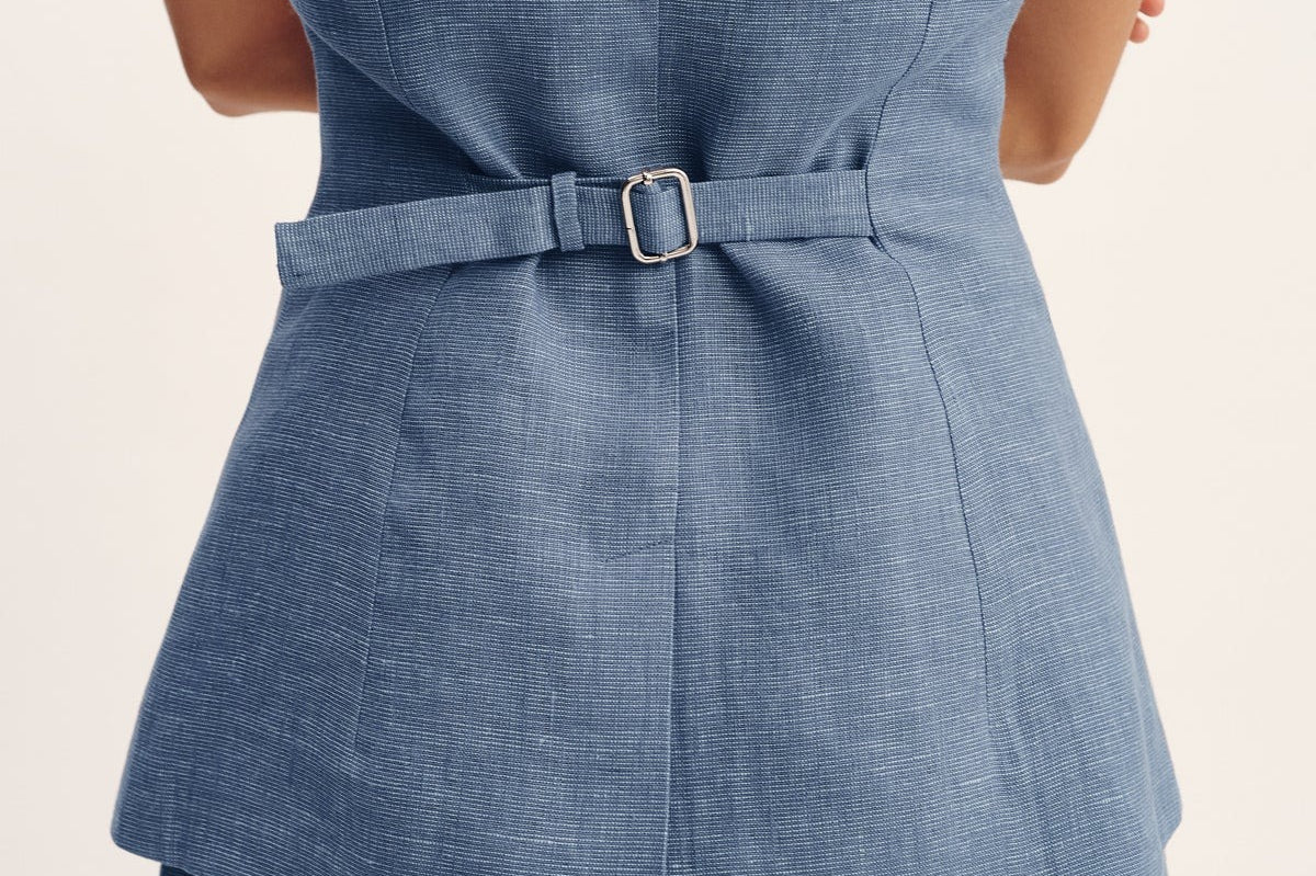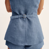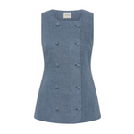 Introducing the Thea Vest in Steel Blue, crafted from premium linen for a tailored yet relaxed feel. This sleeveless style features a high scoop neckline, a double-breasted button front, and a signature buckle fastening at the back to adjust the fit. Finished with a scoop hem and back vent for ease of movement.