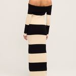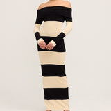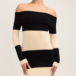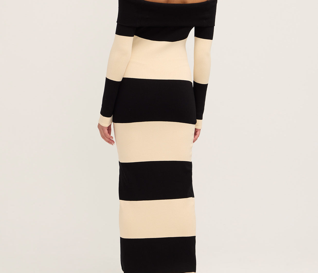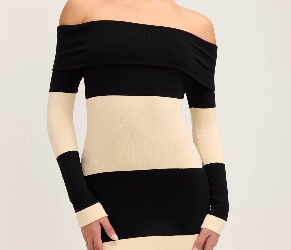 Taking cues from the beloved Theo Dress, the Theo Off The Shoulder Dress is patterned with classic bone and black stripes and is designed for a close, comfortable fit. The figure-hugging silhouette makes it perfect for layering during the cooler months.