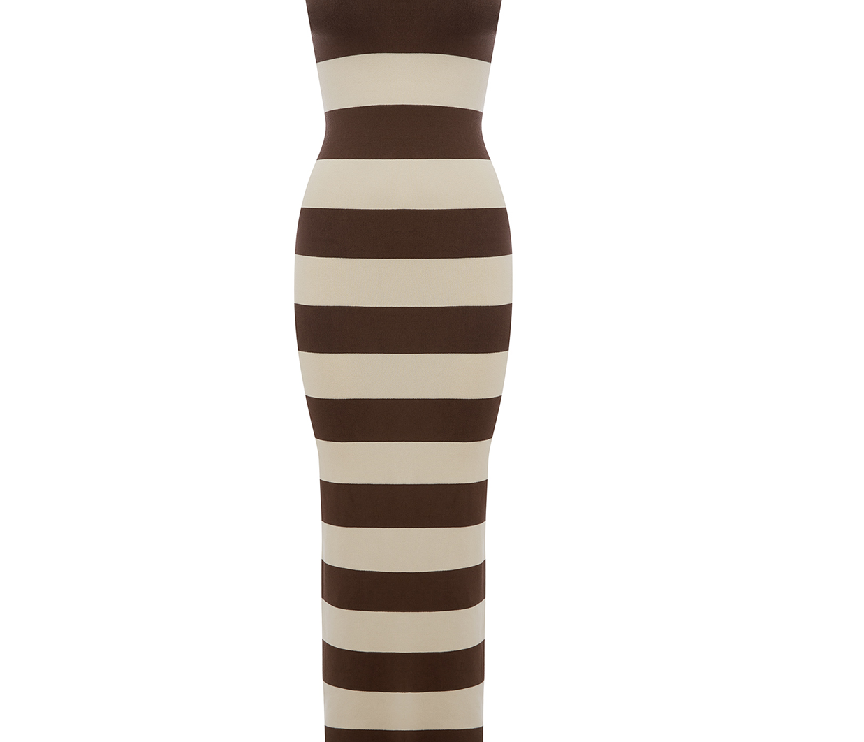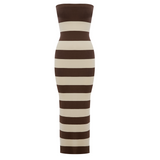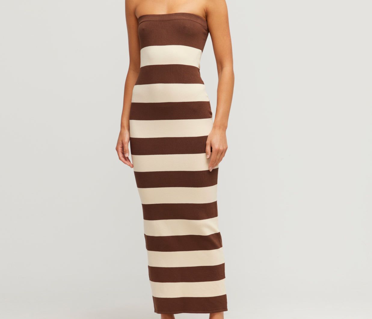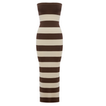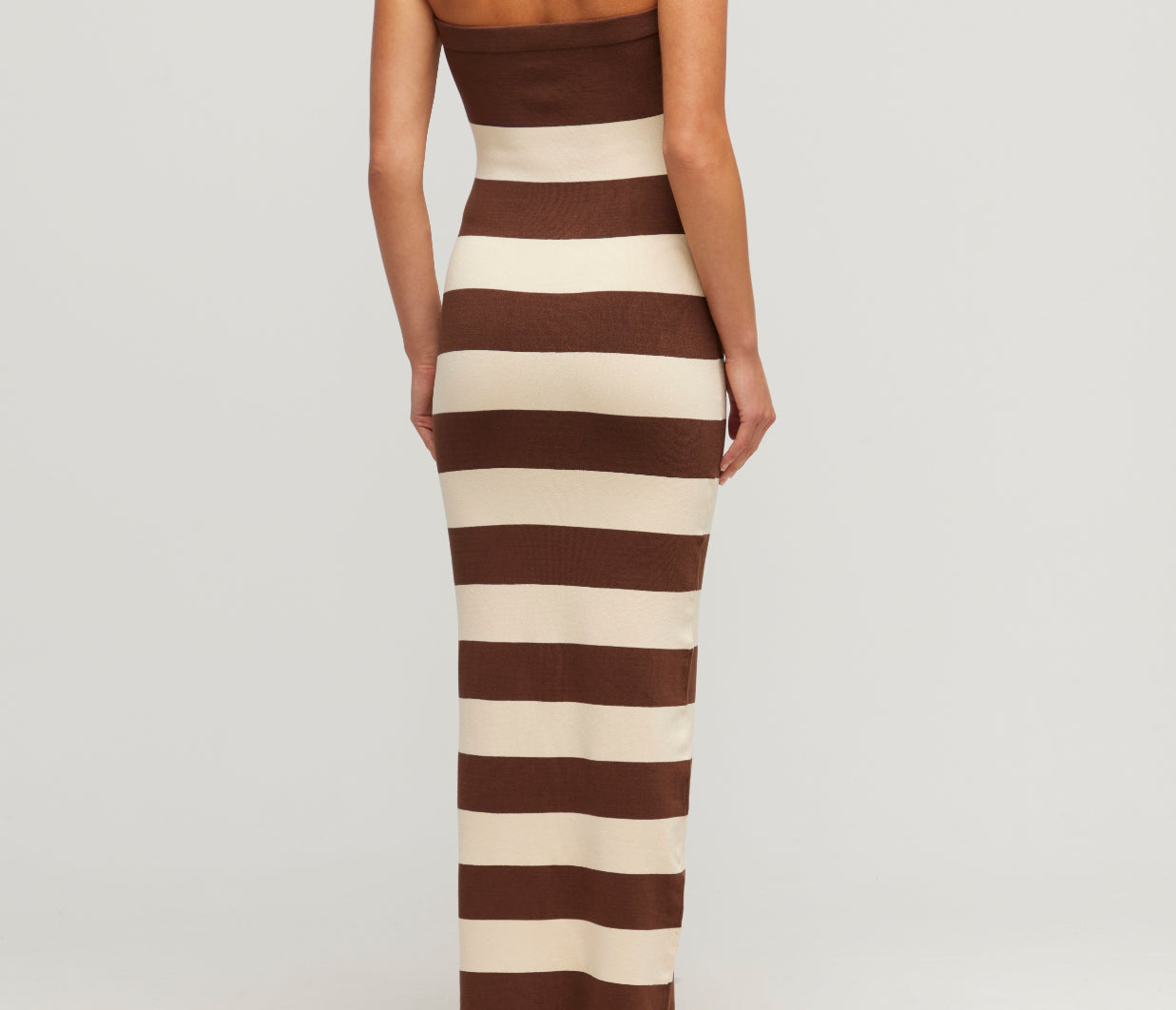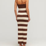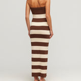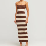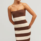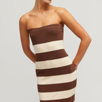 The Theo Dress in Chocolate and Cream boasts a strapless silhouette that is both elegantly timeless and chic. Adorned with classic chocolate and cream stripes, it is skillfully designed for a close, figure-hugging fit. Pair with a heeled sandal and a simple gold earring for the perfect beach to bar ensemble.