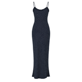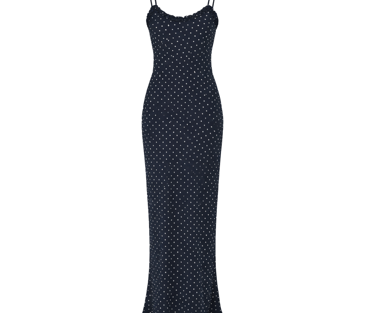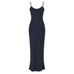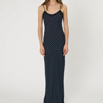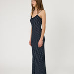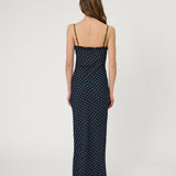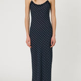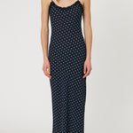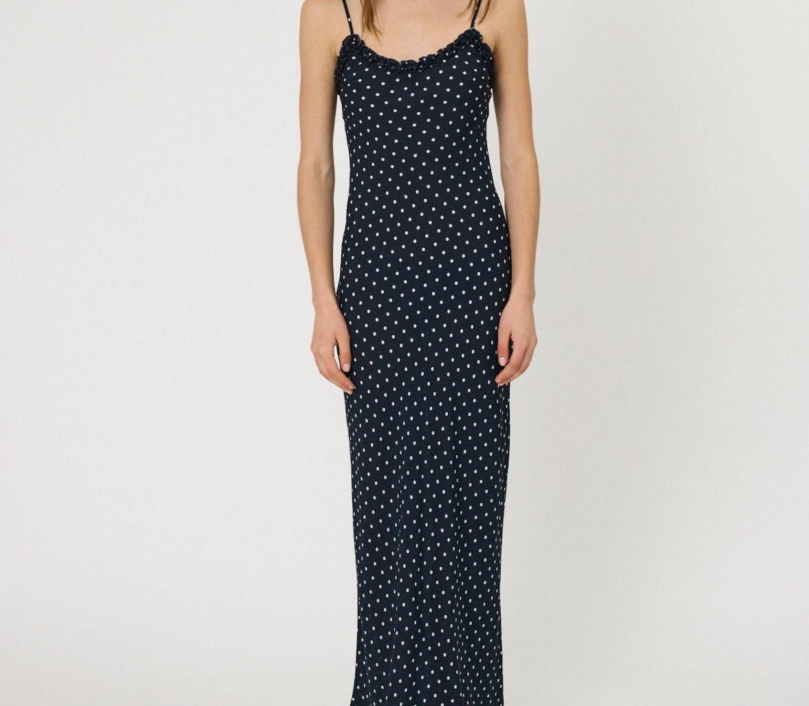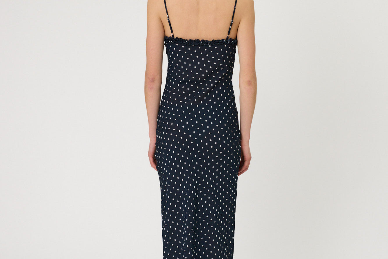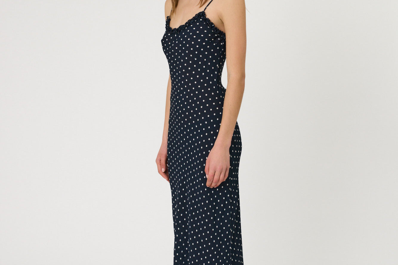 Introducing RMN Studios Sienna Maxi Dress in Indigo Spot, a slip-on maxi-length dress silhouette in a polka dot print. Designed with a cut-bias silhouette in silk, the Sienna dress features spaghetti straps and ruffled neckline detailing and drapes to ankle length. A classic feminine piece, perfect for effortless summer days.