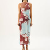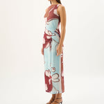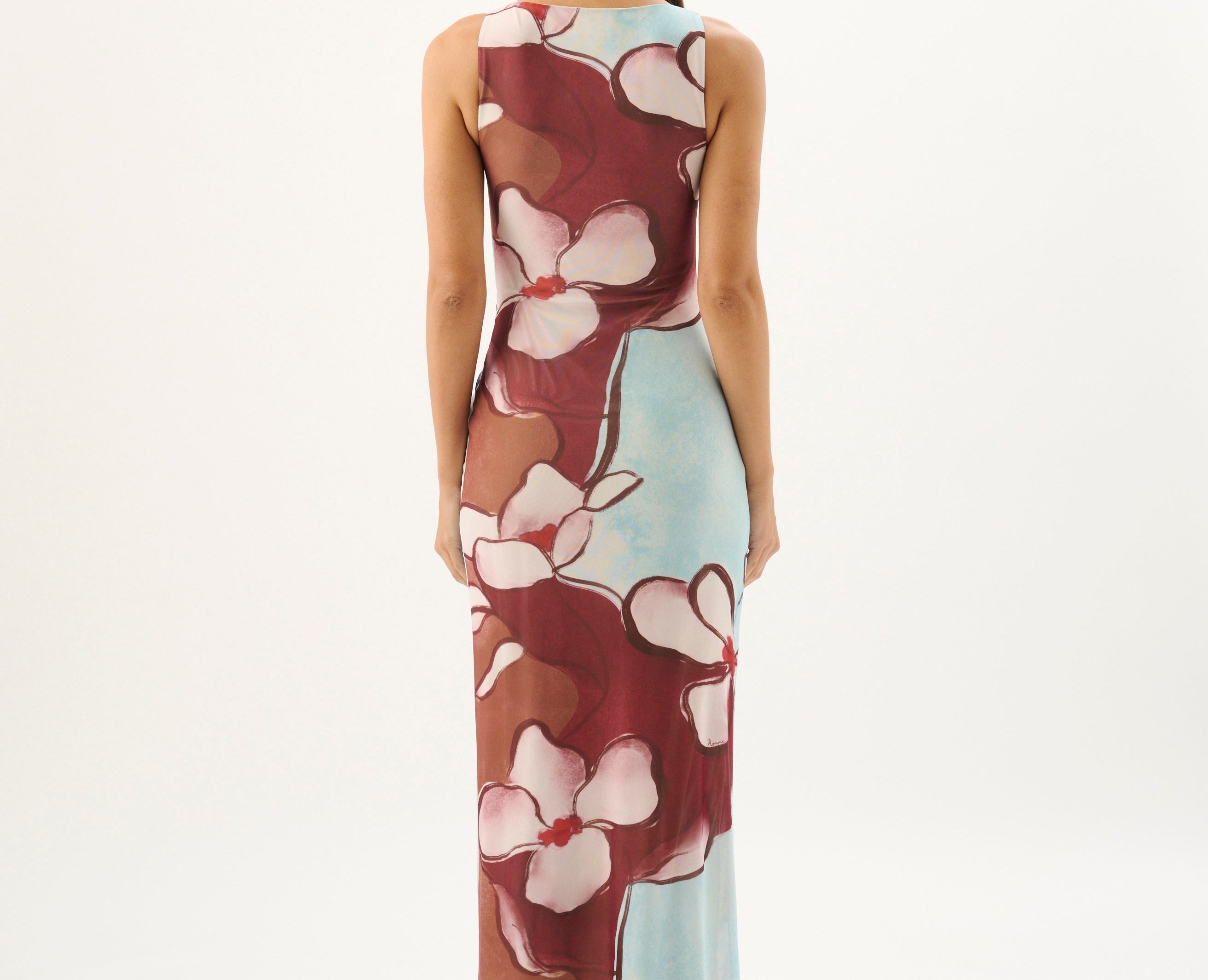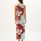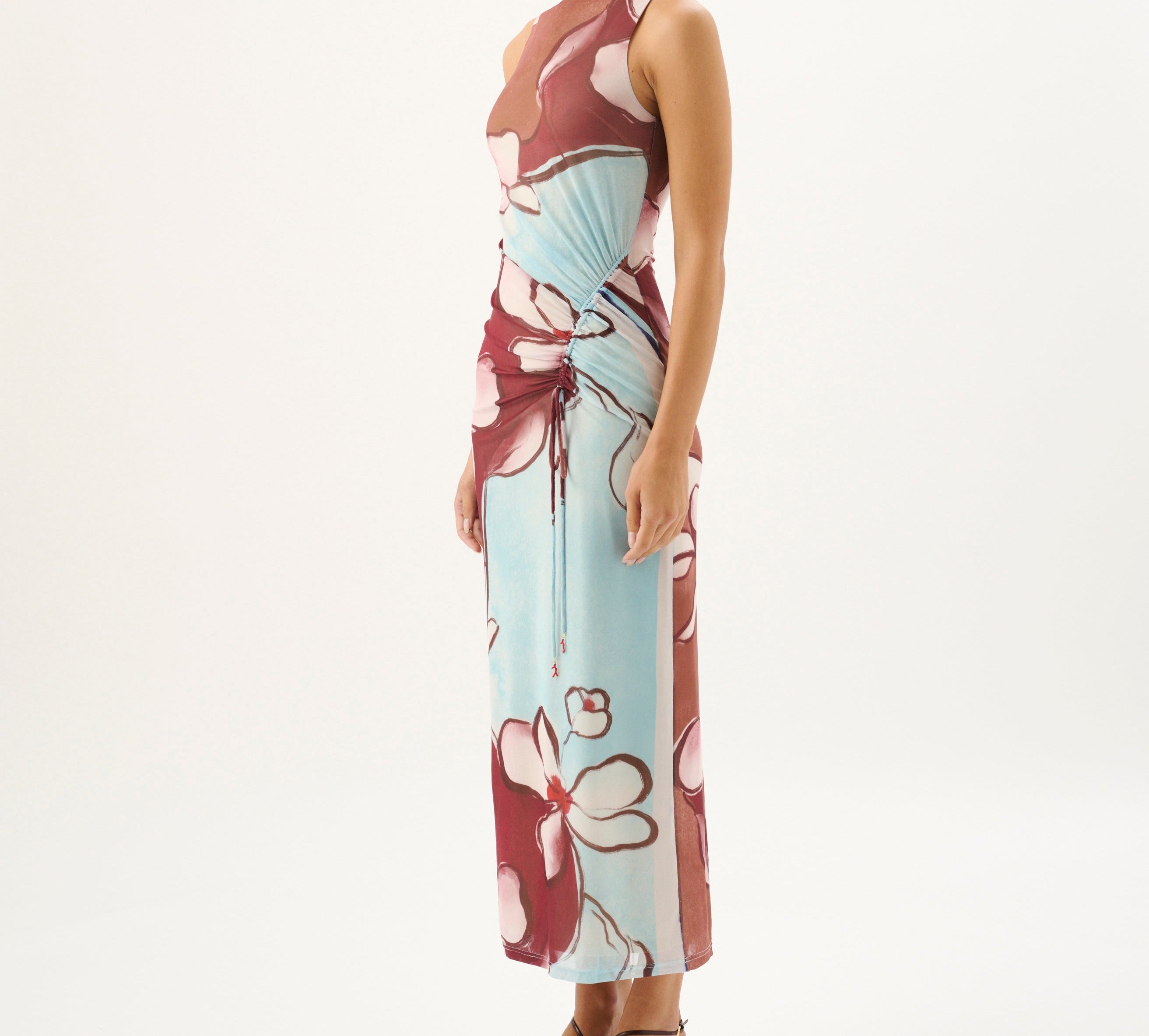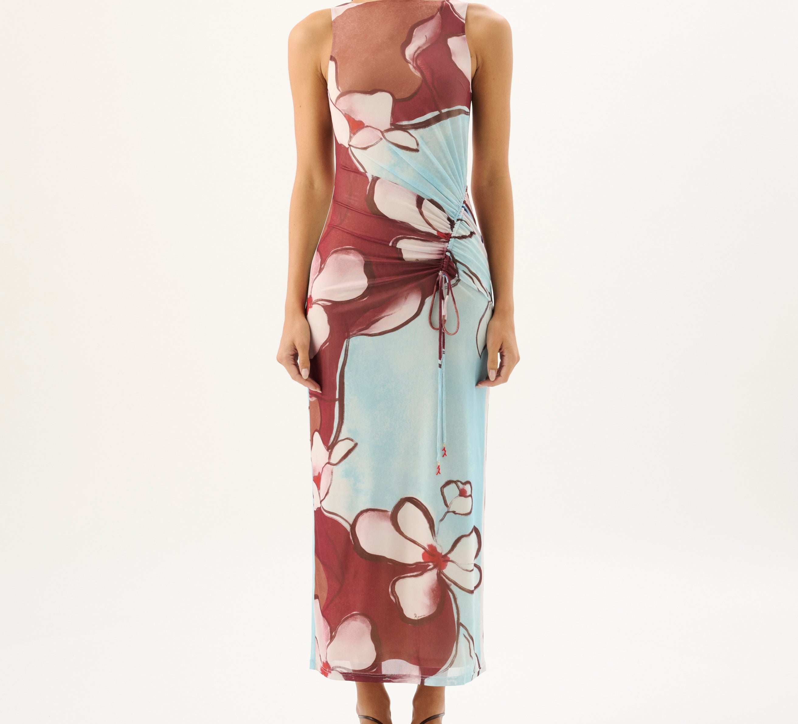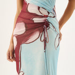 Introducing the Roame’s Avalon Dress in Marisol Bloom, a sleeveless boat neckline mesh maxi dress in ROAME’s exclusive Marisol Bloom print in soft sky-blue and rich maroon hues. This printed mesh maxi Avalon dress showcases a ruched channel with adjustable tie detail that flatters the waist. Fully lined for coverage, the Avalon Dress brings effortless elegance to warm-weather dressing, from day events to evening occasions.