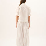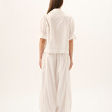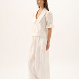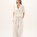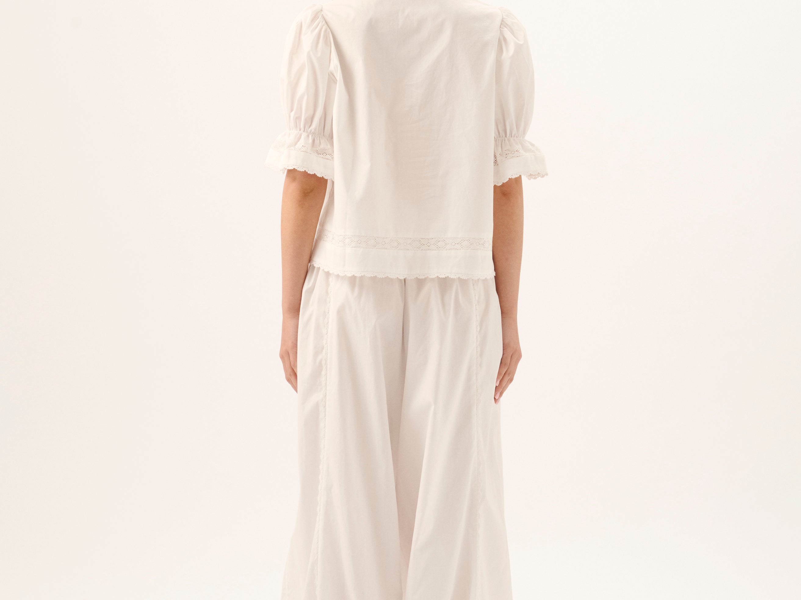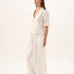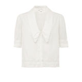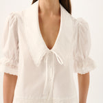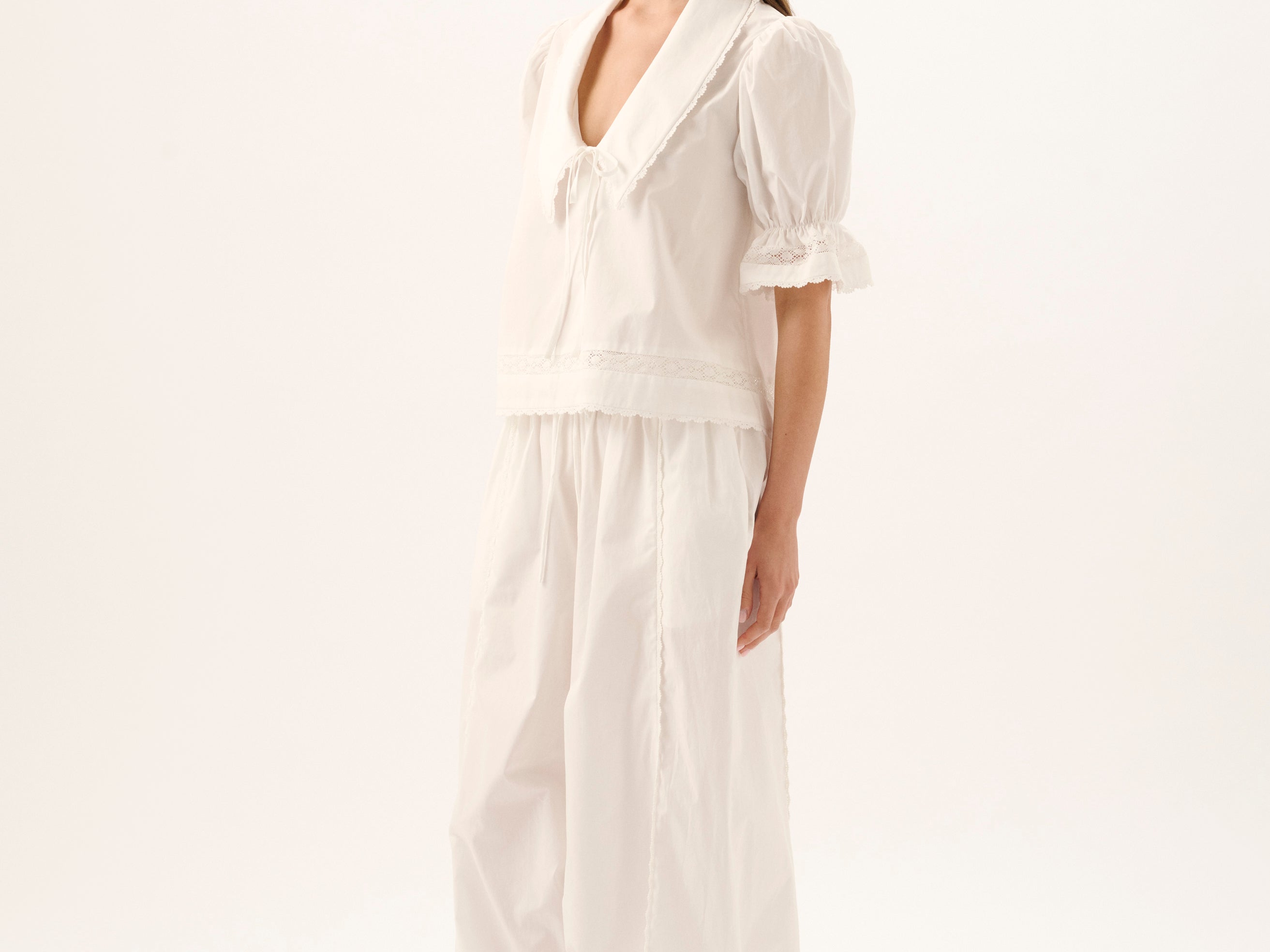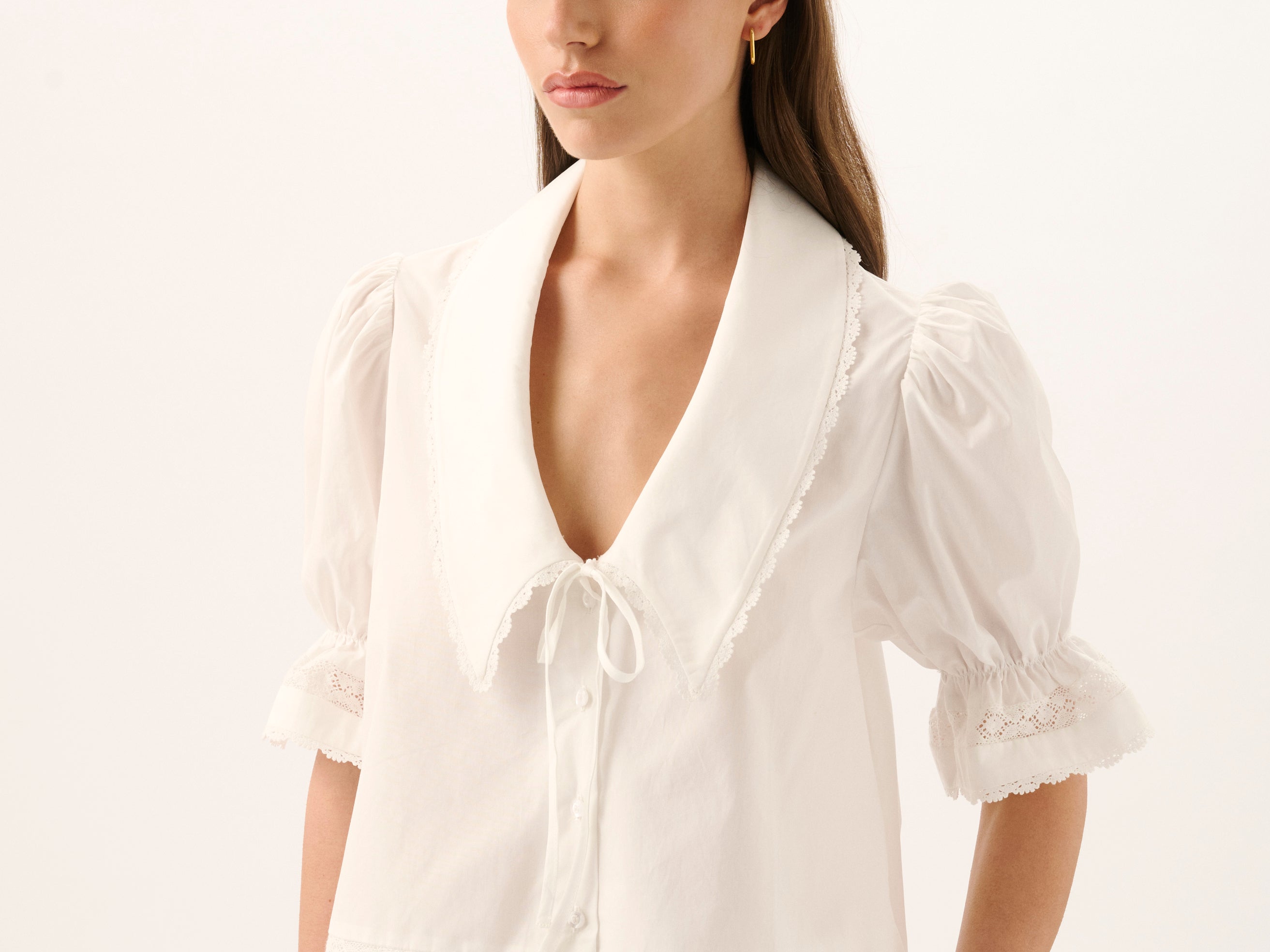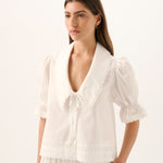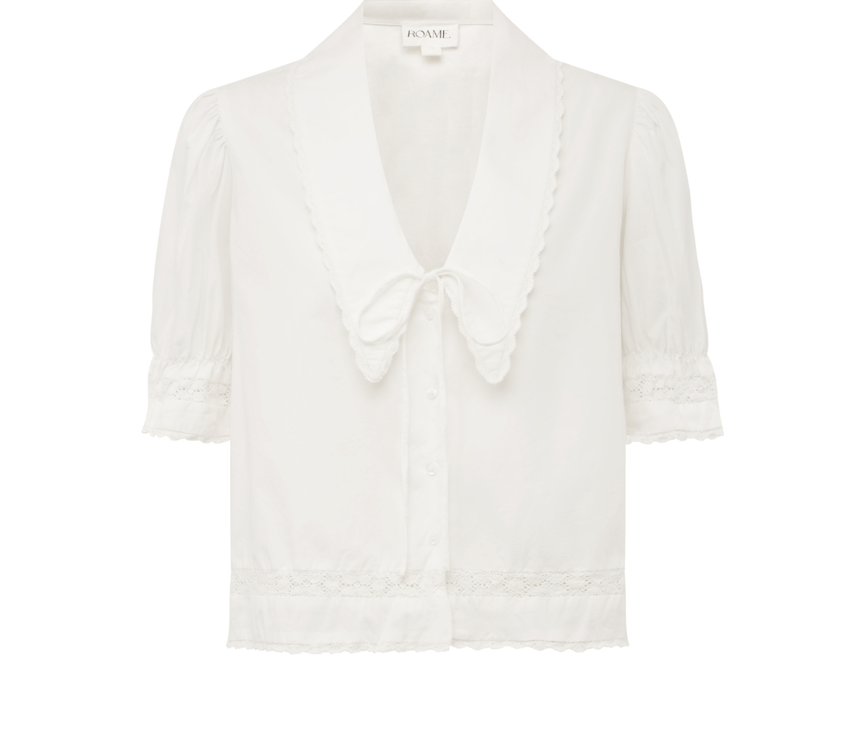 Introducing Roame's Maisie Tie Shirt in White, a short-sleeve shirt silhouette. Designed in crisp cotton, the Maisie shirt features a V-neckline, a point collar with tie detail, and gathered sleeves with subtle lace trim throughout. Pair it with the Maisie pants for a coordinated look.