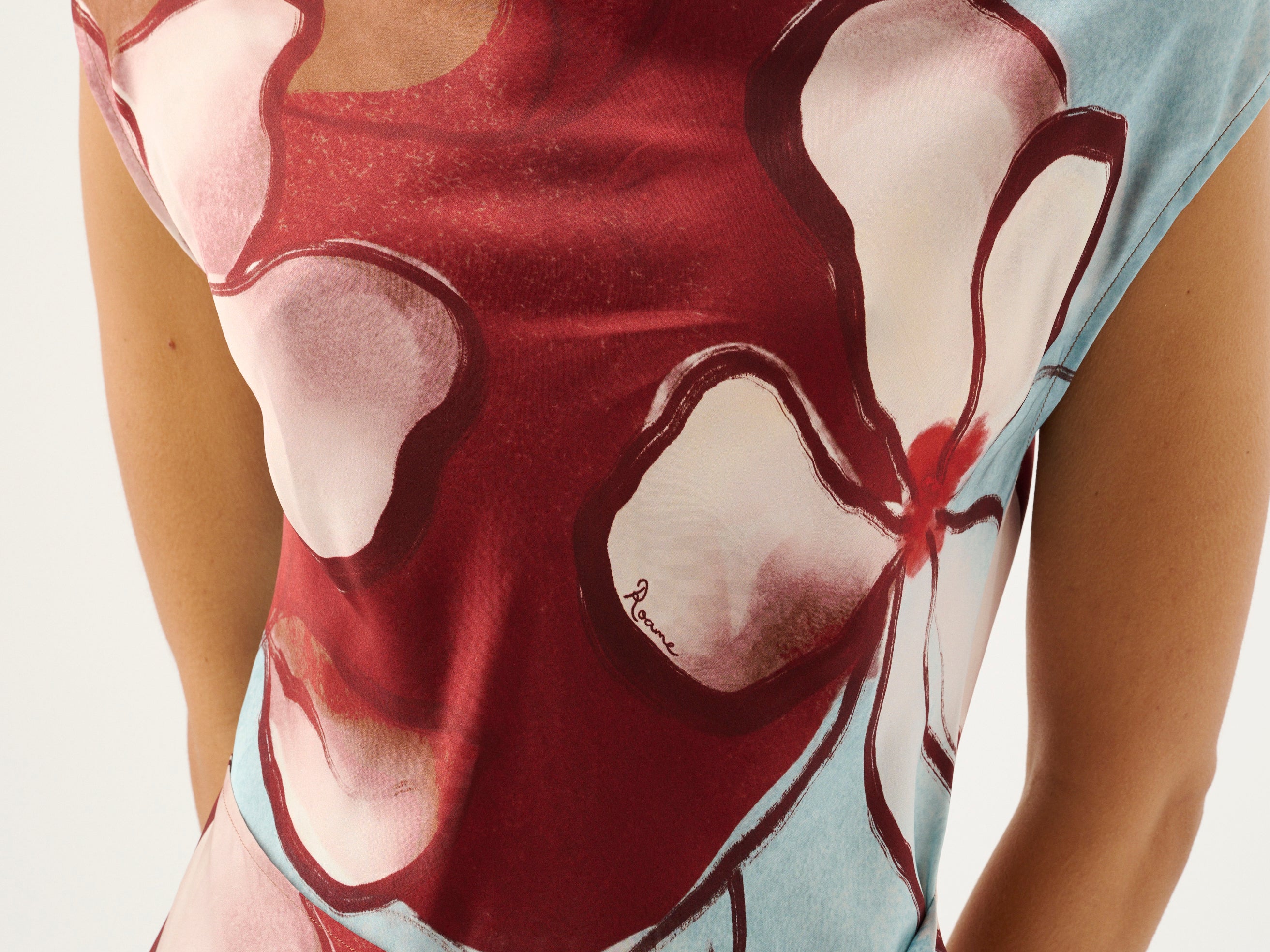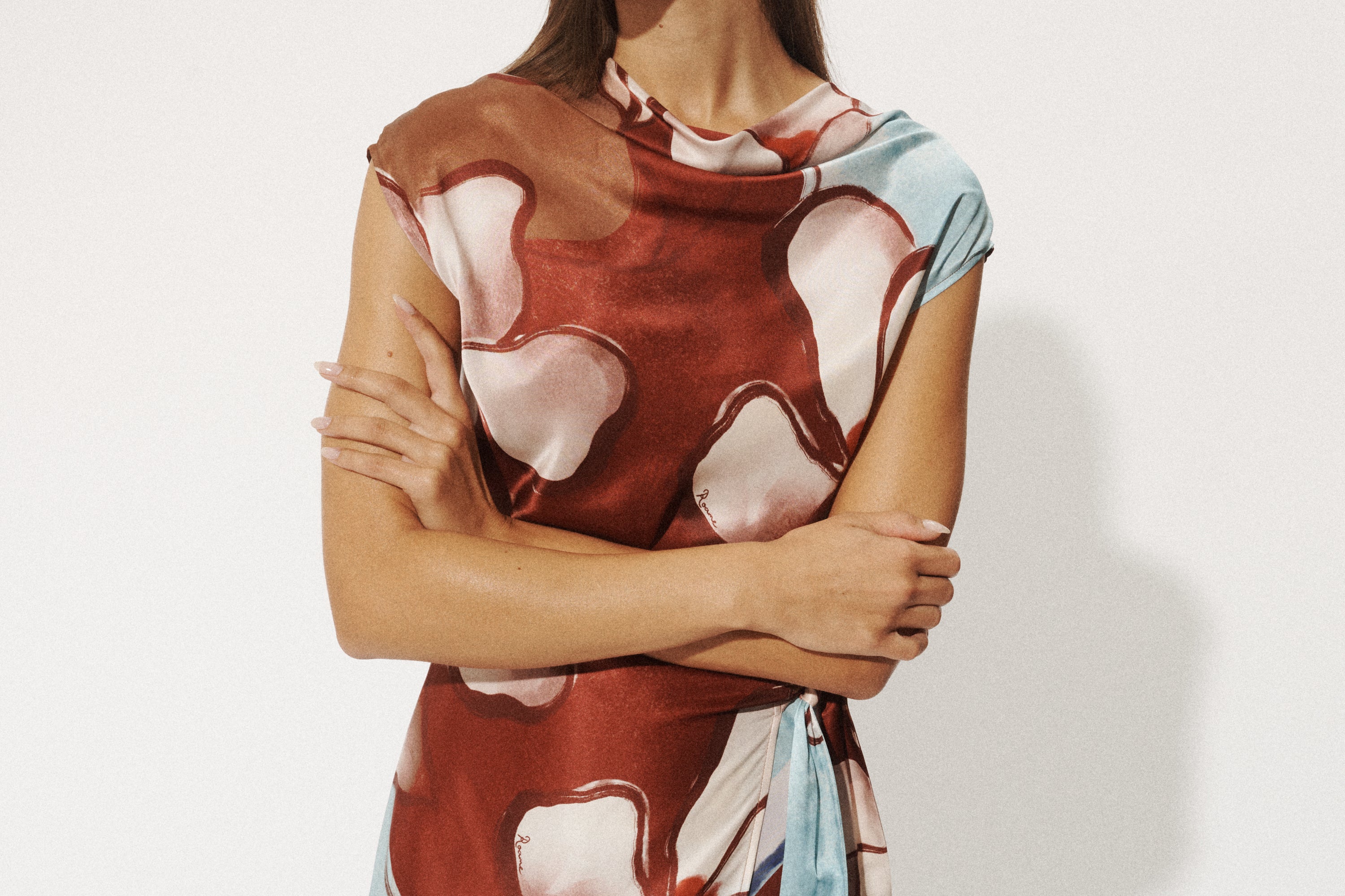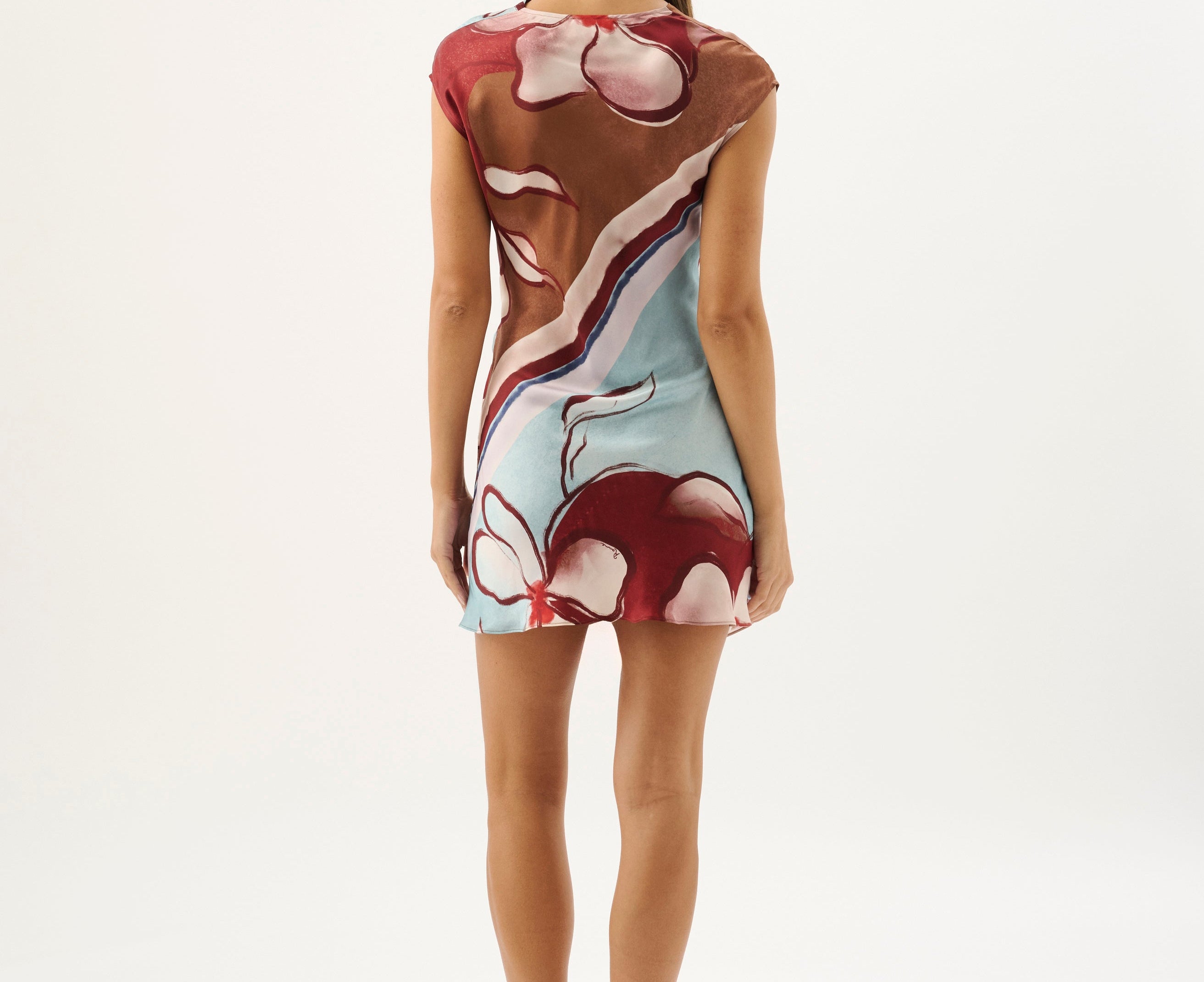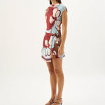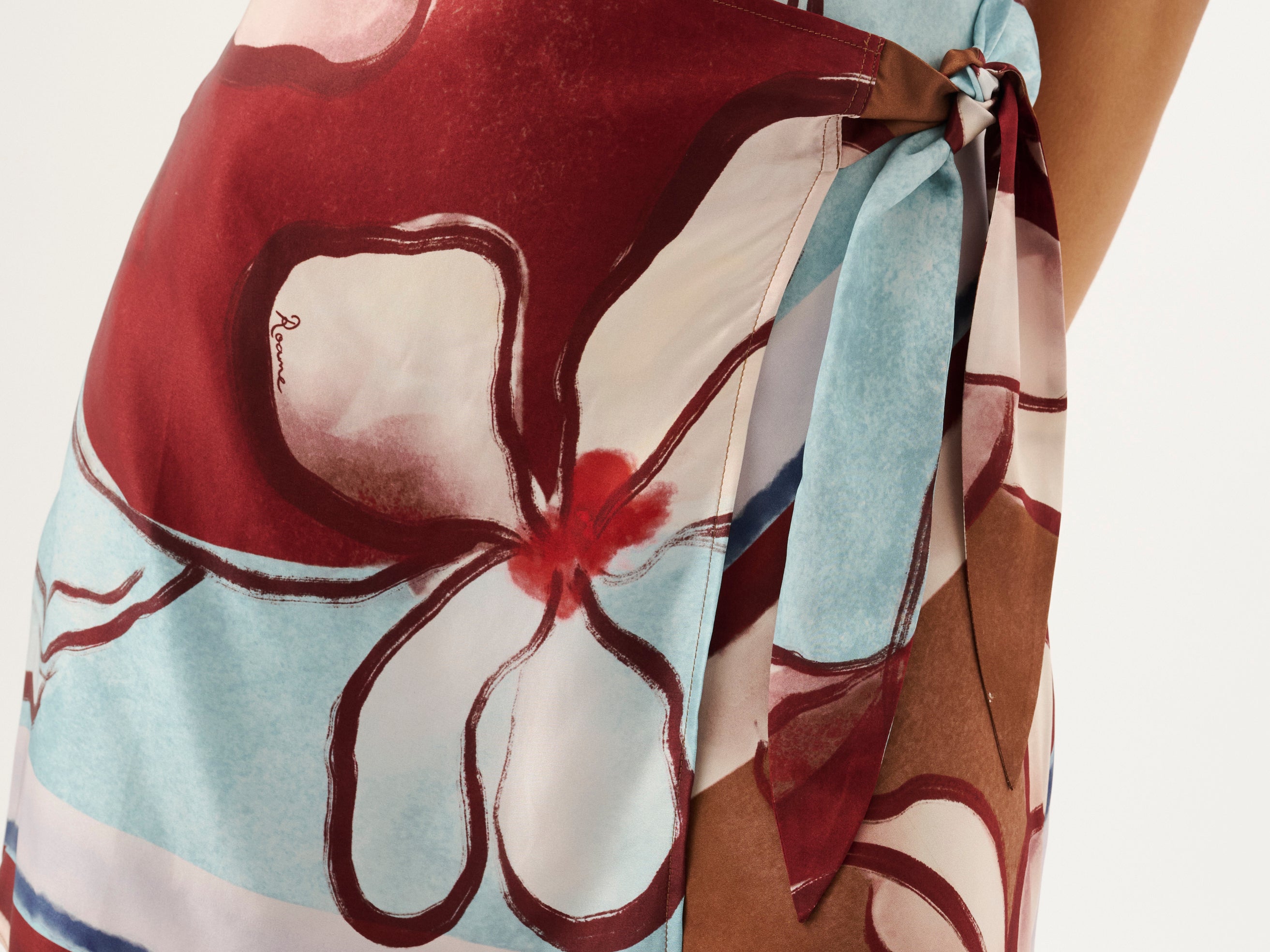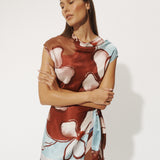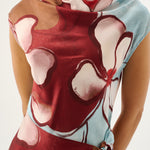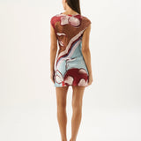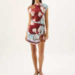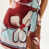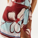 Introducing the Roame’s Remy Mini Dress in Marisol Bloom, a sleeveless mini dress silhouette in ROAME’s exclusive abstract floral print in rich maroon and soft sky-blue hues. Designed with a subtle cowl neckline and short sleeves, this flattering silhouette cinches at the waist with a wrap tie detail. Complete with an invisible back zip for a sleek closure, the Remy Mini Dress transitions seamlessly from daytime occasions to elevated evenings.
