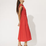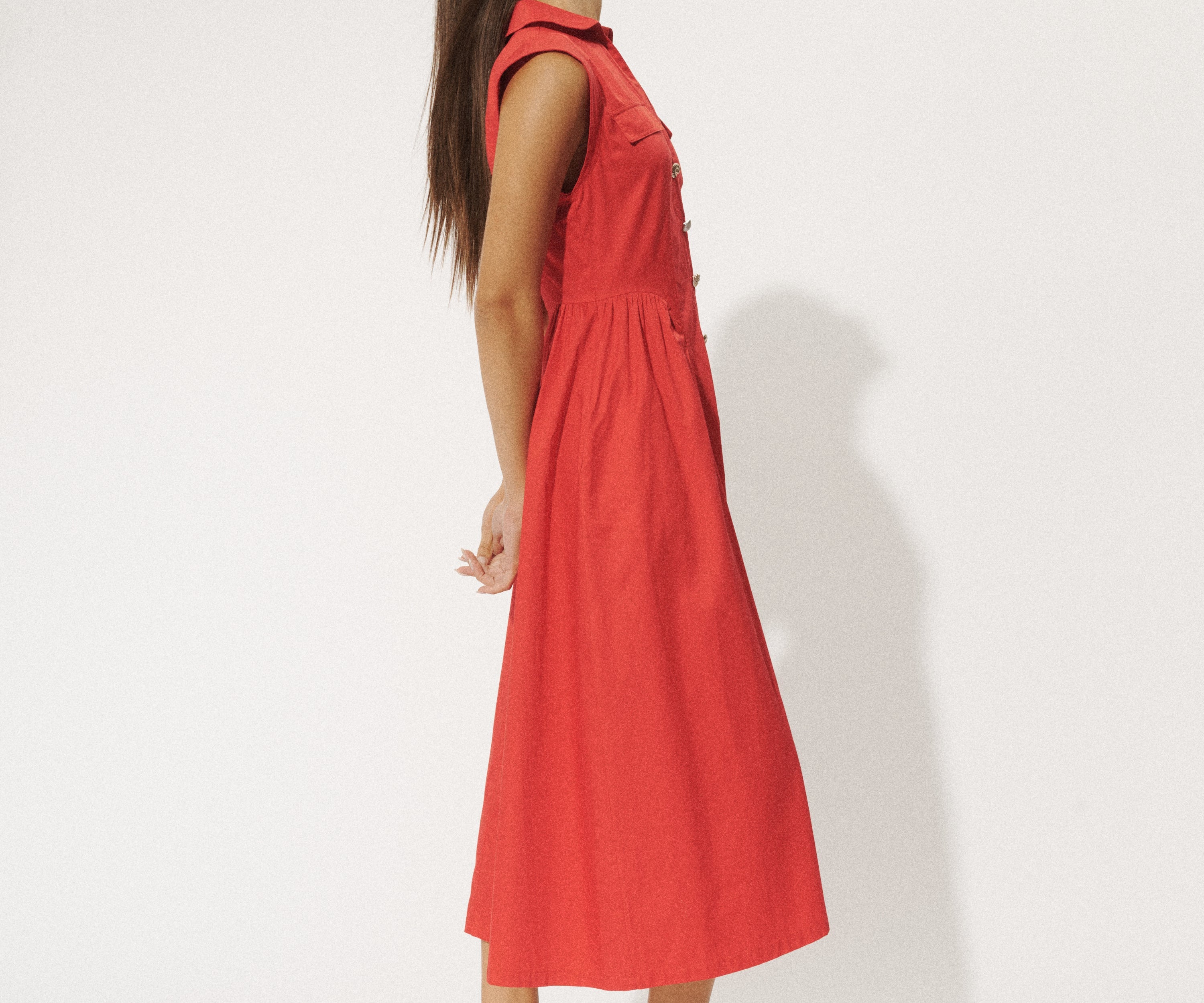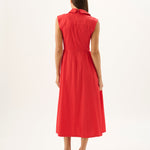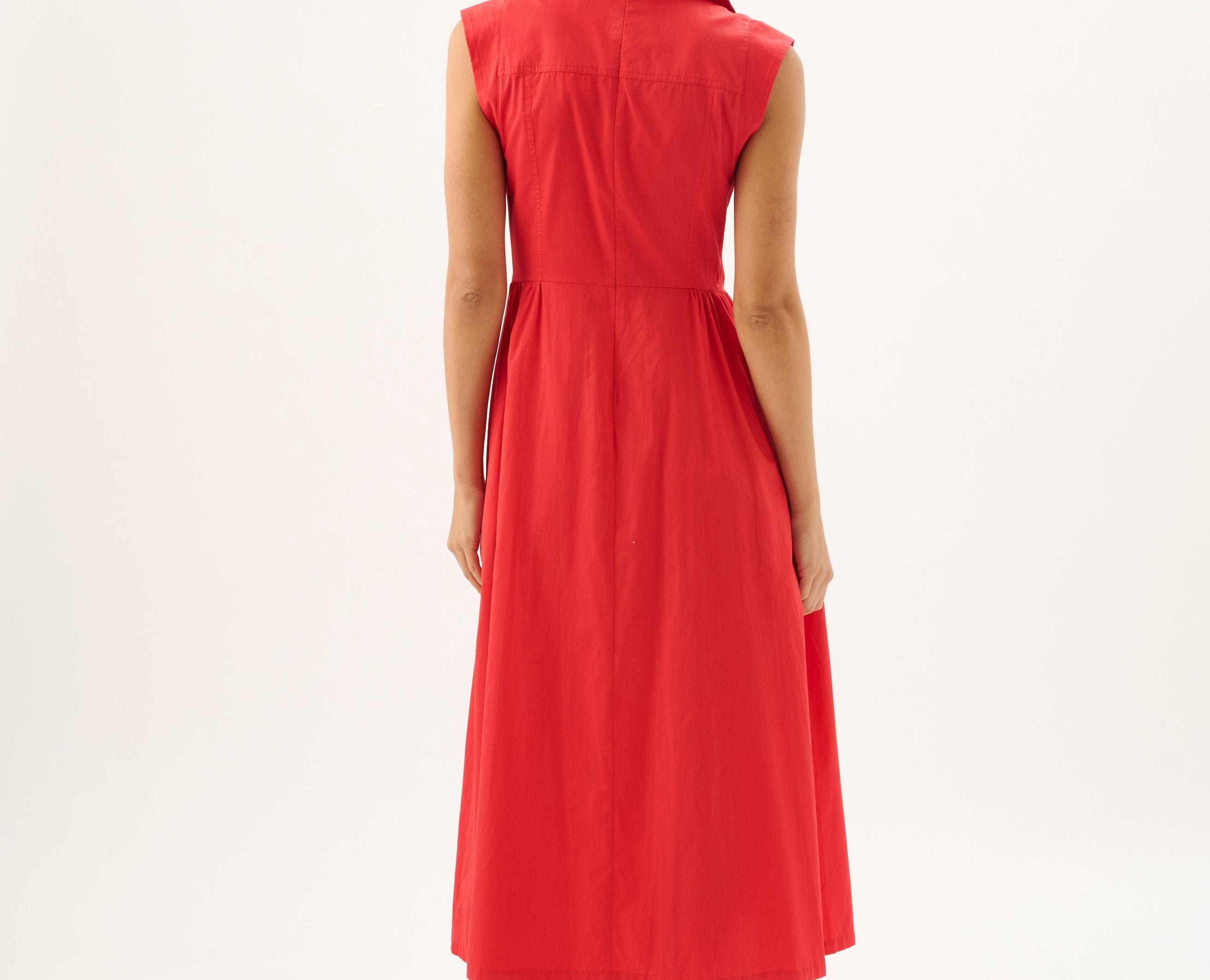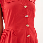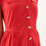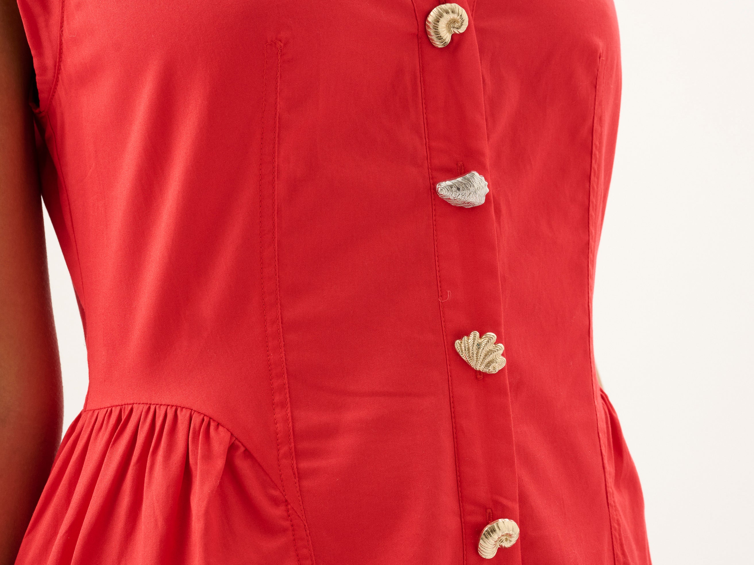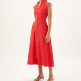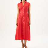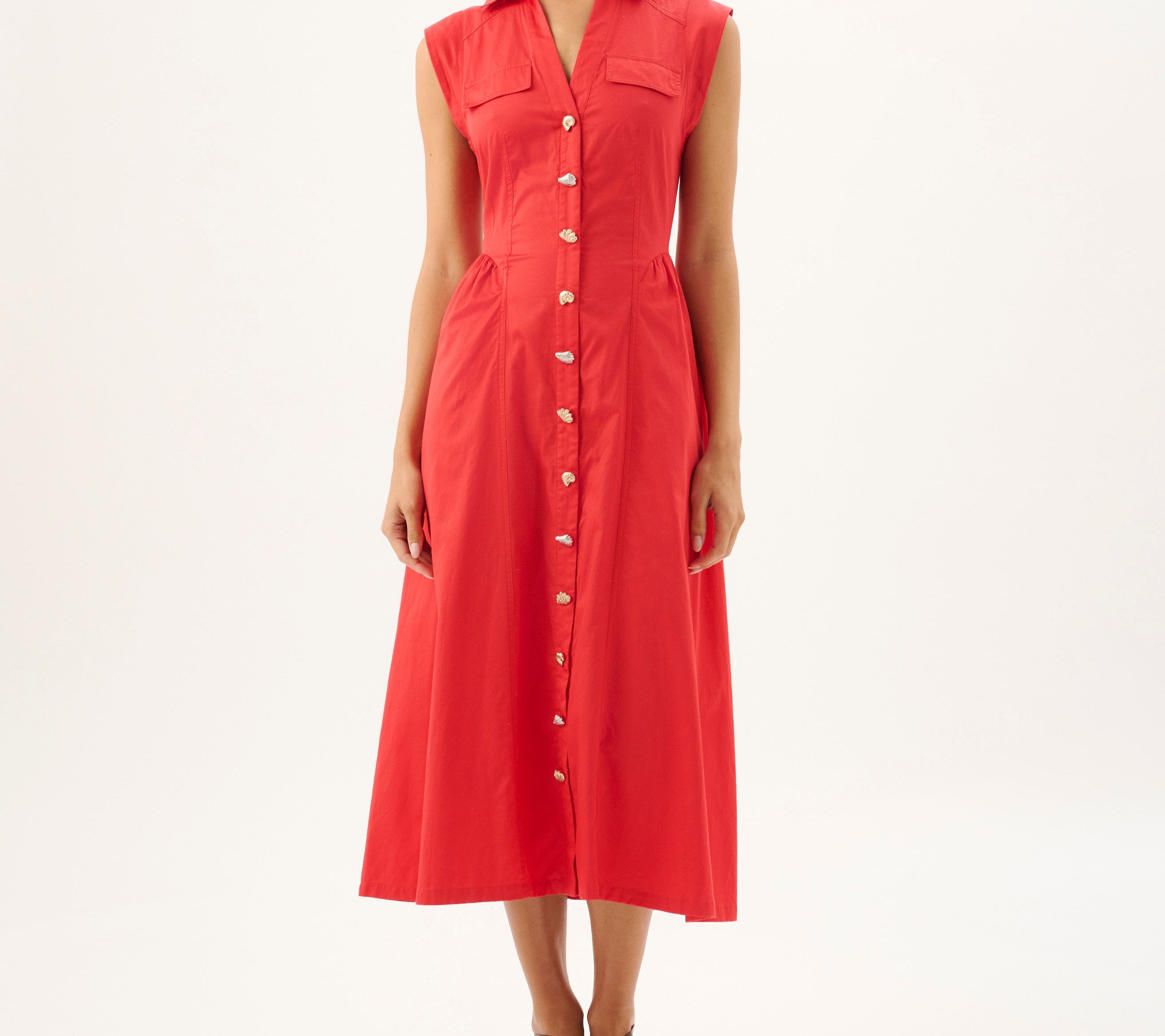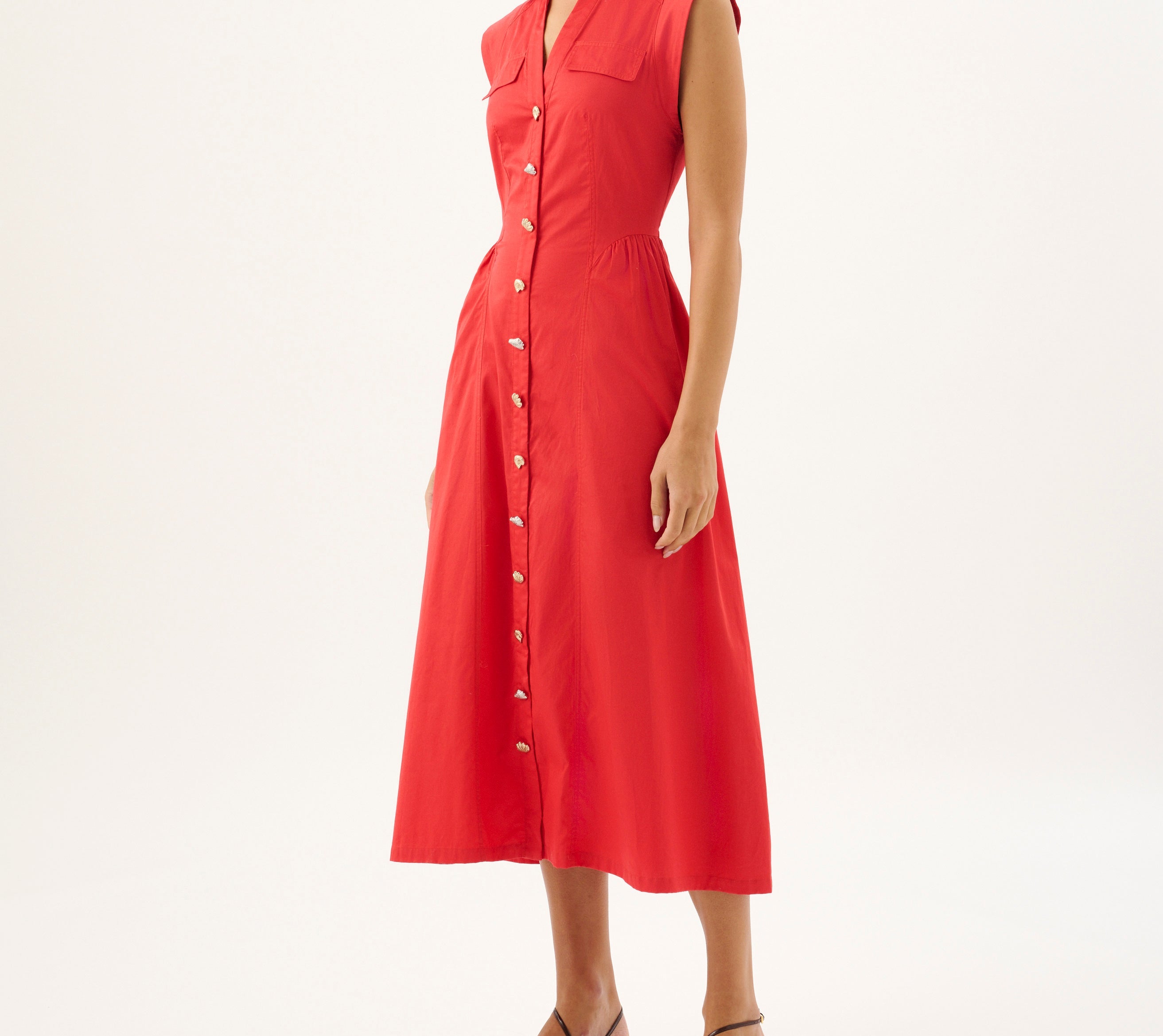 Introducing Roame’s Skylar Midi Dress in Rosso, a tailored button-up midi dress in a vivid red hue. Designed from breathable cotton, this collared midi dress features a V-neckline, cap sleeves, an invisible zip at the back, and a custom button placket adorned with custom shell-inspired hardware. The cinched waist flows into a softly flared, ankle-grazing skirt that balances structure and ease, perfect for day-to-night styling or relaxed vacation dressing.