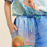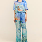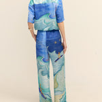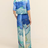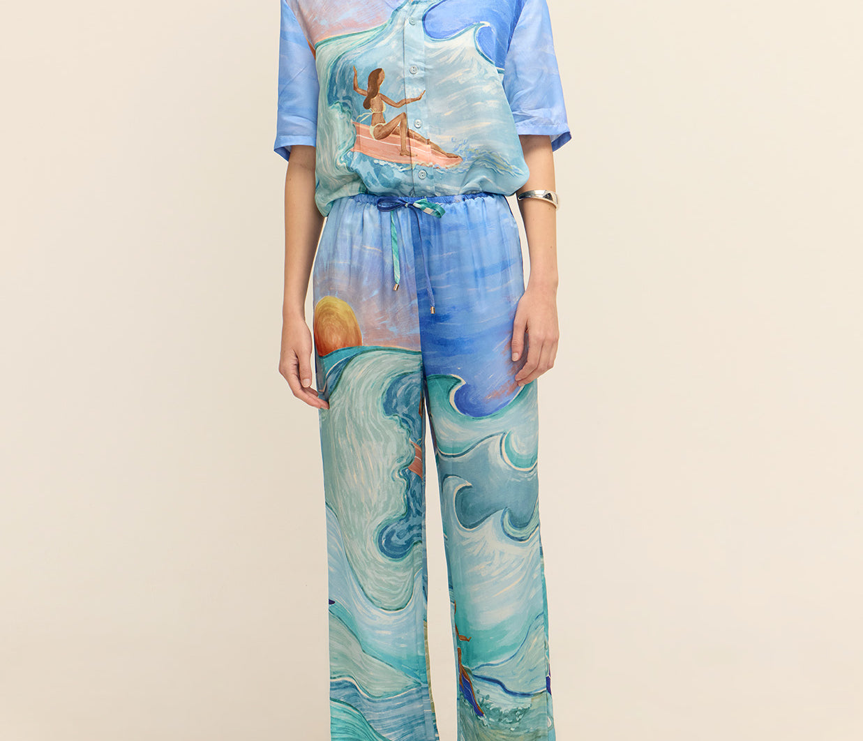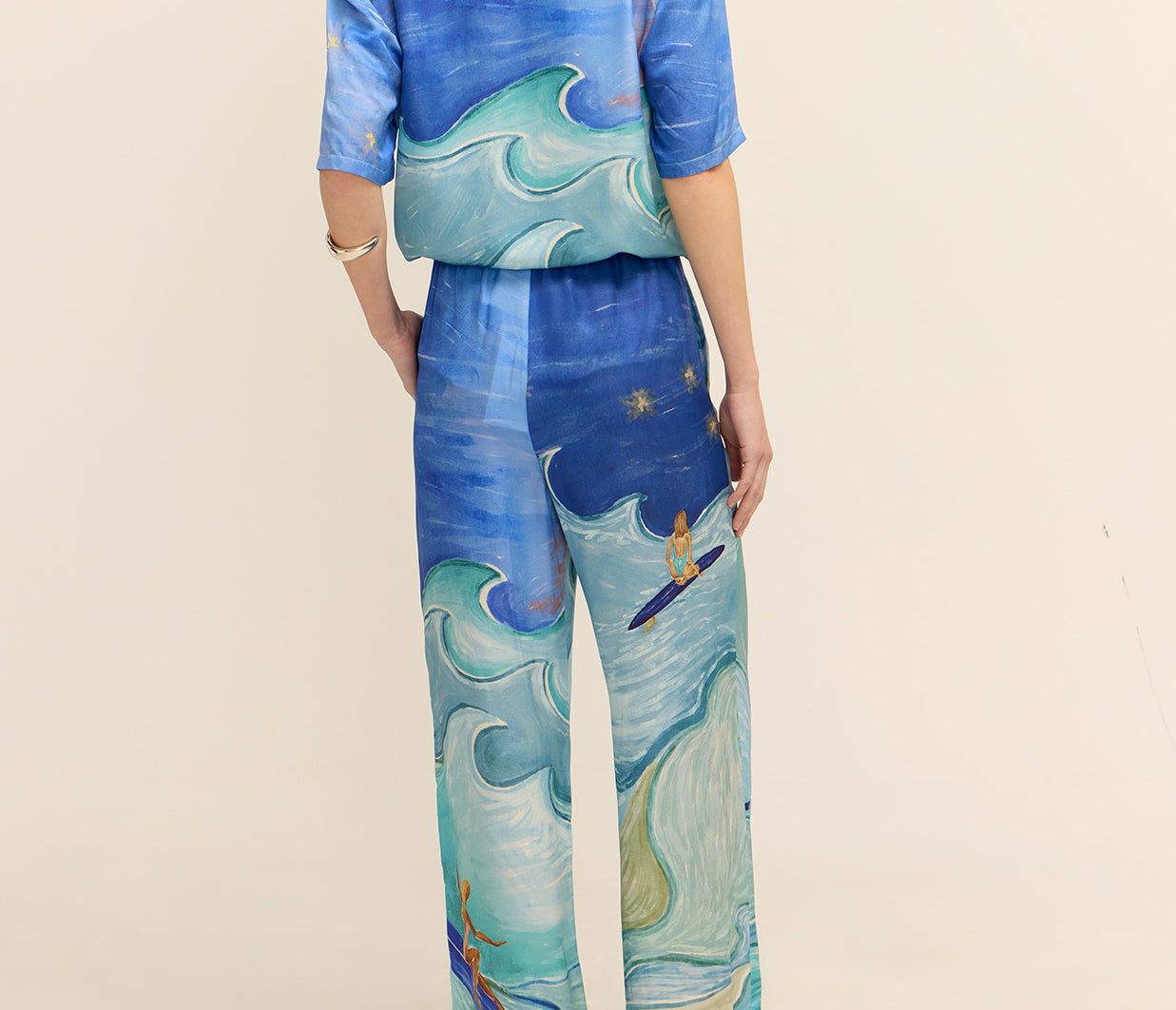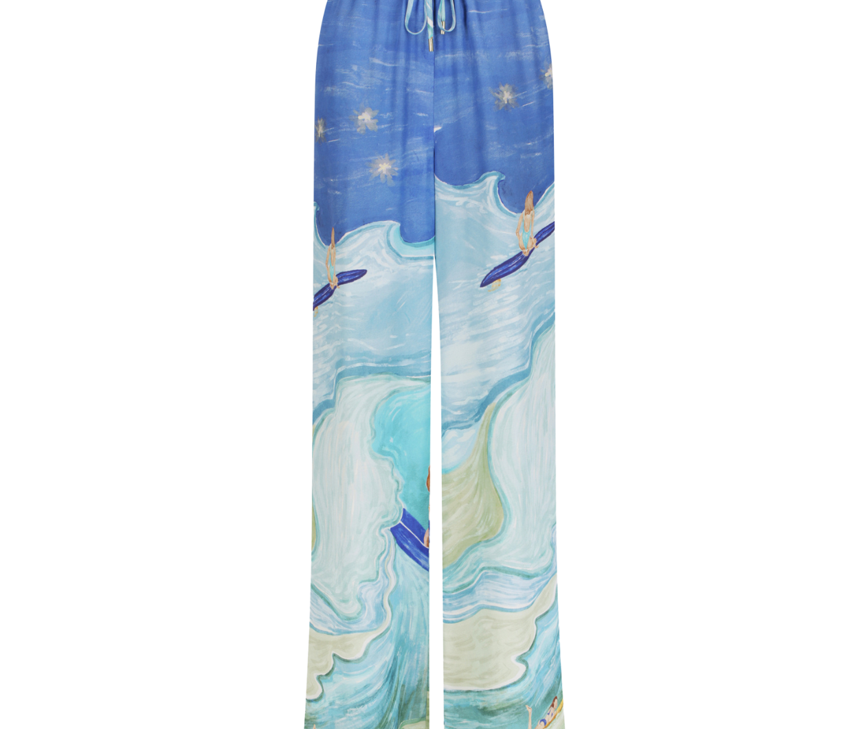 The Taj Pant in Apres Surf by Roame, features the signature surf print in a luxurious silk blend fabrication. Designed with a mid-waisted fit, this pant offers an elasticated waist with a drawstring for adjustable comfort. The relaxed wide-leg shape provides ease of wear with practical side pockets. Complete the look with the matching Brando Shirt in Apres Surf for a coordinated ensemble.