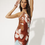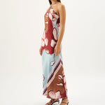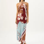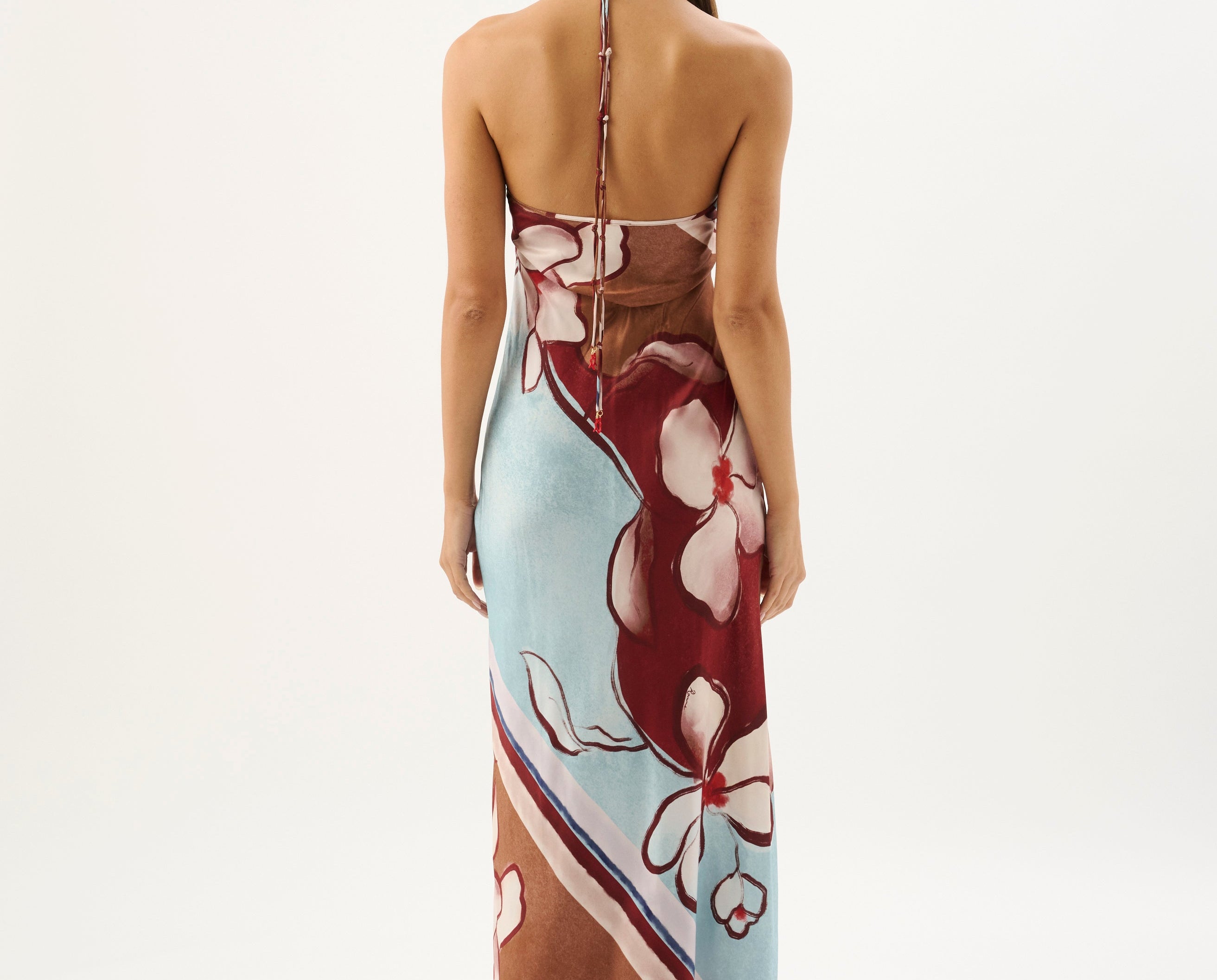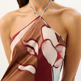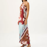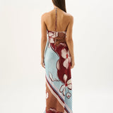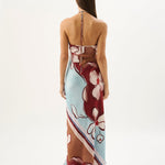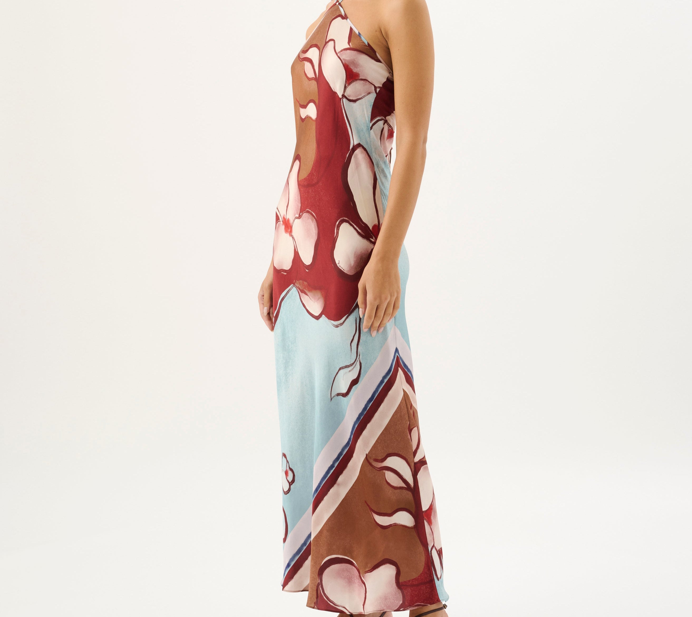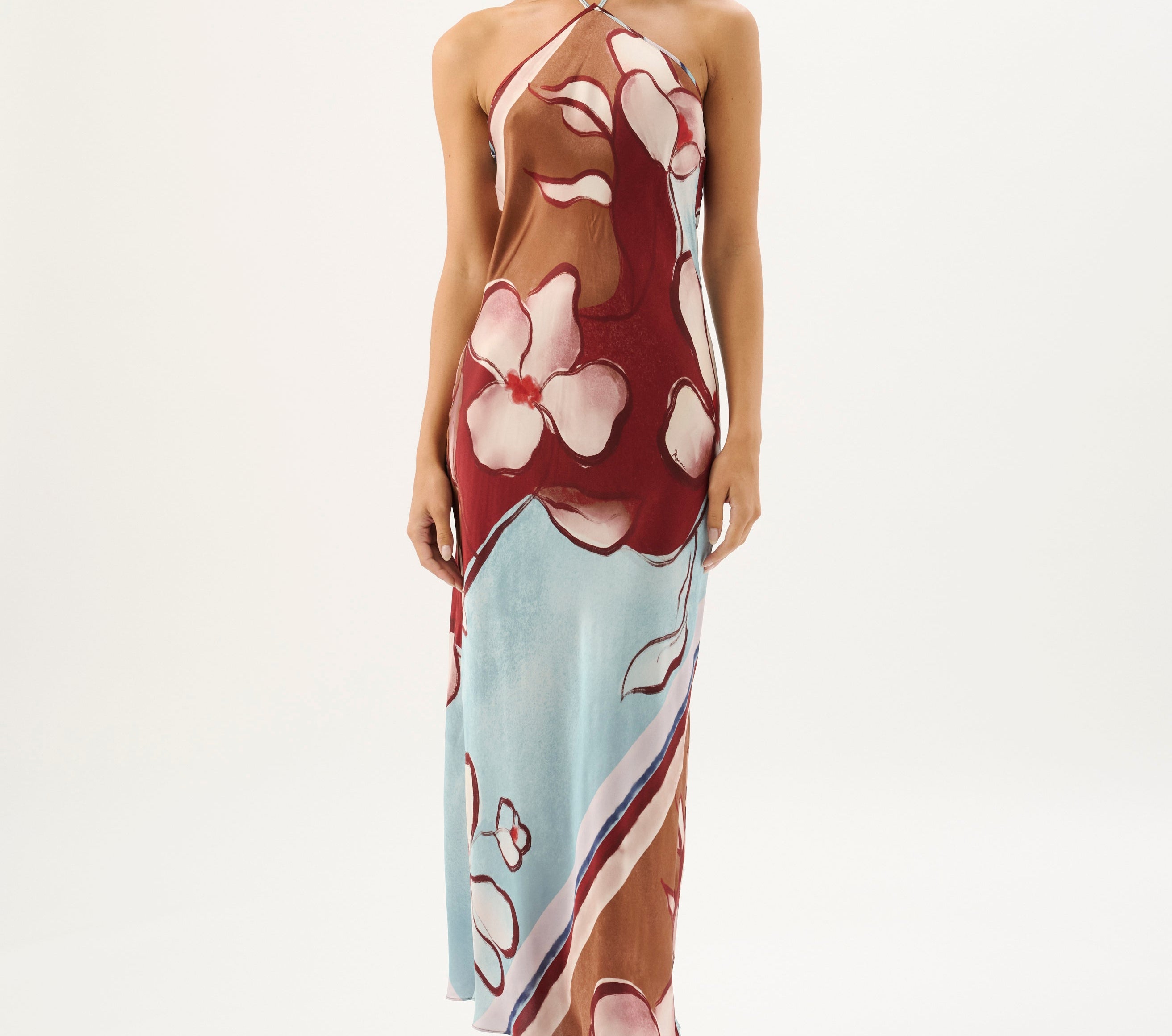 Introducing the Roame’s Tulula Halter Dress in Marisol Bloom, a halter neck maxi dress in ROAME’s exclusive abstract floral print in rich maroon and soft sky-blue hues. Designed with a cut on the bias for a fluid, slip-style silhouette, this halter neck dress drapes elegantly along the body and ties at the neck for a custom fit. Perfect piece for both sun-soaked days and evening occasions.