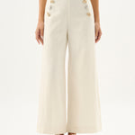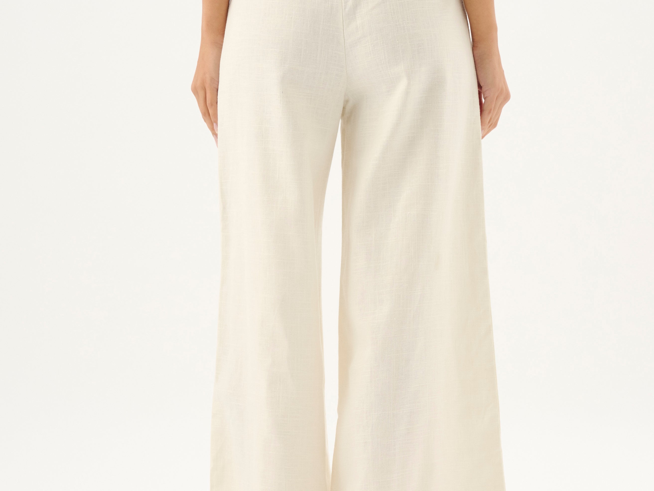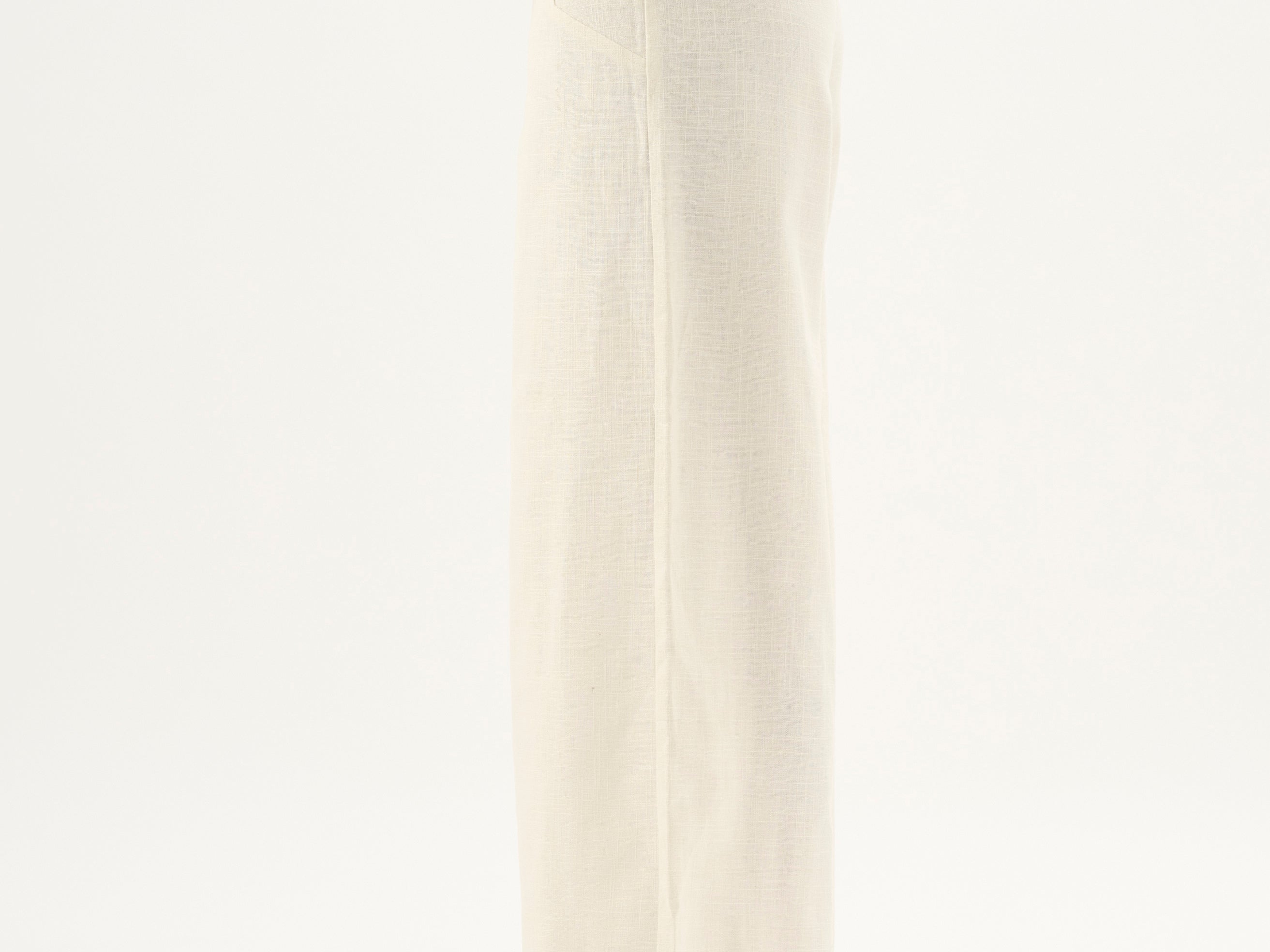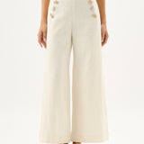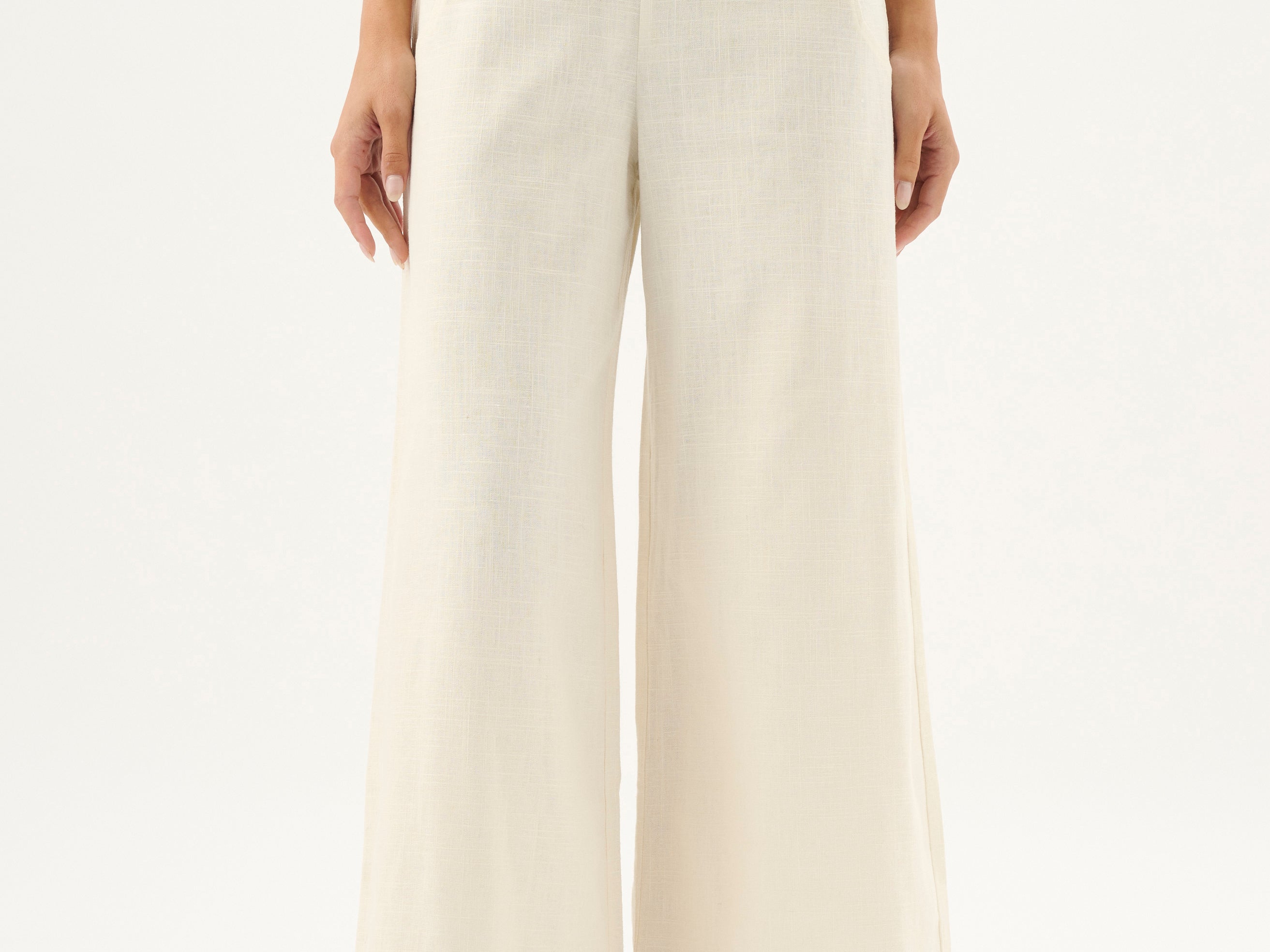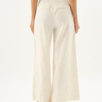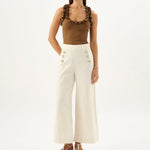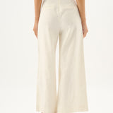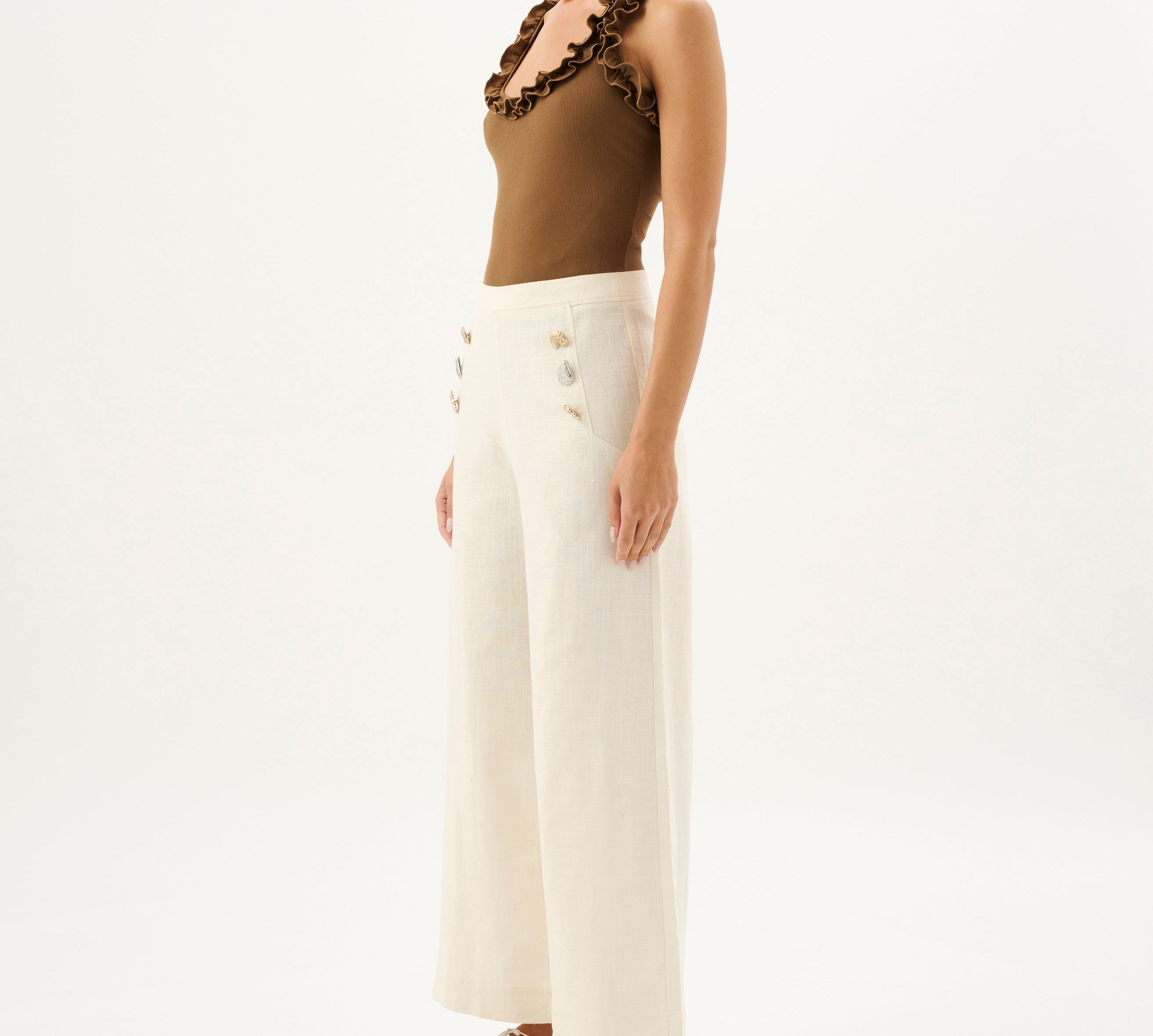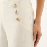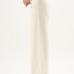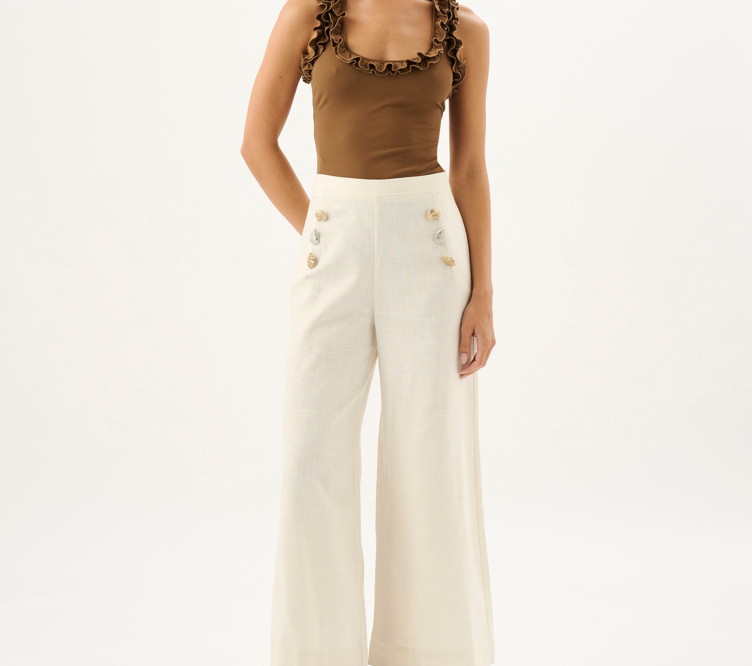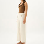 Introducing the Roame’s Waverly Pant in Ecru, a high-waisted wide-leg pant in a soft white hue. Designed in a tailored pants silhouette, it features front seams that elongate the leg and side-seam pockets adorned with custom shell-inspired hardware. Finished with a structured waistband and concealed back zip for a refined, feminine silhouette.