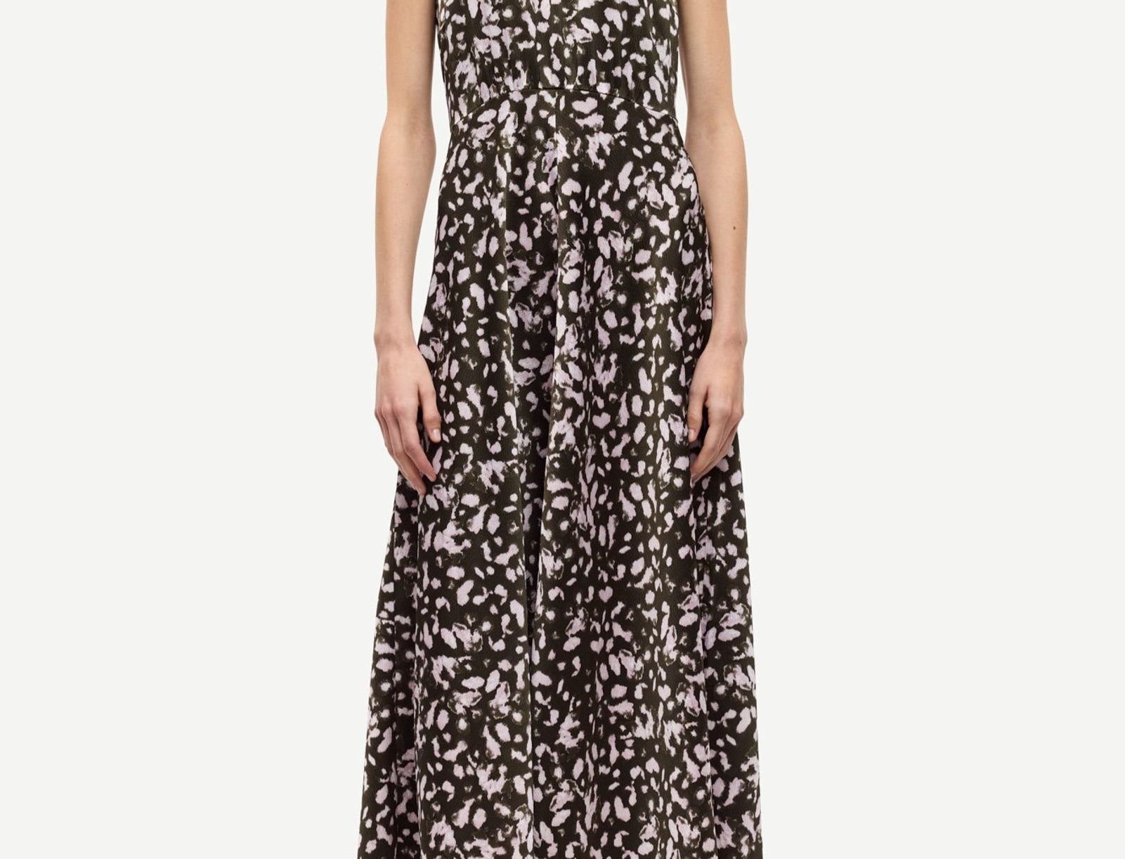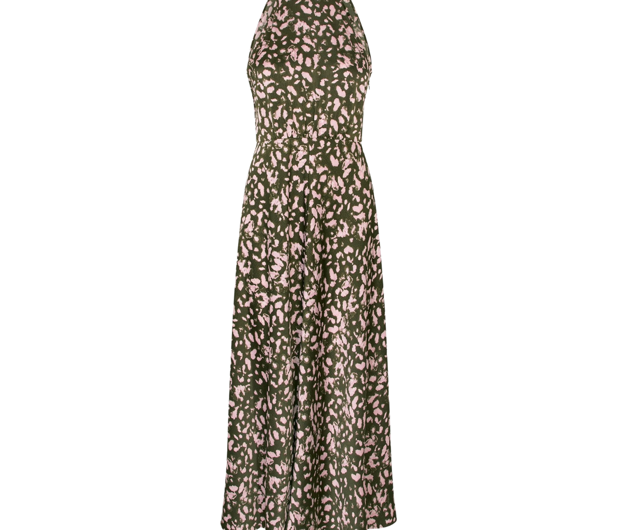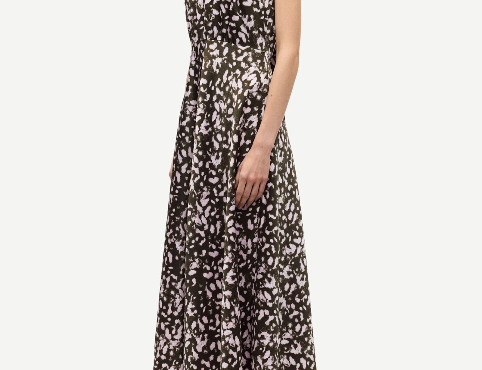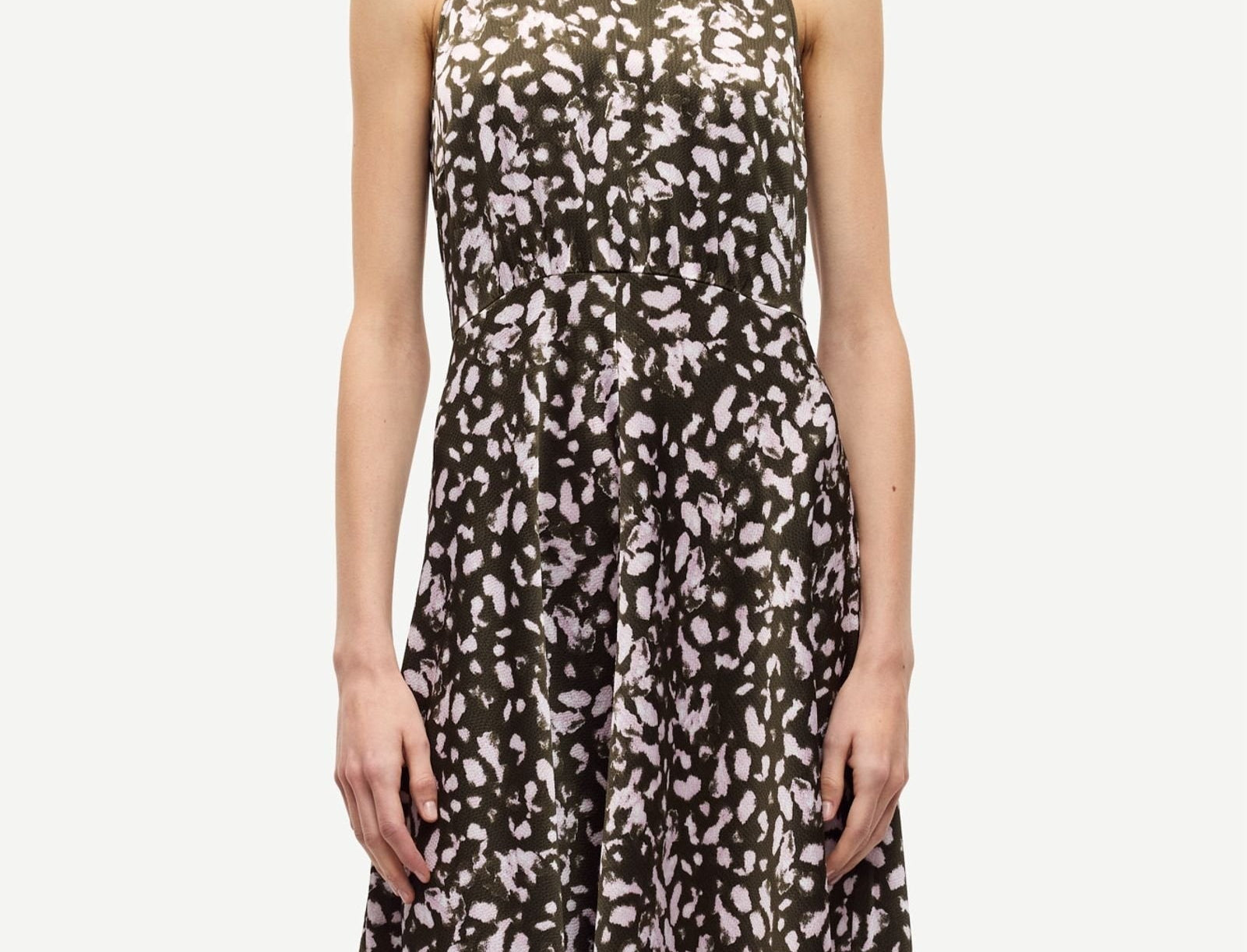Introducing Samsoe Samsoe’s Rheo Dress in Stones Green, a sleeveless halter neck satin midi dress in a stone green pattern. Designed with a self-tie back and a concealed side zip, this green satin dress features a back split opening for ease of movement.Perfect as a satin occasion dress, cocktail dress, or versatile midi for day-to-night styling.