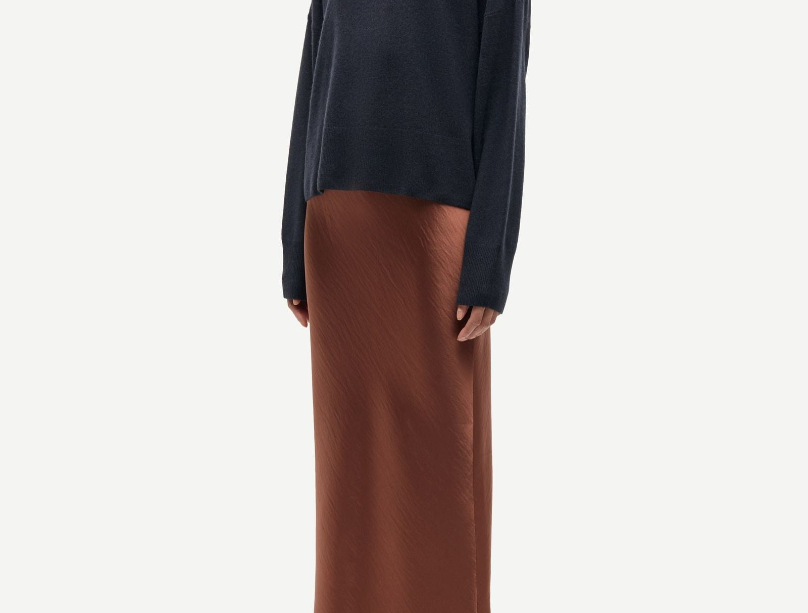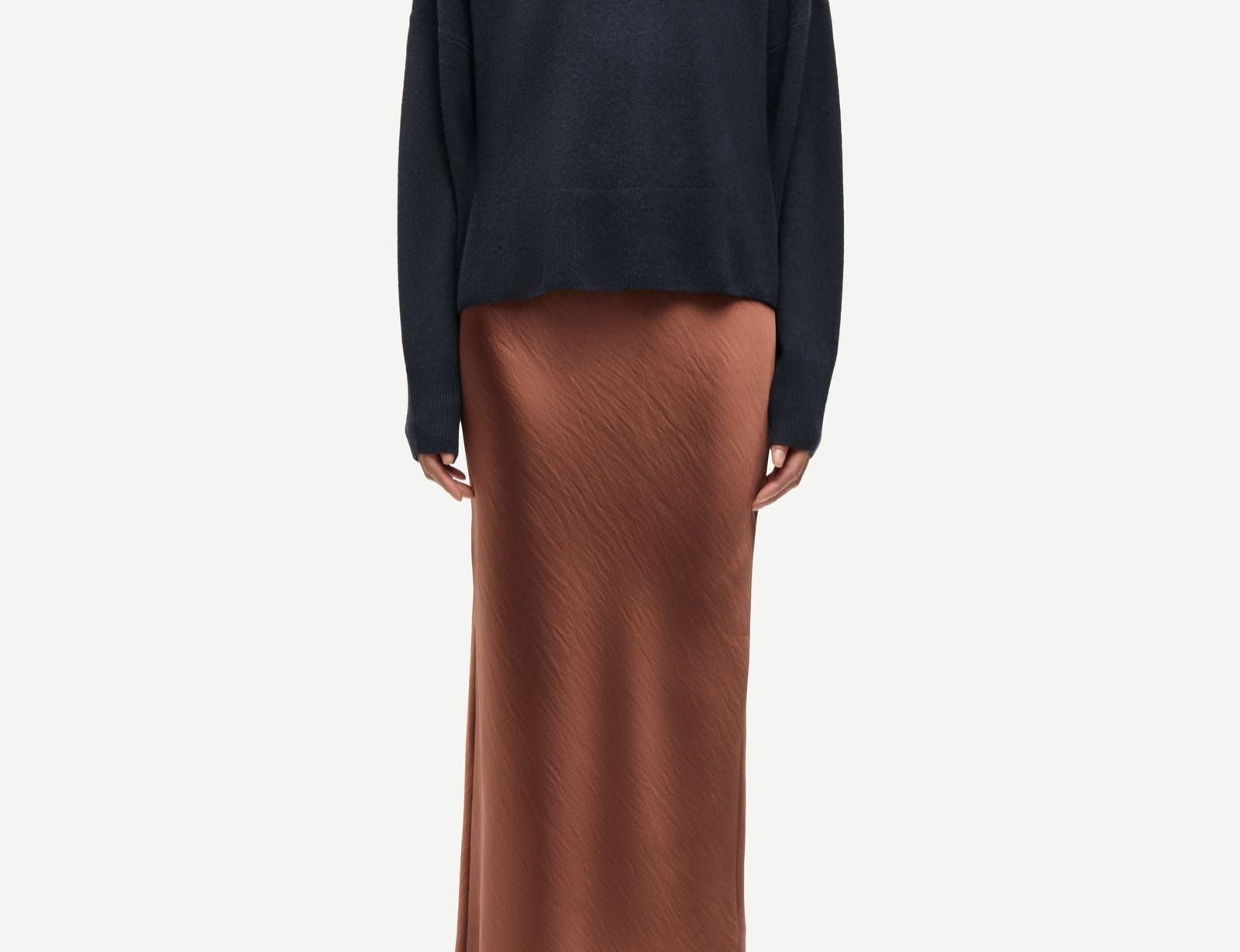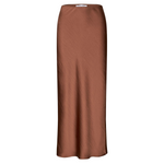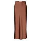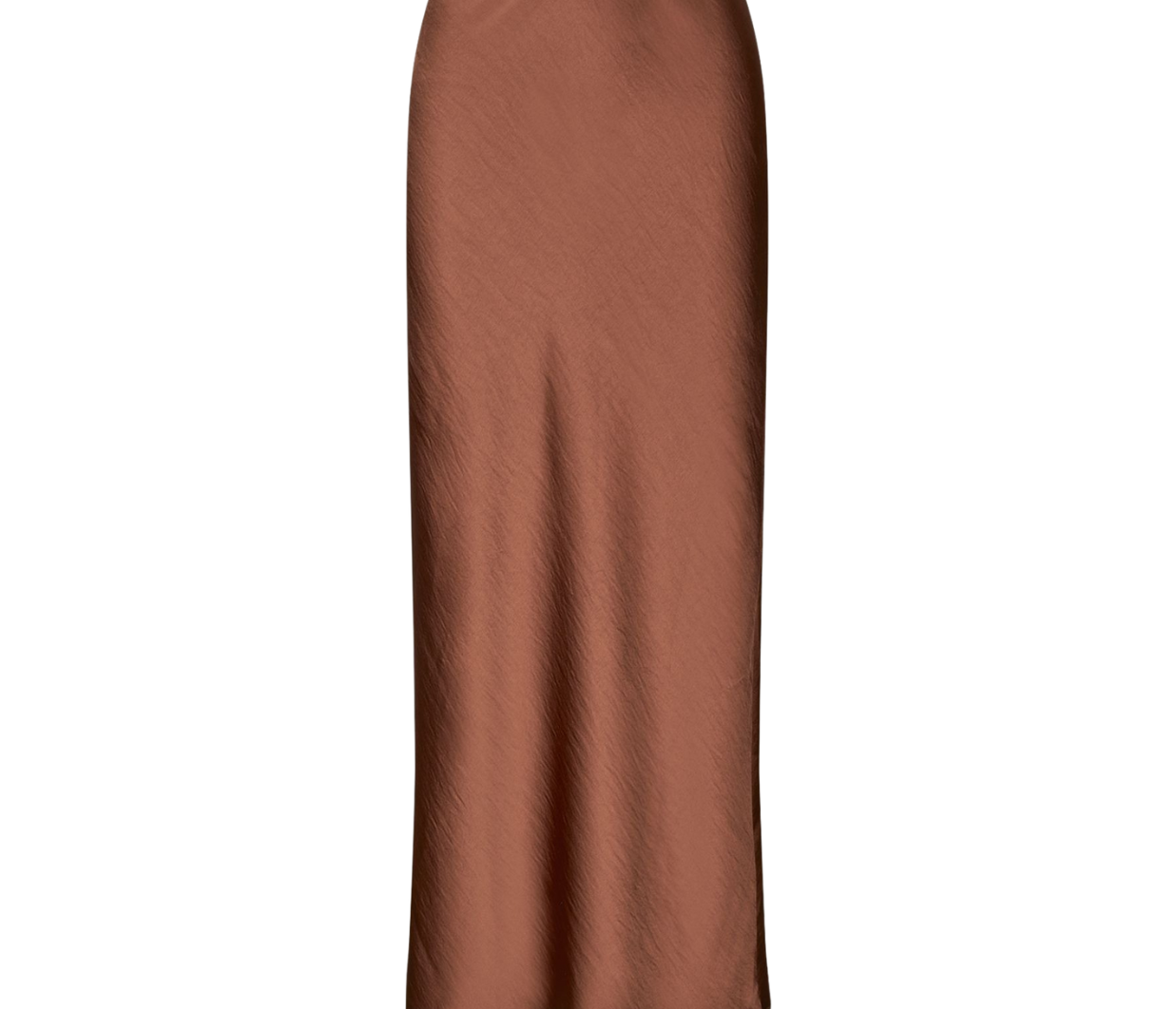Introducing Samsoe Samsoe’s Saagneta Long Skirt in Tortoise Shell, a satin maxi skirt in a rich brown hue. Designed with a fitted silhouette and an elastic waistband, the Saagneta maxi skirt drapes elegantly for both casual and occasion styling. Perfect as a brown satin maxi skirt for day-to-night wear.