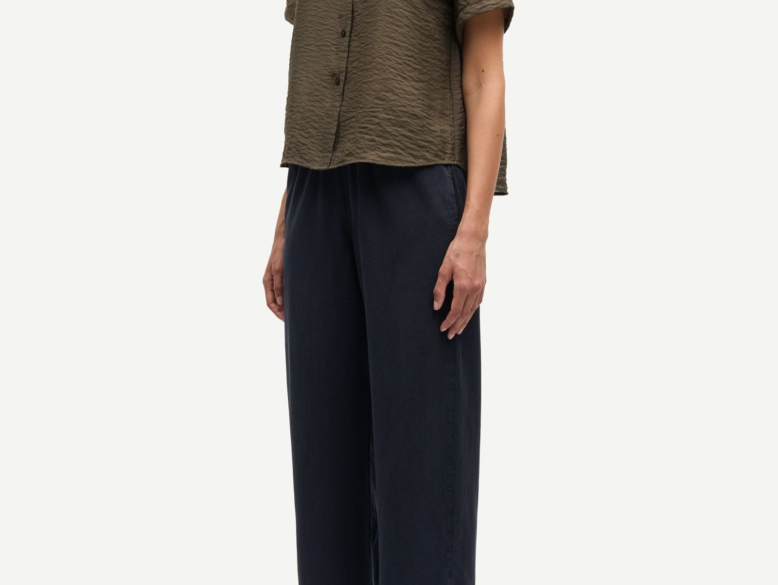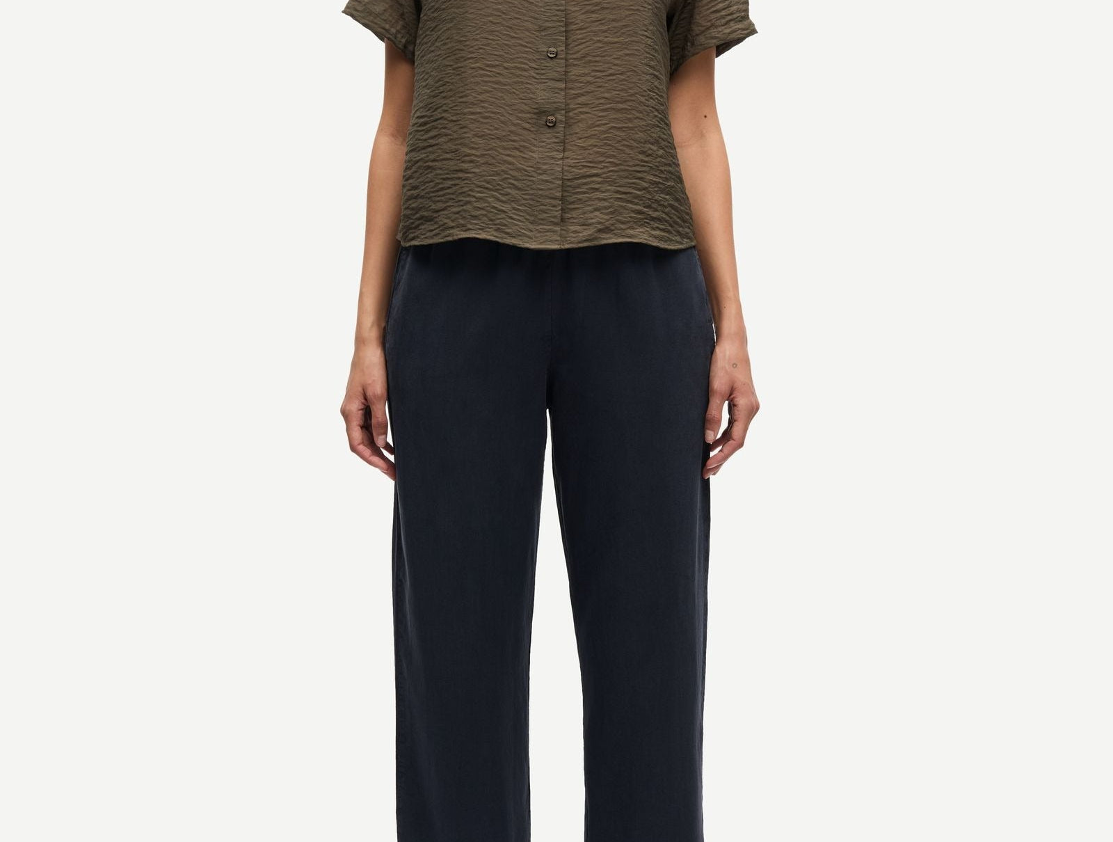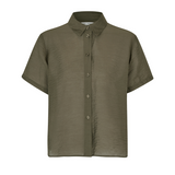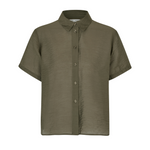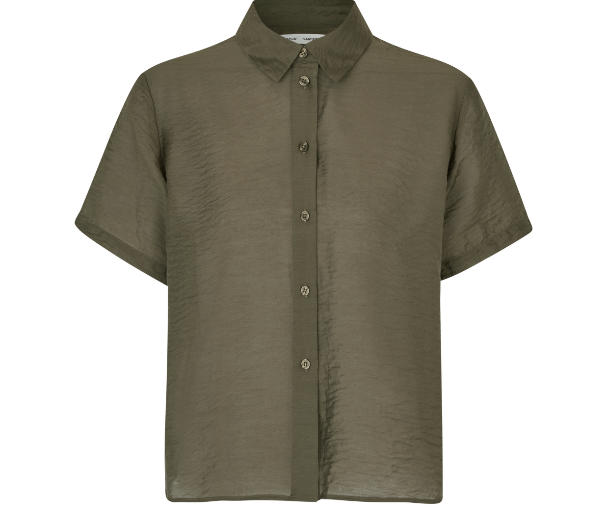 Introducing Samsoe Samsoe’s Saminna Short Sleeve Shirt in Deep Forest, a semi-sheer, relaxed short-sleeved shirt silhouette in an olive green hue. The Saminna shirt is designed with a drop-shoulder silhouette, a front button closure, and a neck yoke seam with pleats for added drape. Perfect as a casual summer shirt, silk-blend top, or elevated work shirt.
