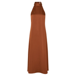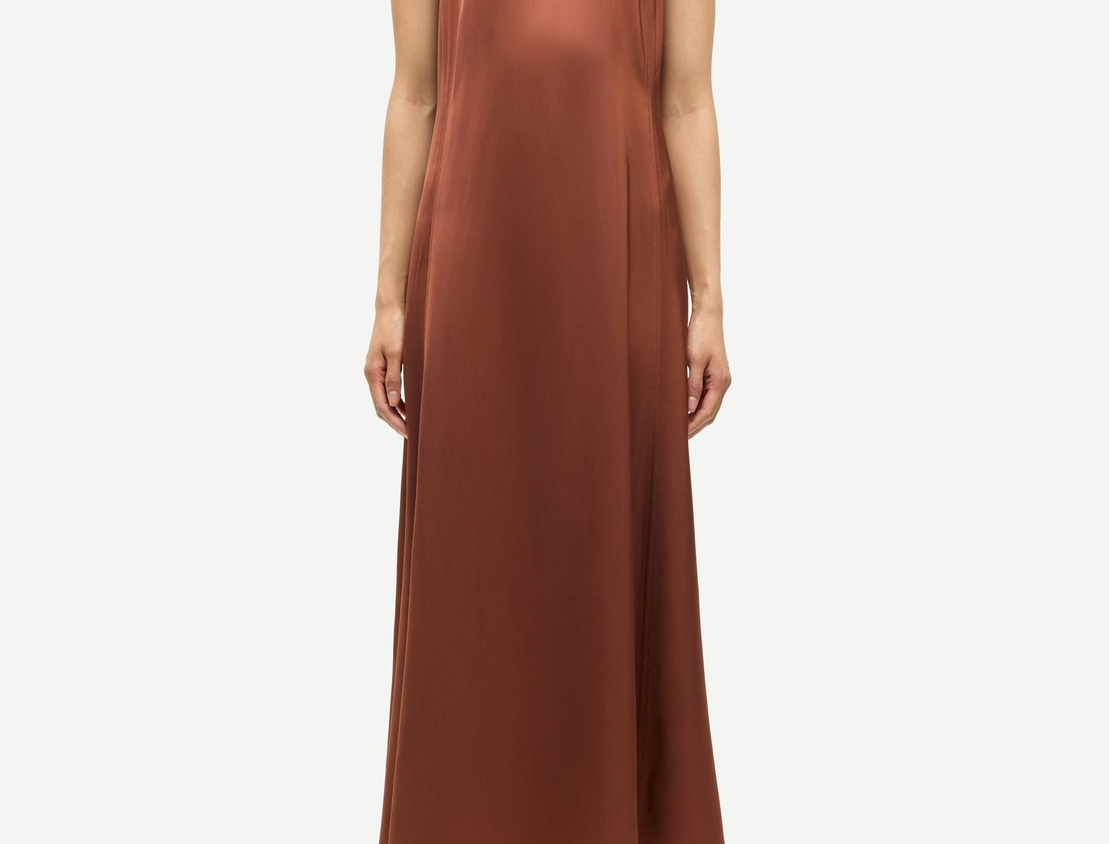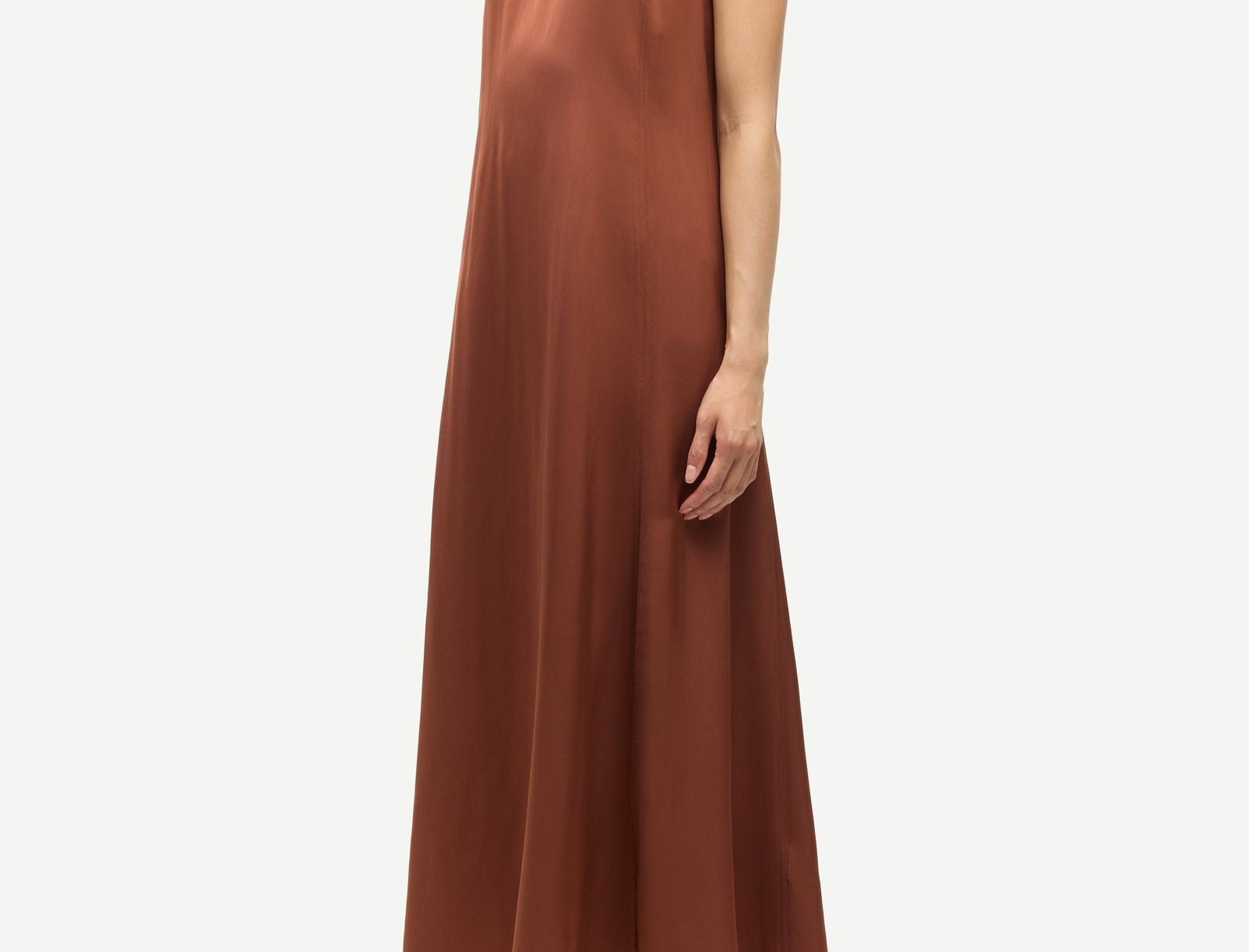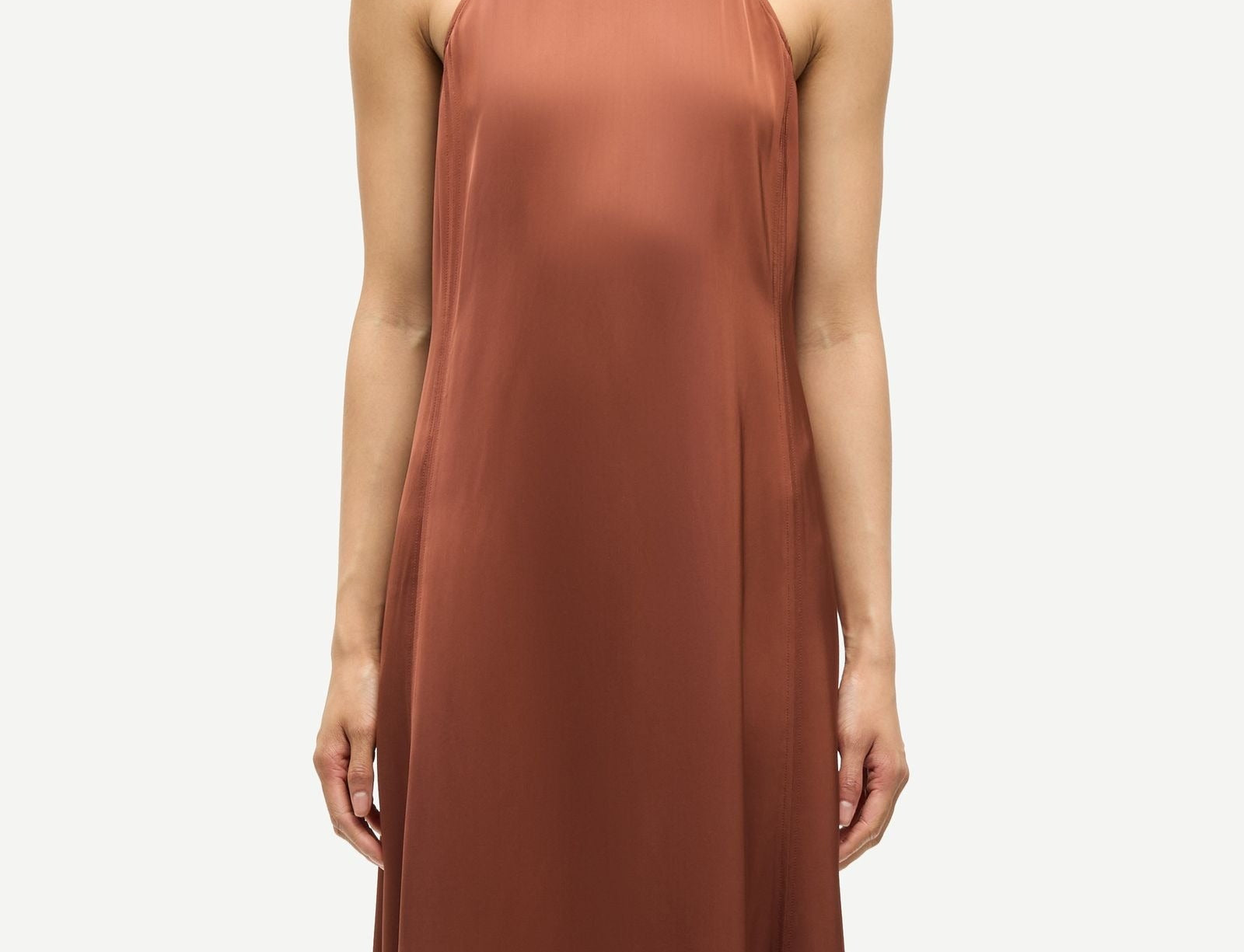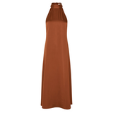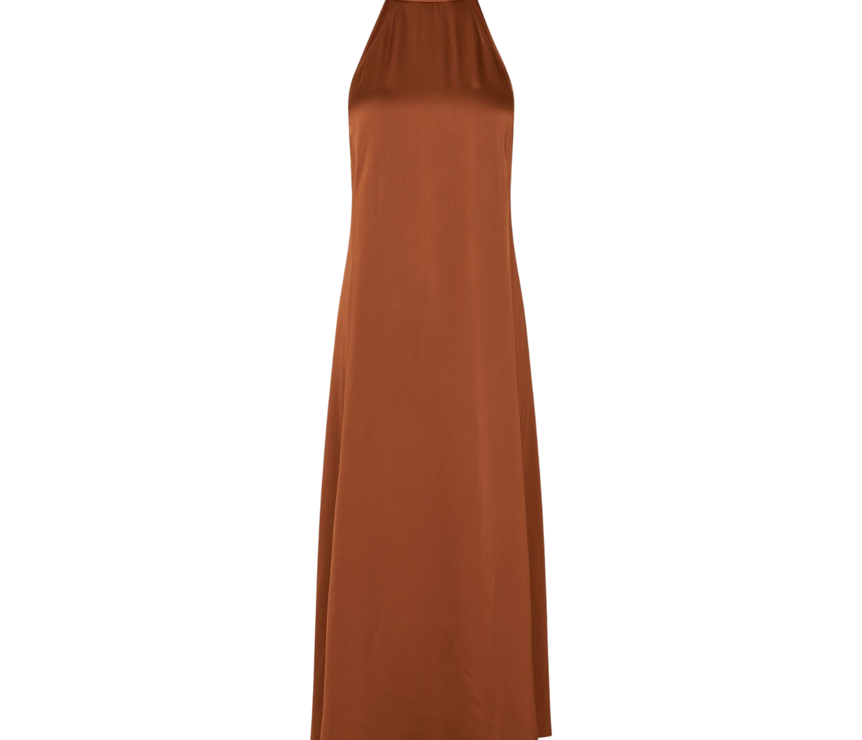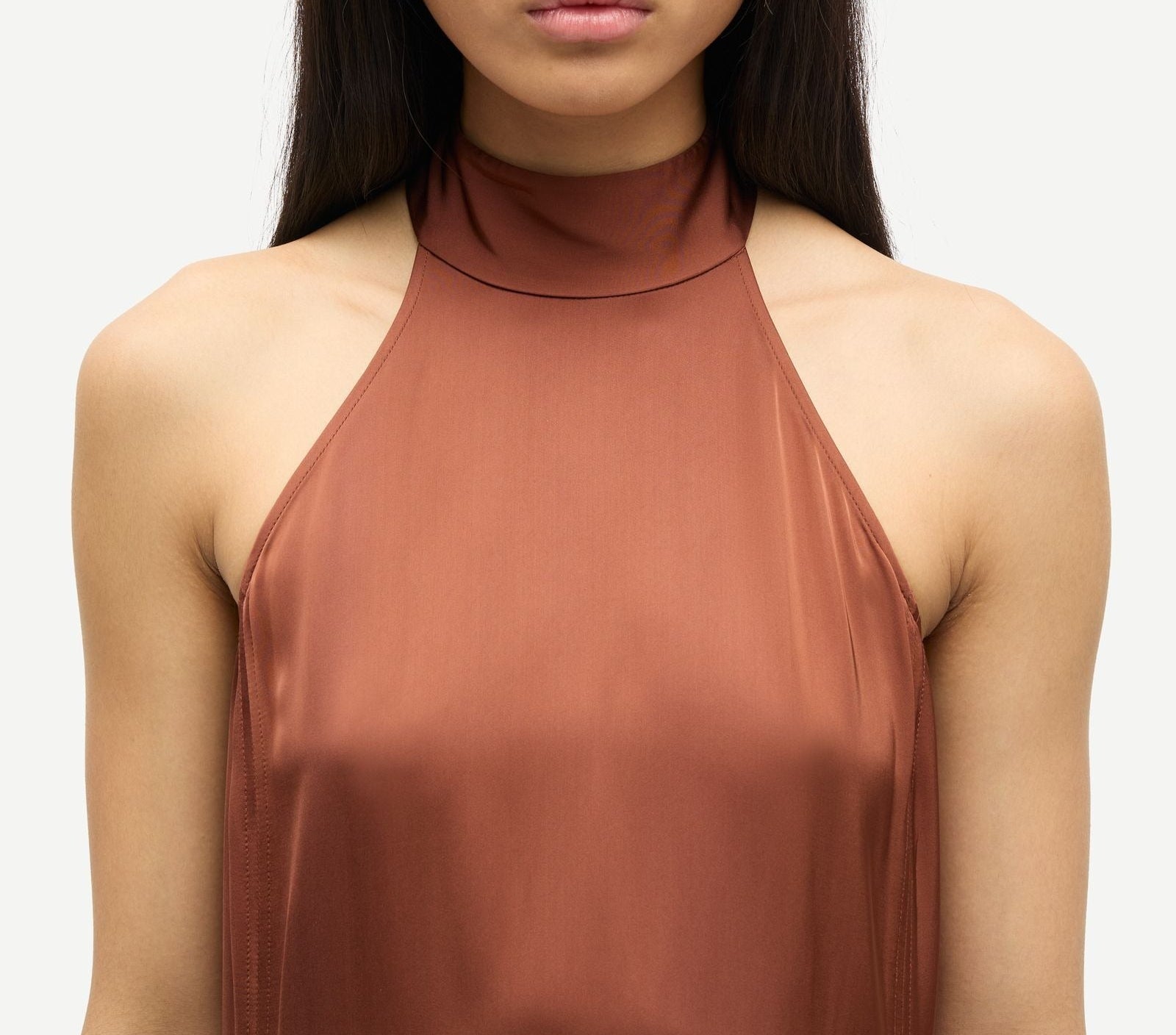 Introducing Samsoe Samsoe’s Sanettle Dress in Tortoise Shell, a halter neck satin maxi dress in a rich brown orange hue. Designed with a halterneck strap and a concealed back zip, the Sanettle maxi satin dress falls in an A-line silhouette with a flowing drape. Perfect for occasion dressing, cocktail dresses, or evening wear.