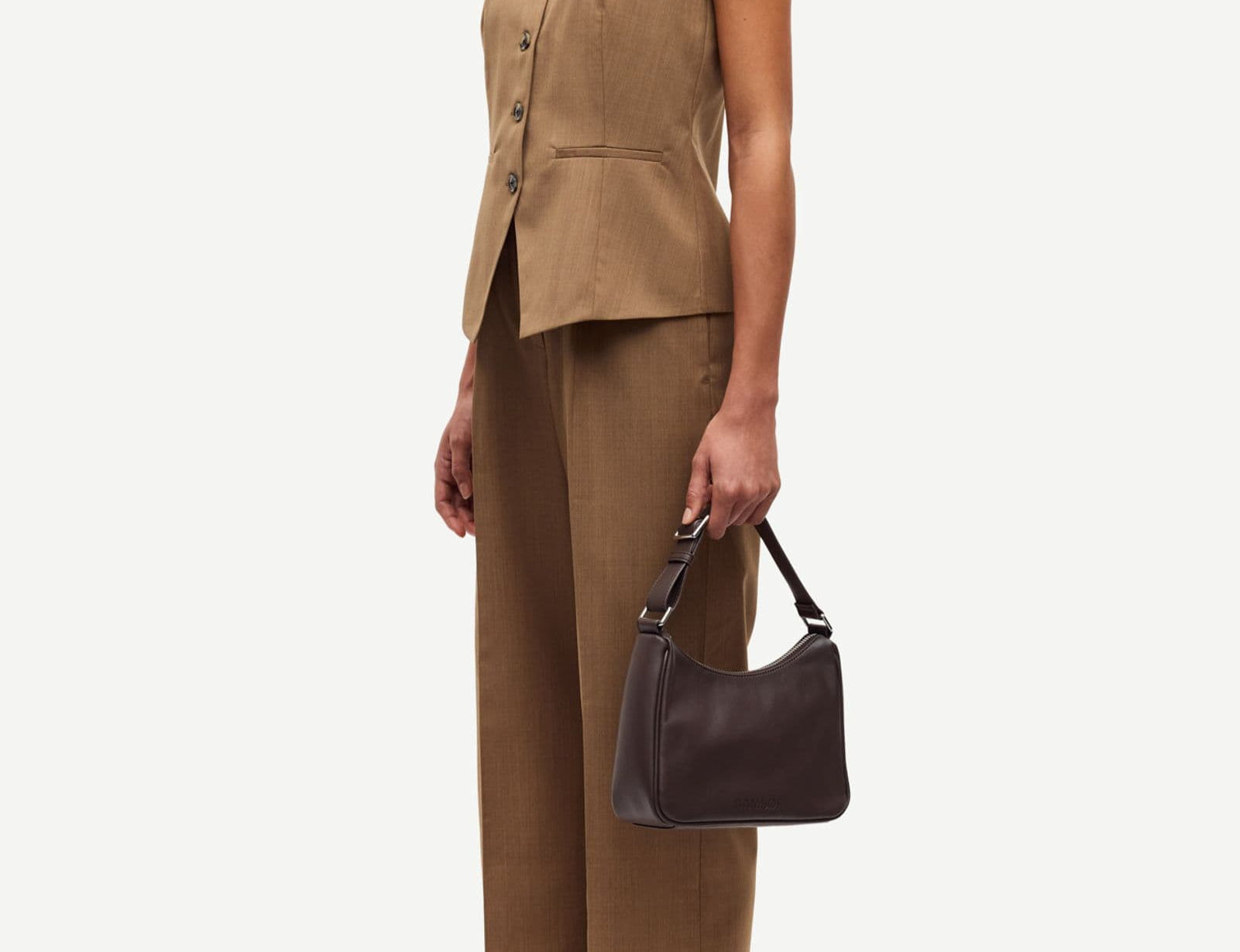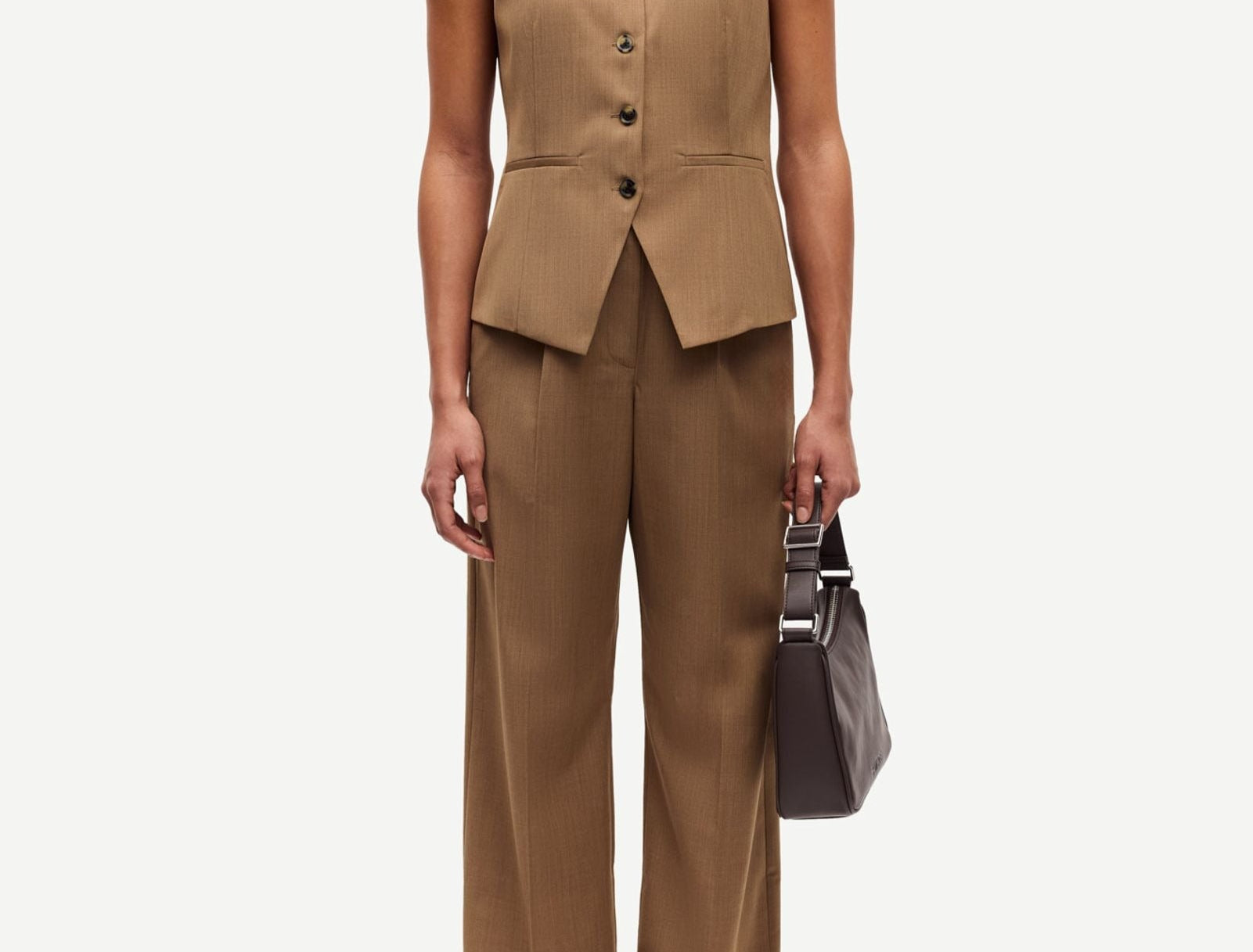 Introducing Samsoe Samsoe’s Satovi Trousers in Otter Melange, a mid-rise, straight-leg trouser pant silhouette in a brown Otter Melange hue. The Satovi tailored pants feature a button and zipper fly closure with an elasticated waistband, completed with side slit pockets for functionality. The Satovi Trousers balance structure and ease, perfect for office-to-evening styling.