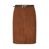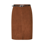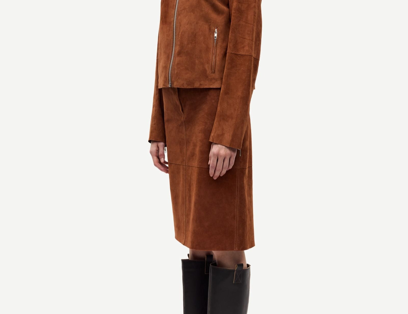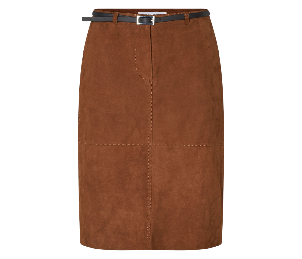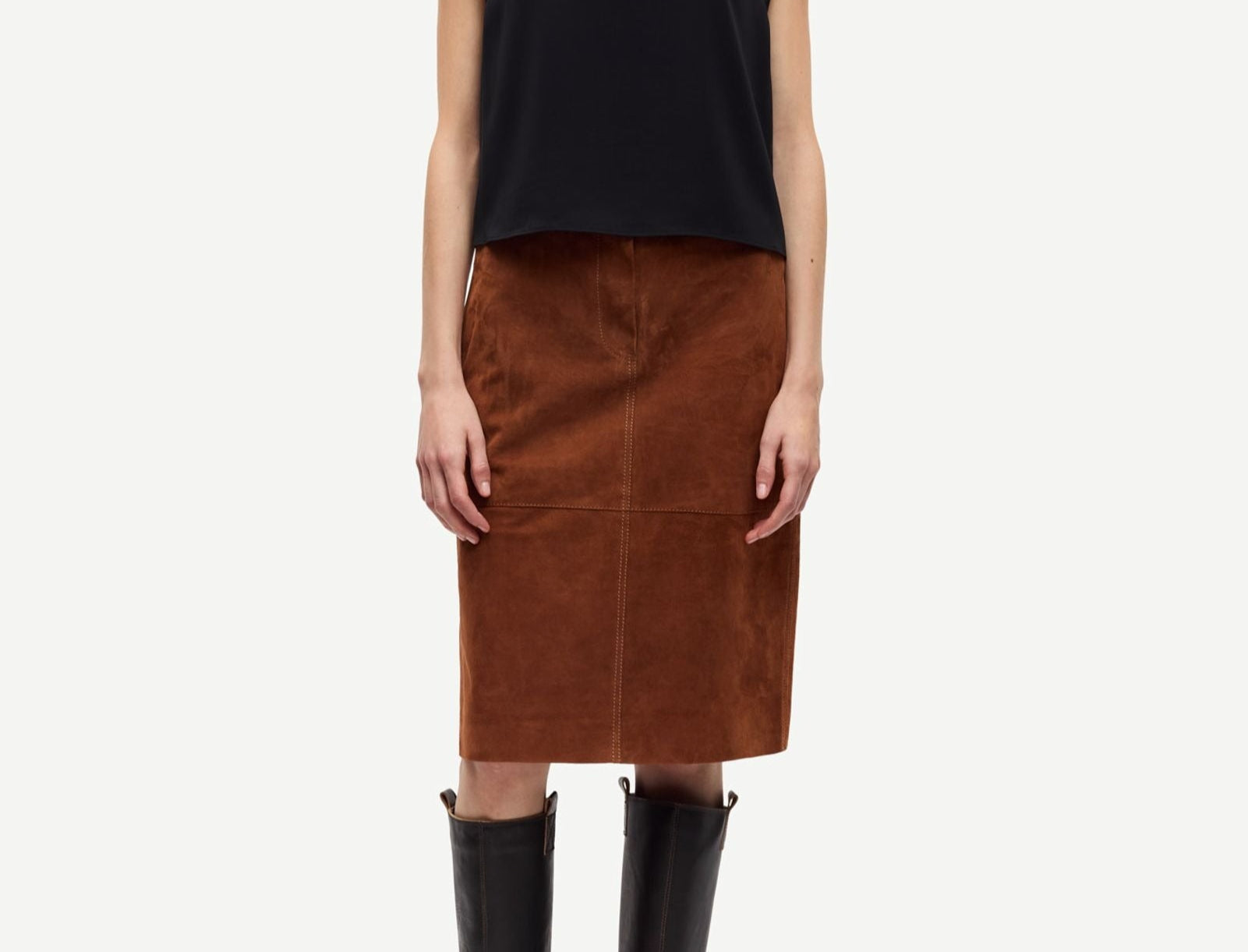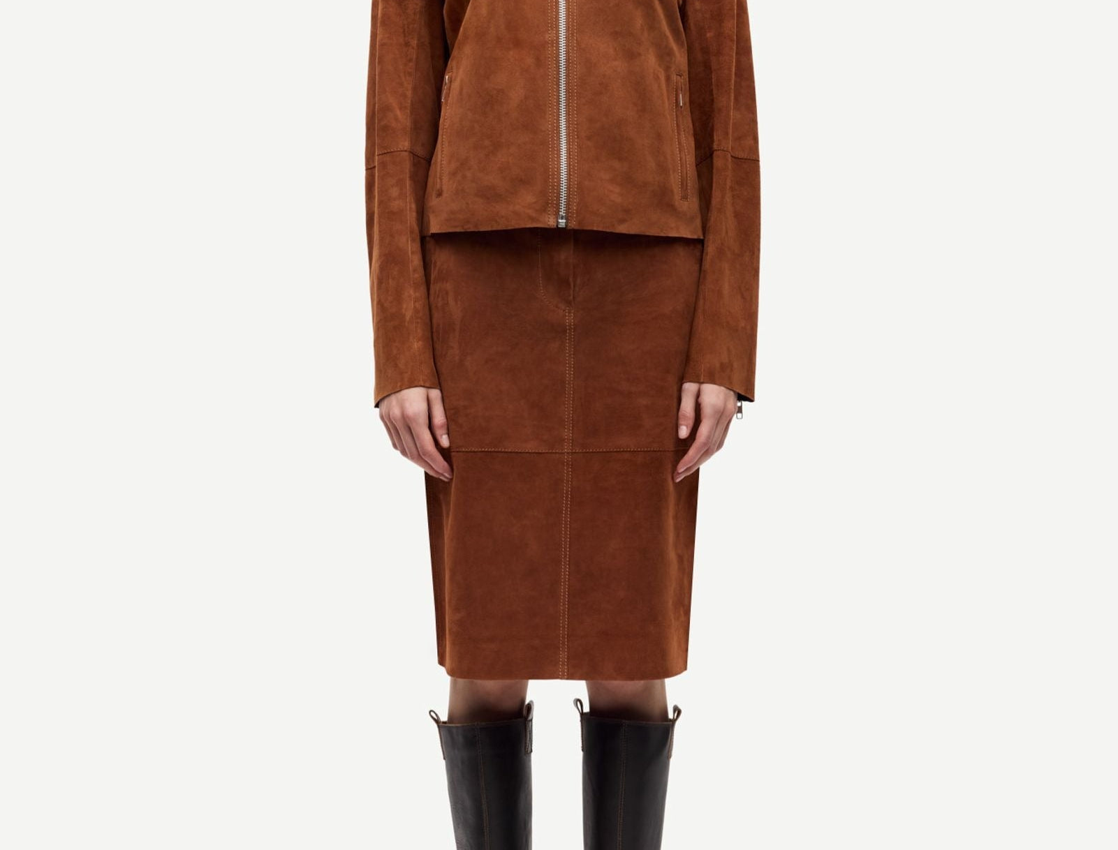 Introducing Samsoe Samsoe’s Savana Midi Skirt in Tortoise Shell, a brown suede mid-rise midi-length skirt with a slim-fit silhouette. The Savana suede leather skirt features a hook and bar with zipper fly closure, a back slit, and belt loops with a thin detachable belt to define the waist. Perfect for an edgy, refined look.