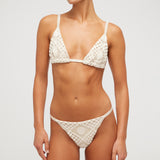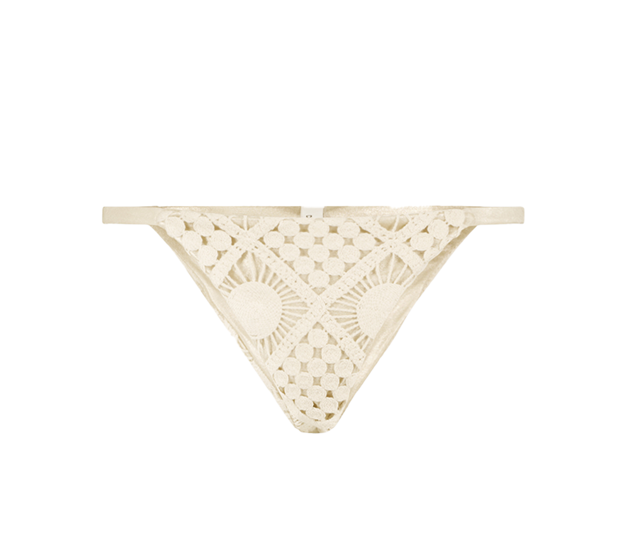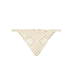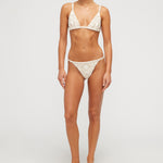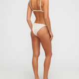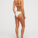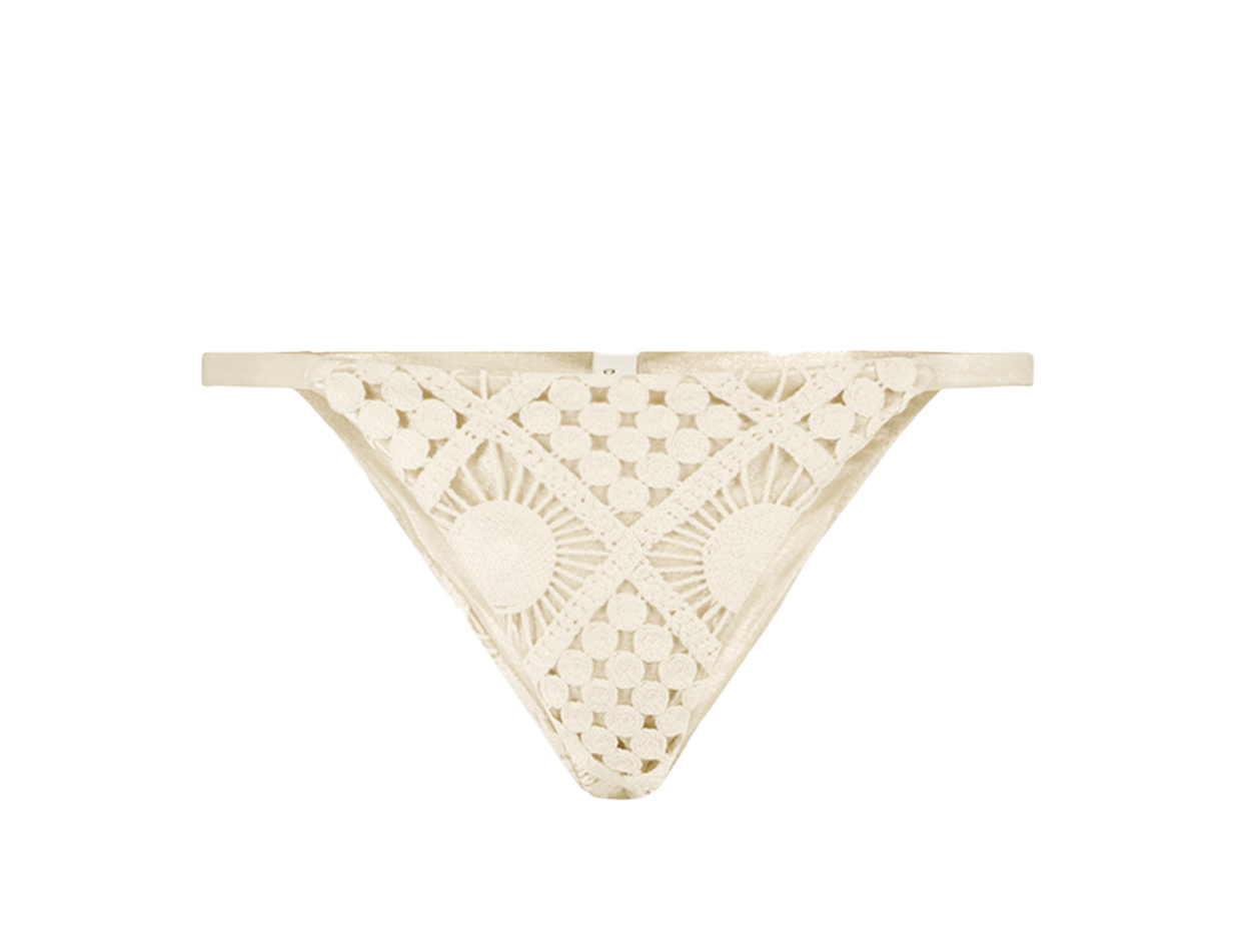 Dive into sophistication with Sara Cristina's Sun Triangle Bikini Bottom in Natural Lace, adorned with subtle metallic gold detailing on the inside for an added touch of glamour. The modest coverage with the thin side straps add a touch of sensuality, while the intricate craftsmanship exudes a timeless allure. Complete the ensemble by pairing it with the Sun Triangle Bikini Top in Natural Lace for a coordinated and stylish beach look.