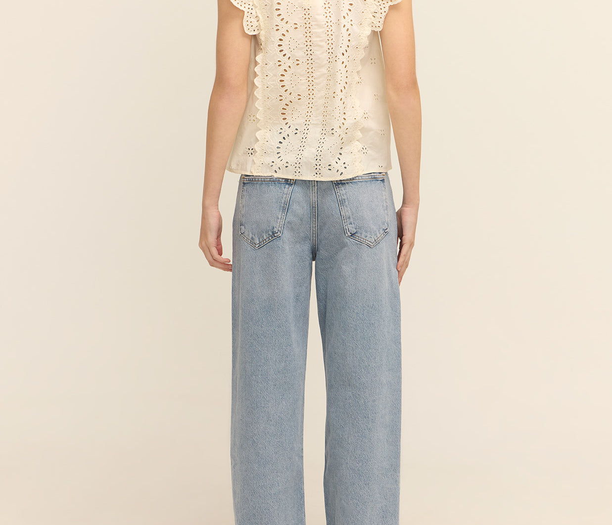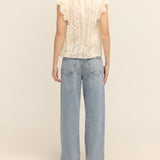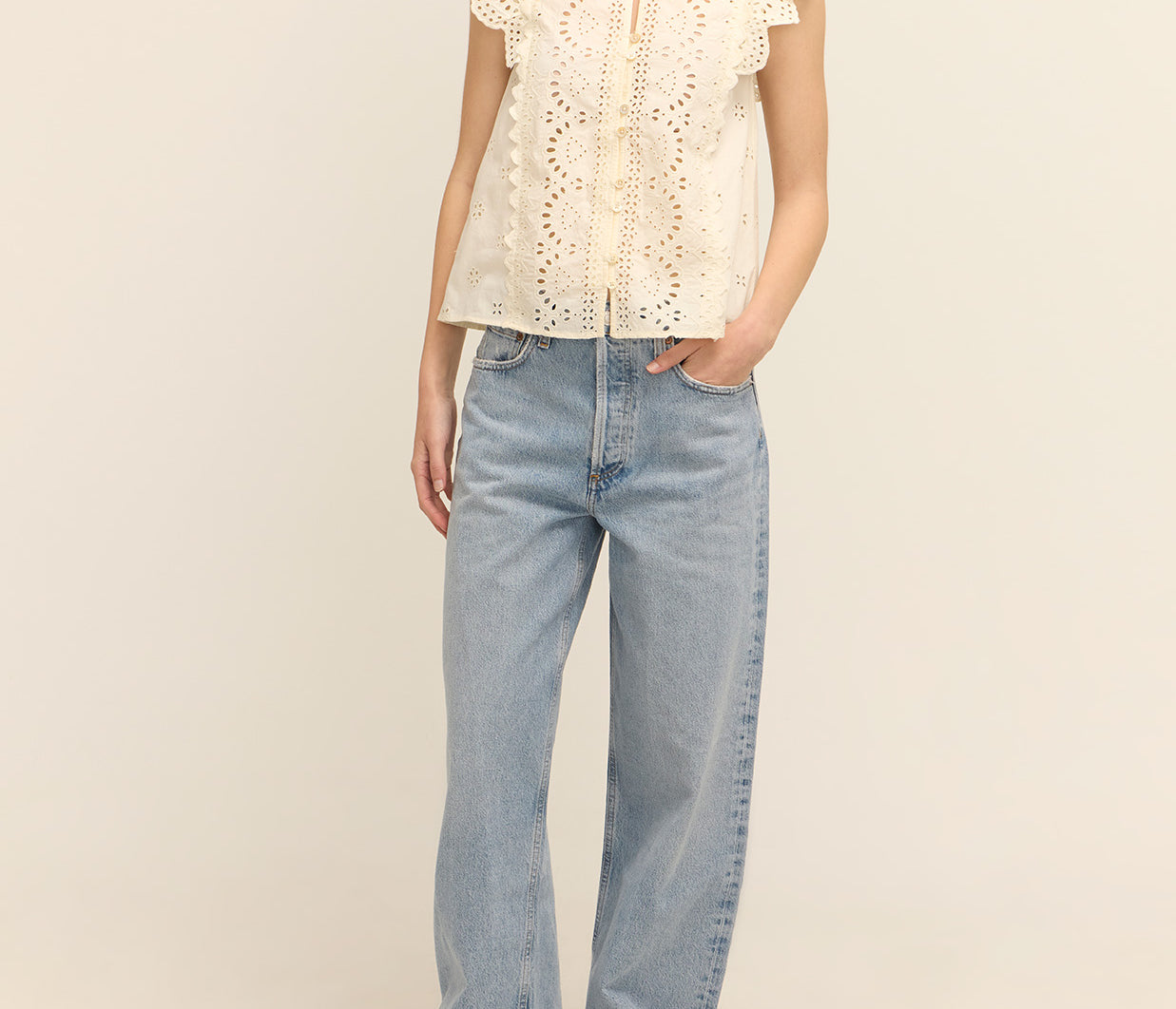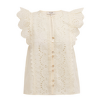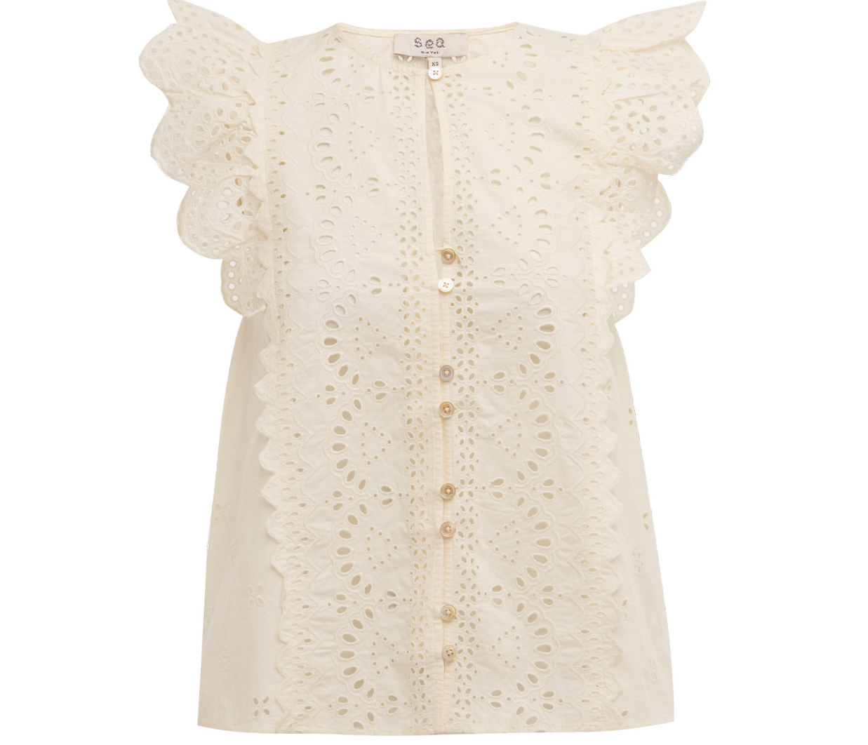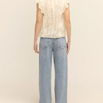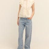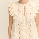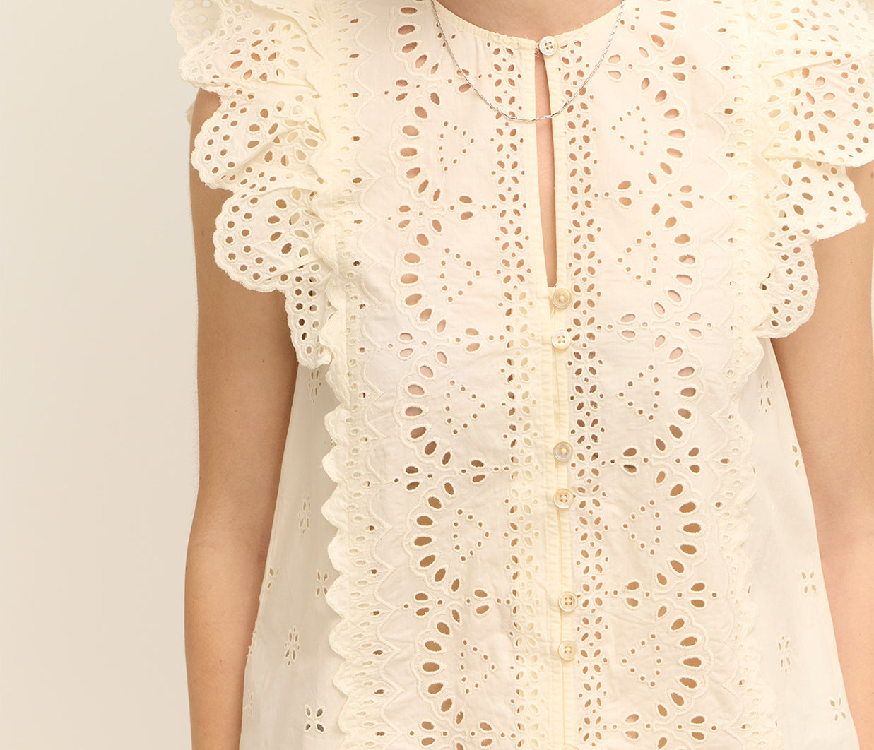 The Lainey Embroidered Tank in Cream by Sea NY, features delicate eyelet embroidery for a charming, textured look. With playful ruffle flutter sleeves and shell button front closure, this tank offers a touch of stylish twist to any outfit.