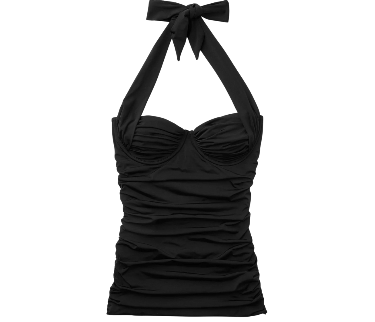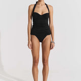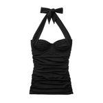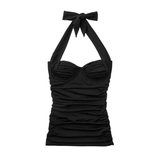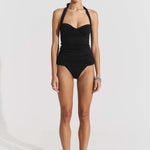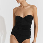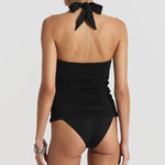 Introducing Seaquelle's Haven Top in Black, a sculpted ruched swimwear top in black. Designed with defined underwired cups, broad necktie straps, and an alternating straps bandeau look. The Haven top is typically styled with matching bottoms as a swim set.