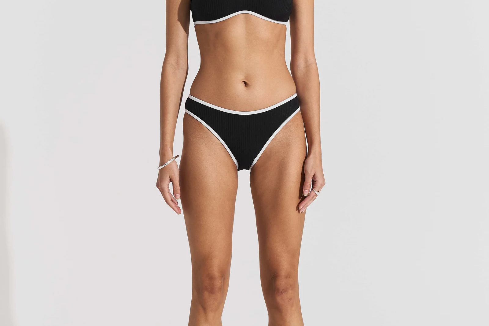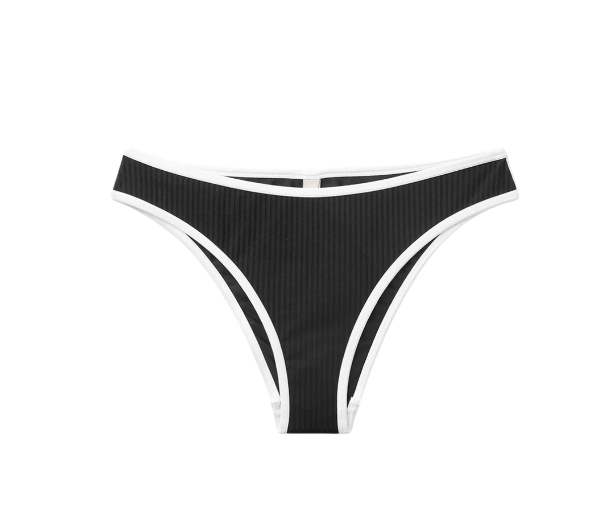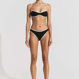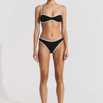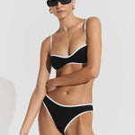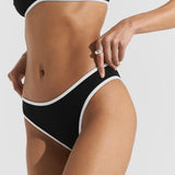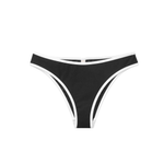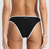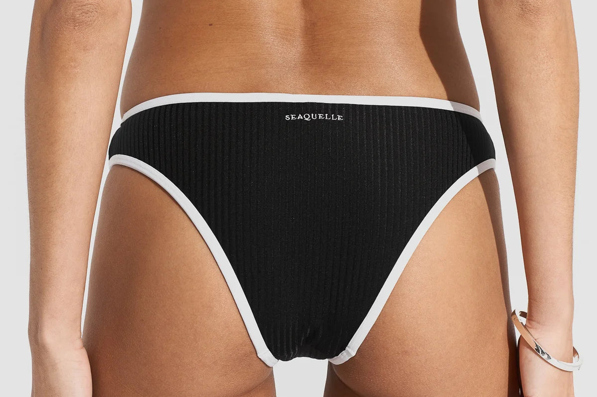 Introducing Seaquelle's Ribbed Bikini Bottom in Black, a mid-rise bikini bottom in a black hue with white contrast edging. Designed with a shimmer effect paired with a textured ribbed structure. This bikini bottom includes a contrast of white bindings alongside the overall black hue, presenting a sporty look, and is finished with neat embroidered logos on the front and back. For a complete look, pair it with the Ribbed Bikini Top.