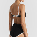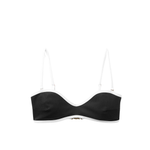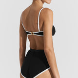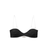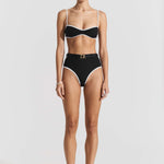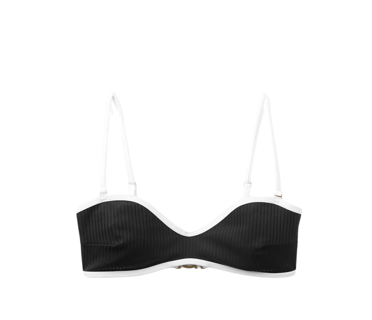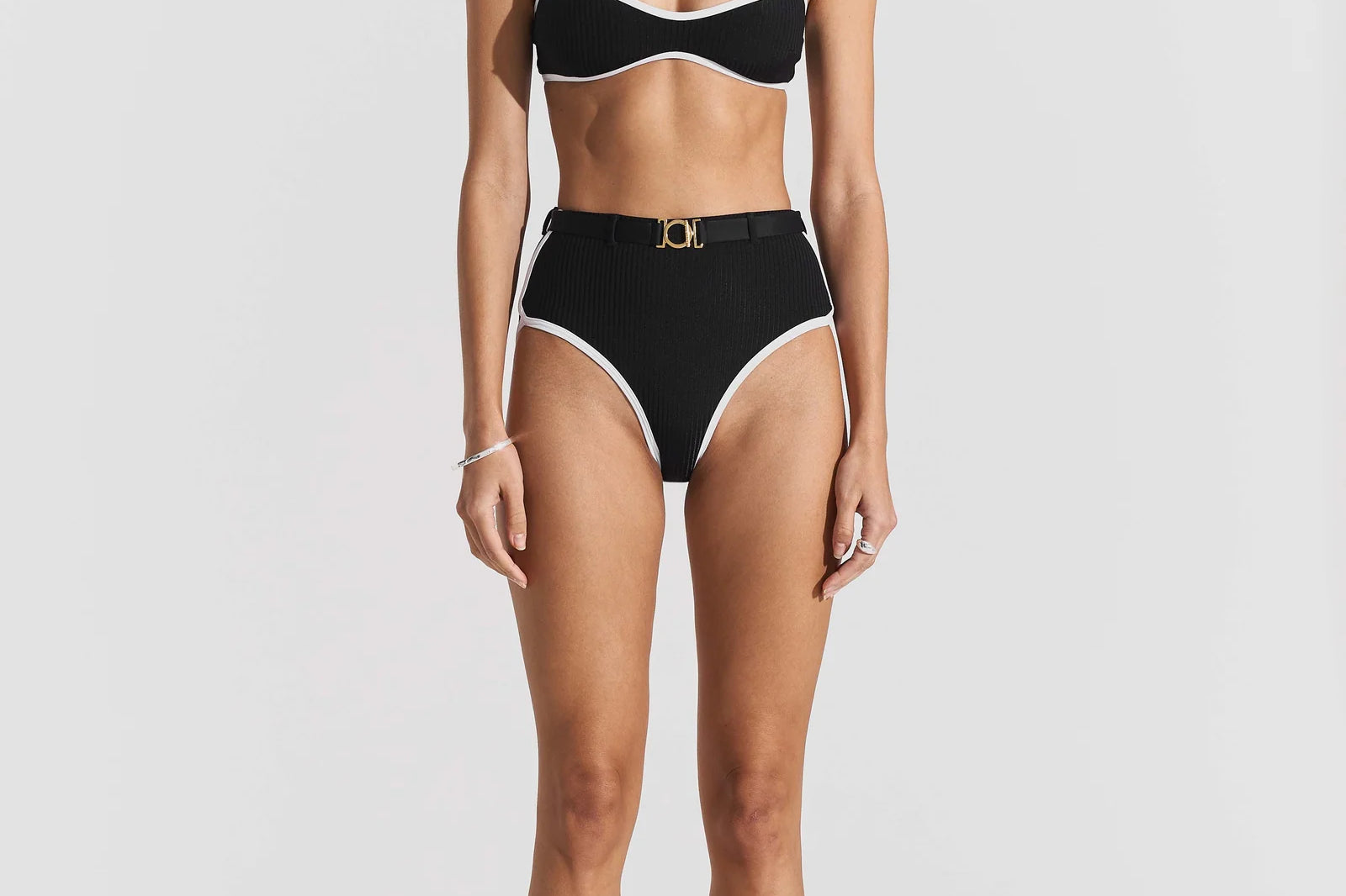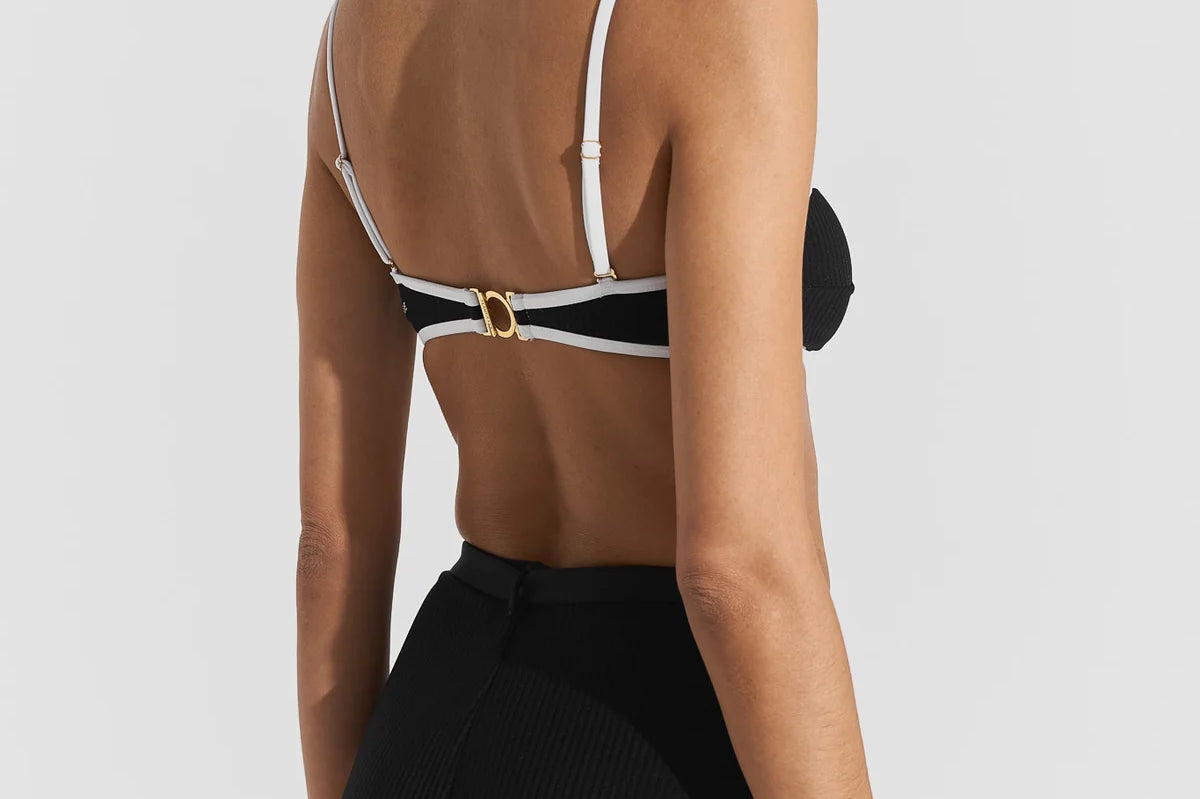 Introducing Seaquelle's Ribbed Bikini Top in Black, a ribbed bikini swimwear top in a black hue. Designed with a shimmer effect as well as a contrasting ribbed structure of solid shades of black and white. The ribbed bikini top features a curved neckline, detachable shoulder straps, and a distinctive Sequelle closure detail at the back. For a complete look, pair it with the Ribbed Bottom.