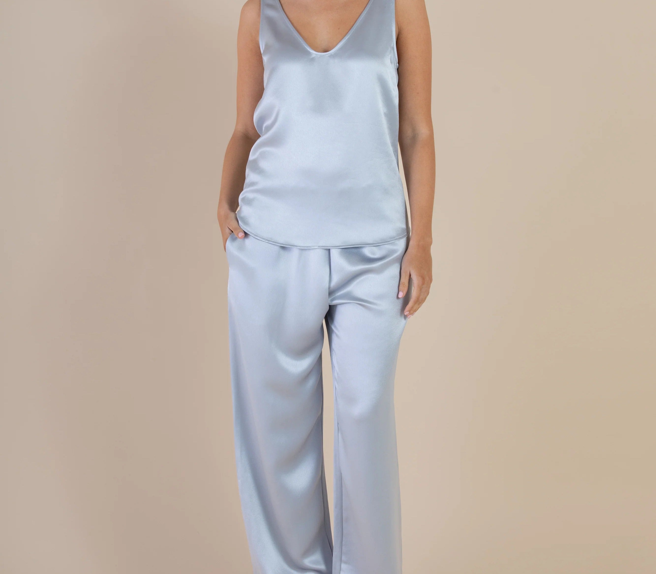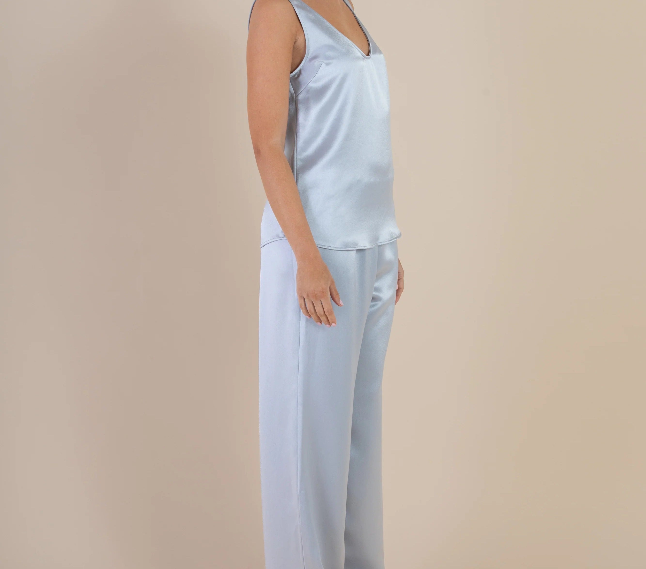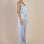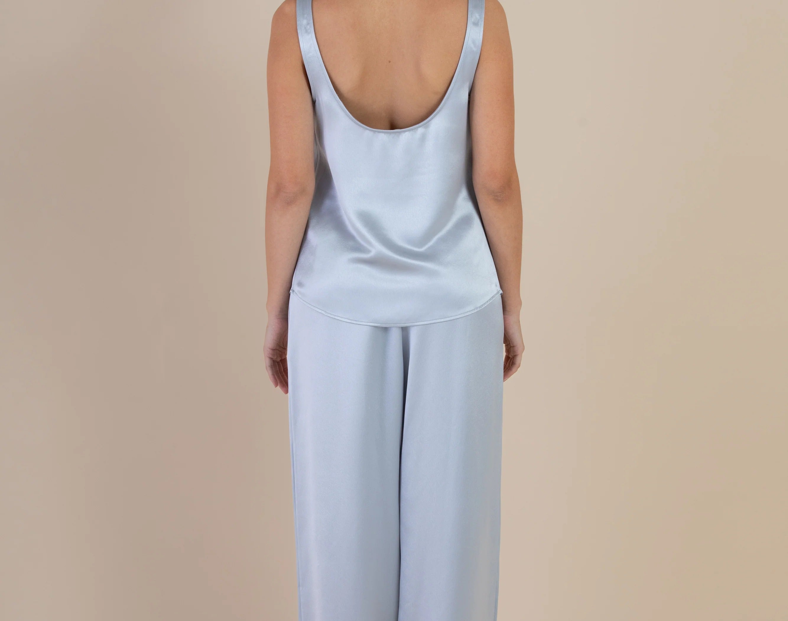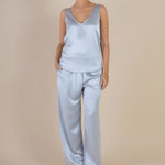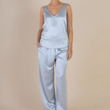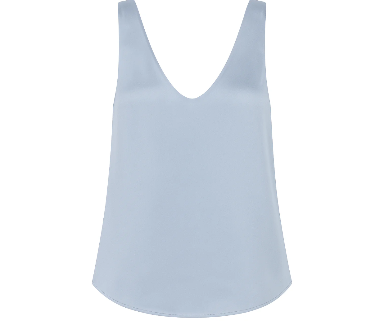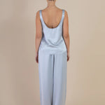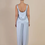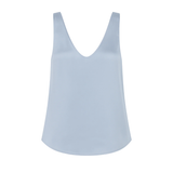Introducing SELFE Margot Cami in Mystique a refined classic tank top in baby blue color. Designed with a smooth satin finish, a soft sheen, and an elegant drape. The Margot Cami features a front V neckline with a deep scoop back and a gently relaxed silhouette. Ideal for layering under a blazer or styled solo for a polished, minimalist look.