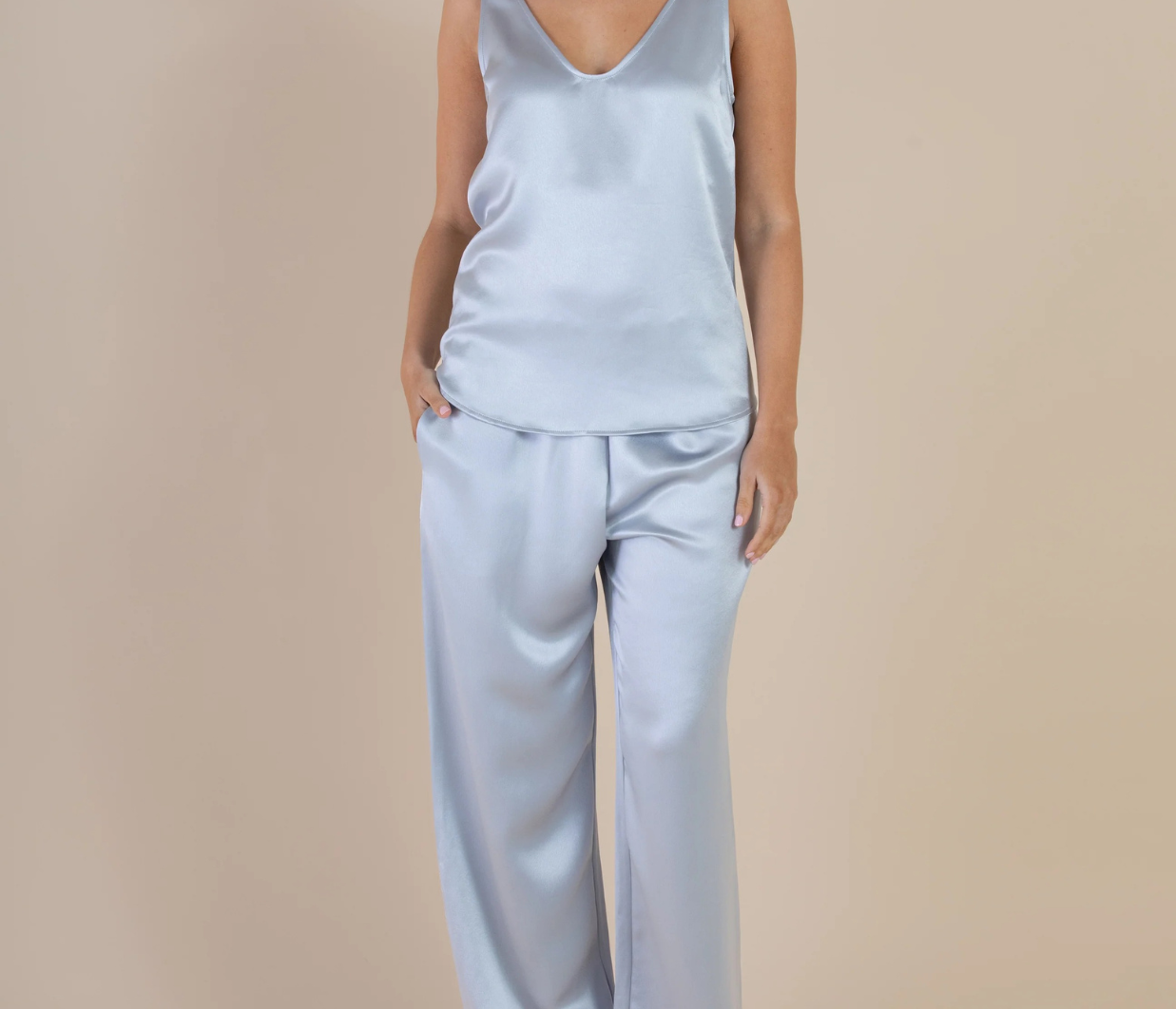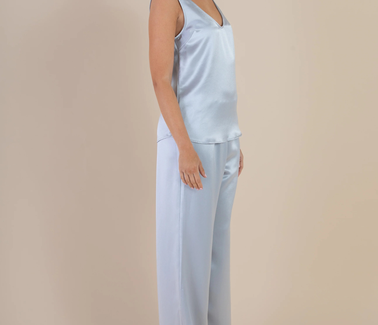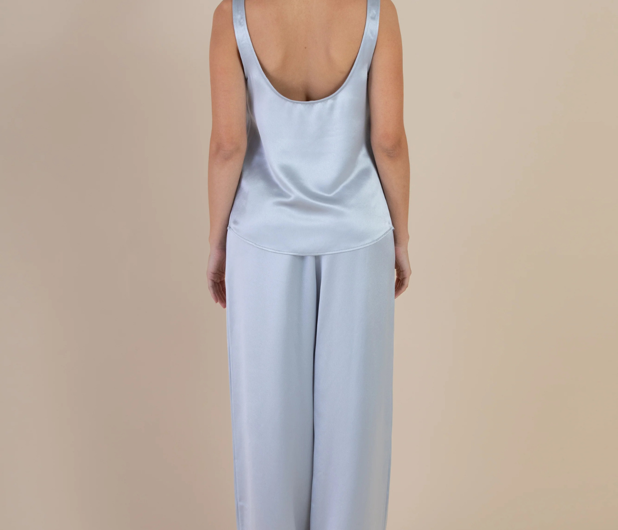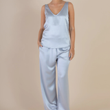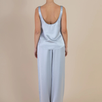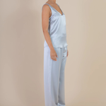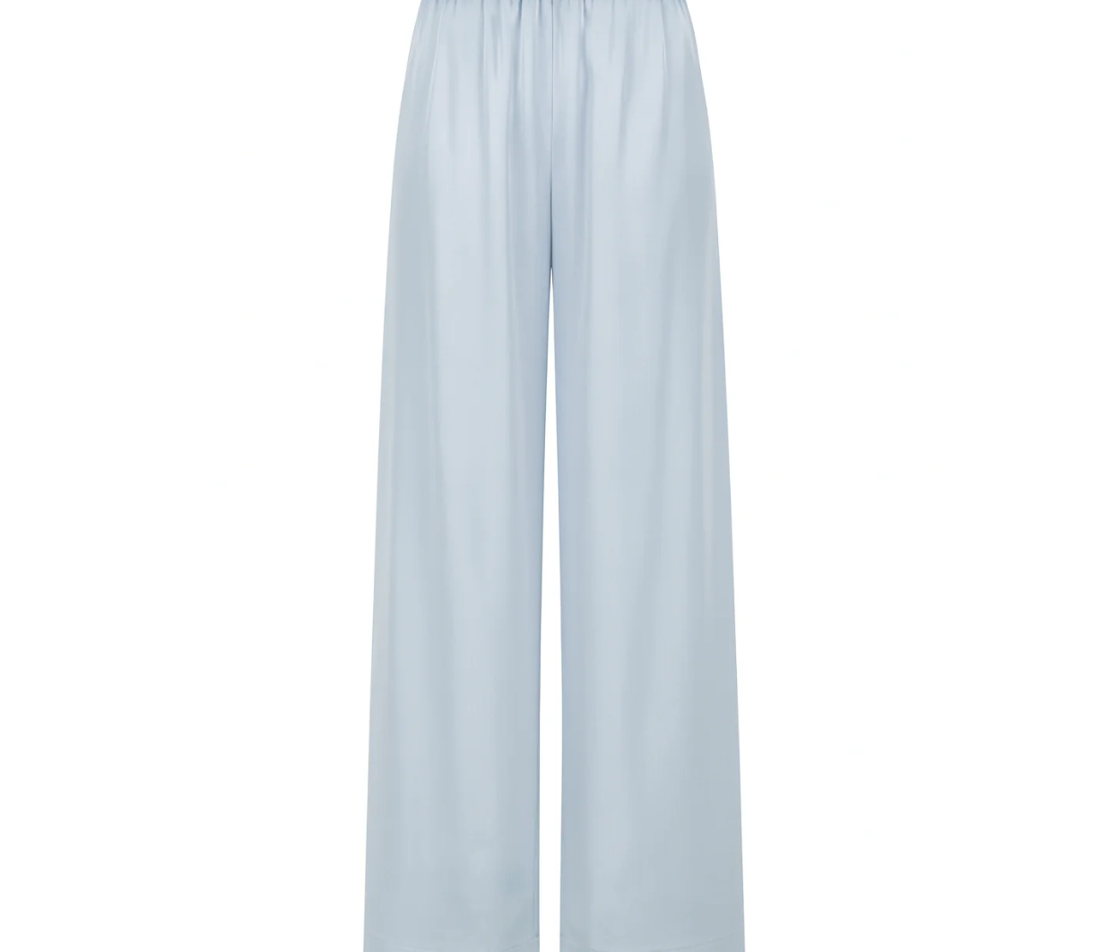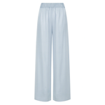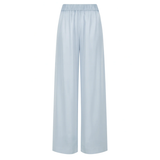 Introducing SELFE's Adeline Pant in Mystique, a straight-leg pant silhouette in baby blue hue. Designed with a smooth sheen finish, the Adeline pants offer an elegant drape and an ultra-soft feel against the skin. The wide-leg silhouette creates a flattering, flowy movement, perfect for both day and evening wear.