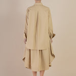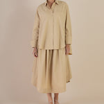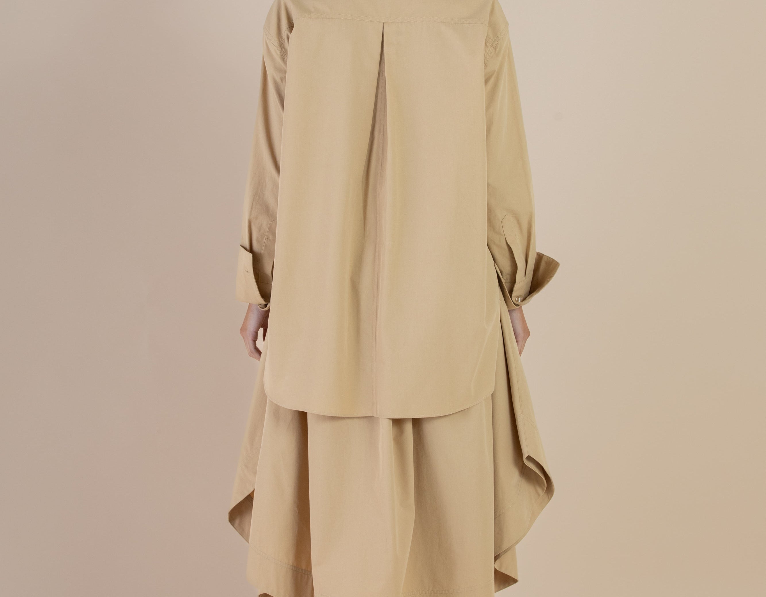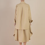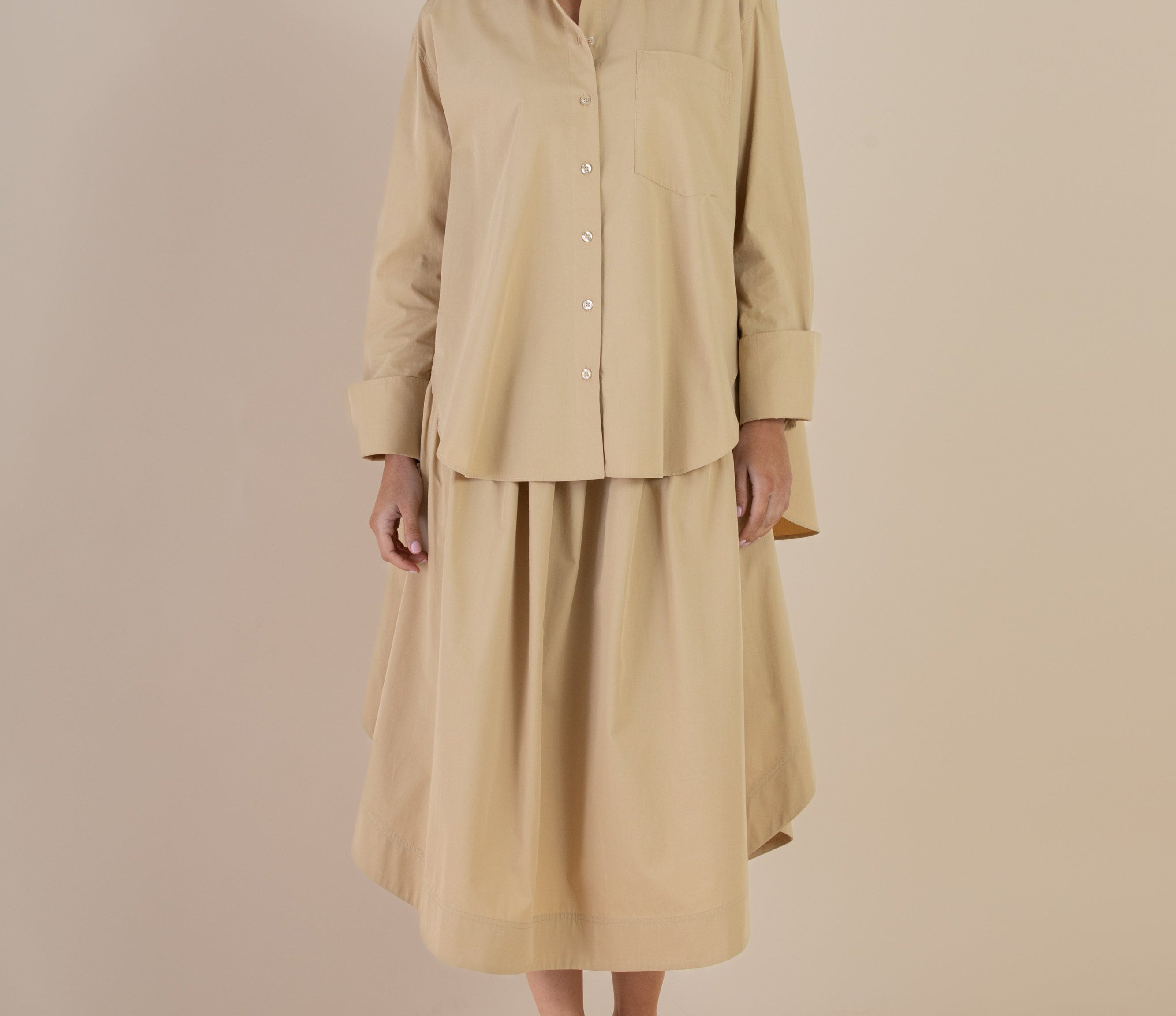 Introducing SELFE’s Ida Shirt in Camel, a relaxed long-sleeve, tailored collared shirt silhouette in the color golden sandy brown. Crafted from 100% cotton with a classic structured shirting silhouette, it features a back yoke, button-through front, and cuffed long sleeves, balanced by a single front pocket, subtle back pleat, and a stepped, scooped hem. Designed for a seamless everyday staple.