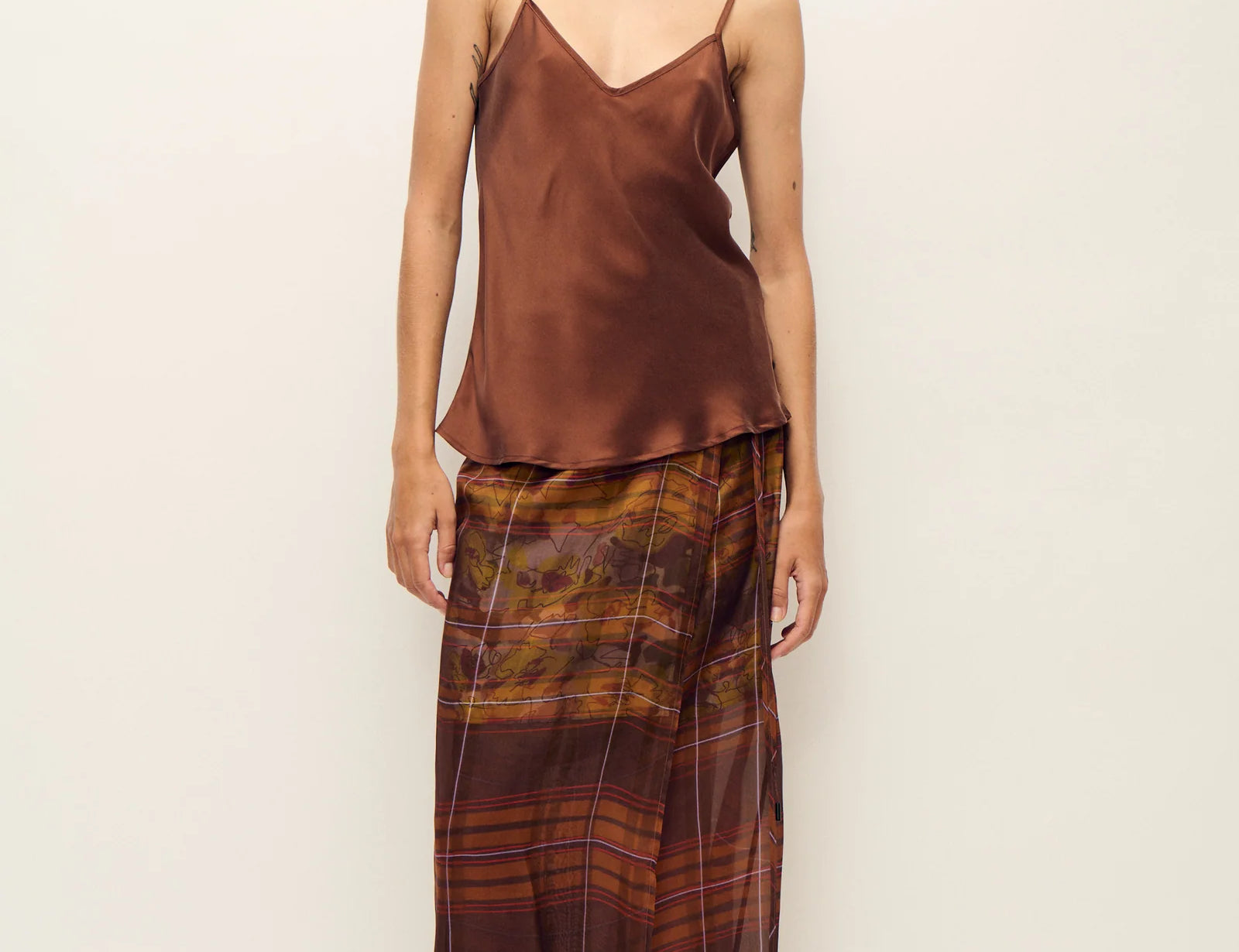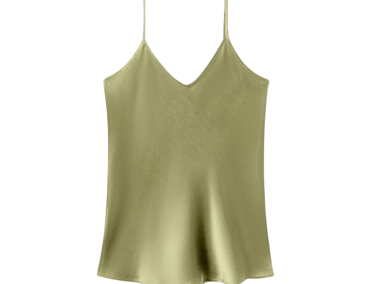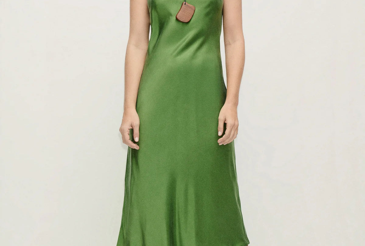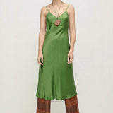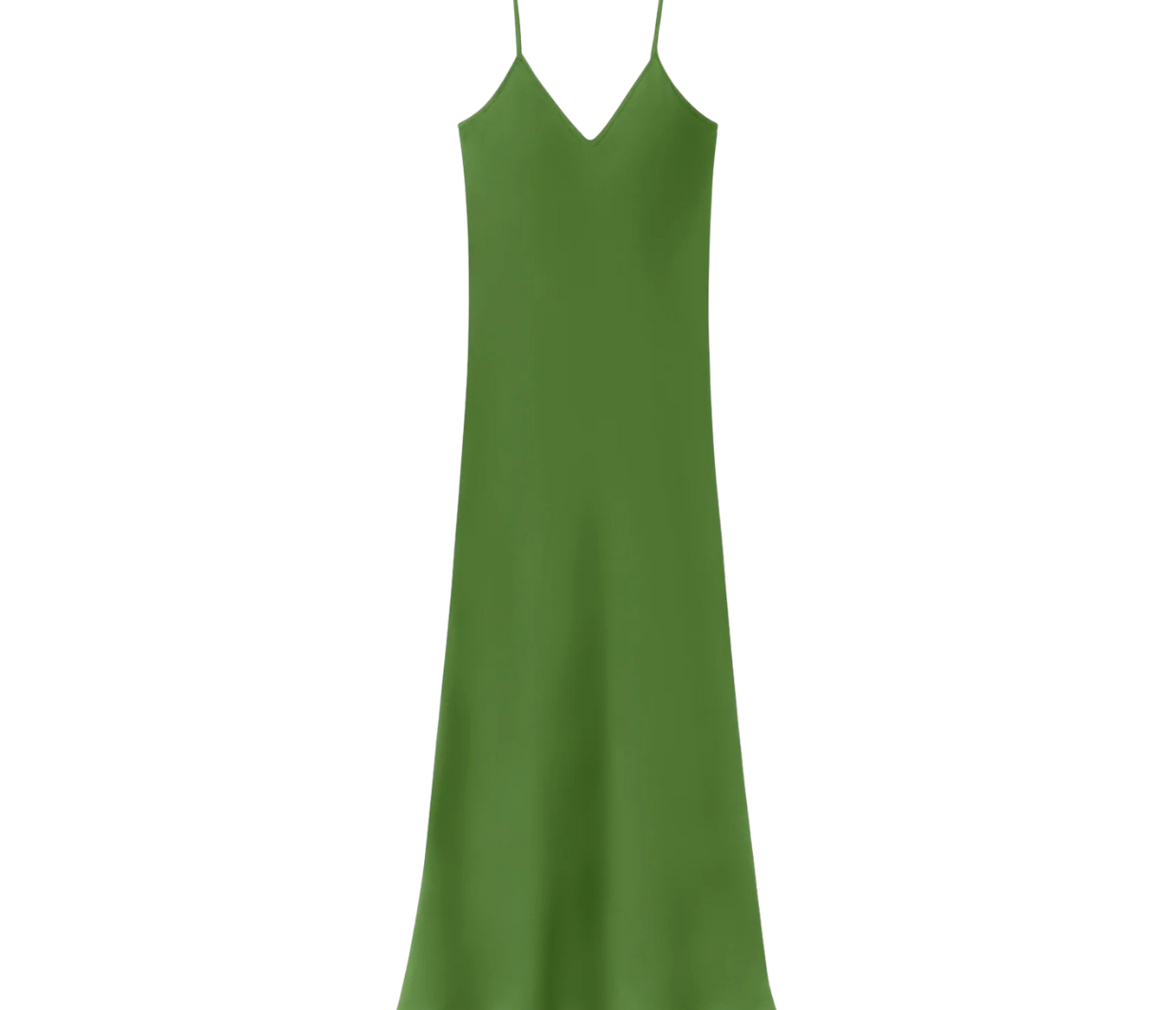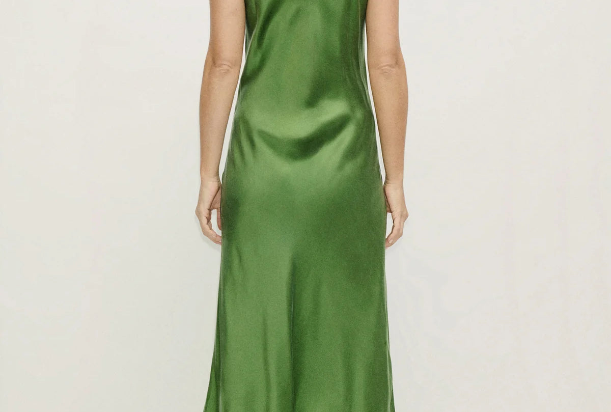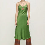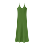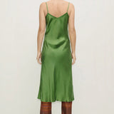 Introducing Silk Laundry's 90s Slip Dress Fields, a midi slip dress in green. Designed with a cut-bias silhouette in 100% silk, the 90s Slip Dress Fields features a V-neckline, adjustable spaghetti straps, and drapes to ankle length.