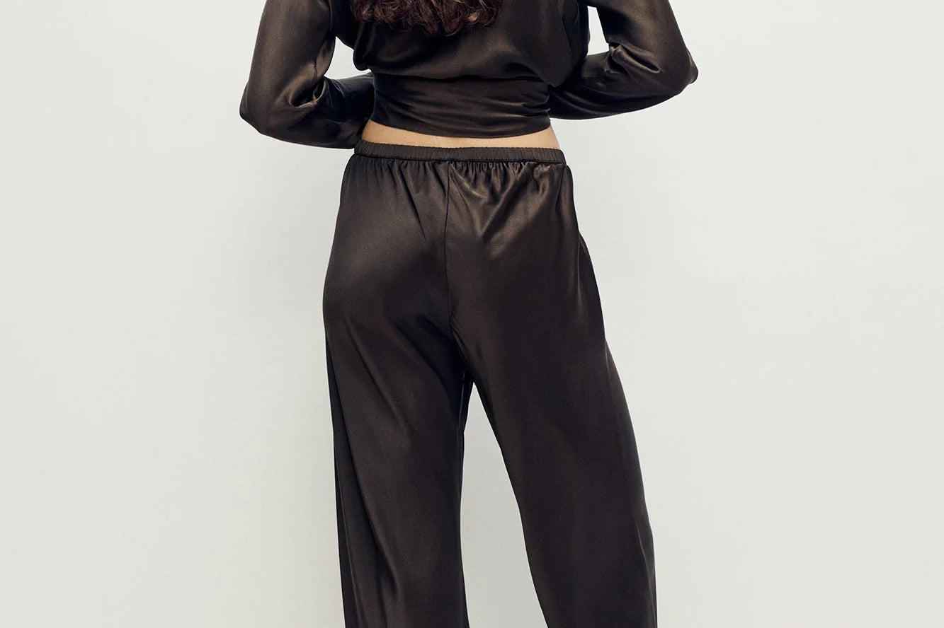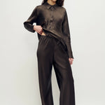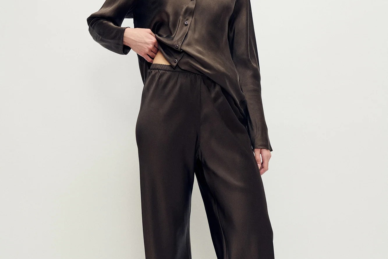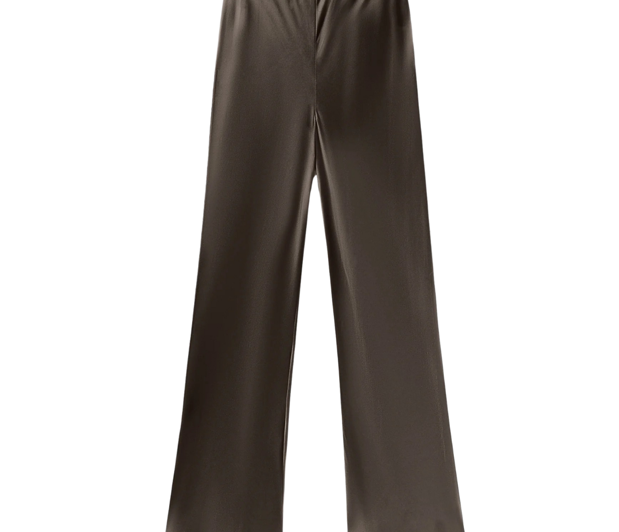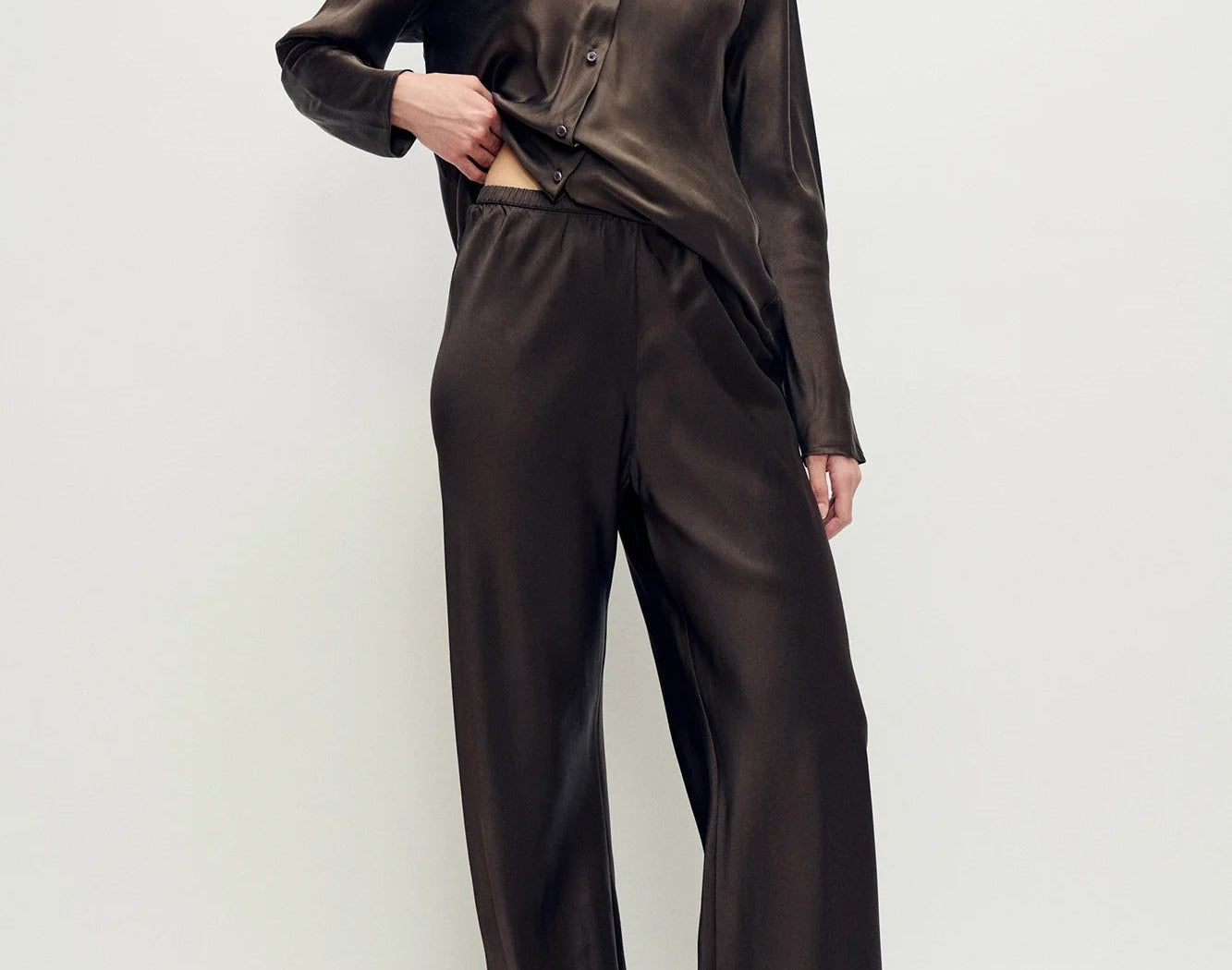Introducing Silk Laundry's Bias Cut Pants in Mantis, a straight-leg pant silhouette in a brown mantis hue. Crafted with a smooth sheen finish and cut on the bias, these pants offer an elegant drape and an ultra-soft feel against the skin. The bias cut pant creates a flattering, flowy movement, perfect for both day and evening wear.